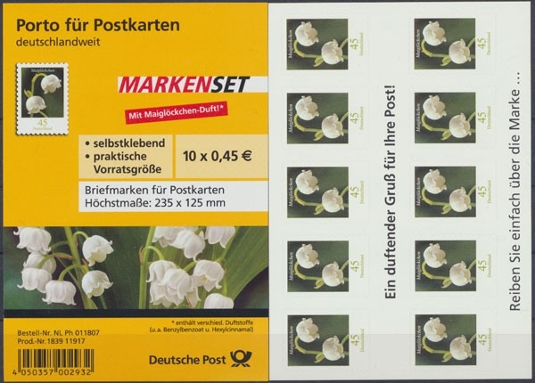 10 x 45 Cent Maiglöckchen, Marken mit Duftdruck, Folienblatt.