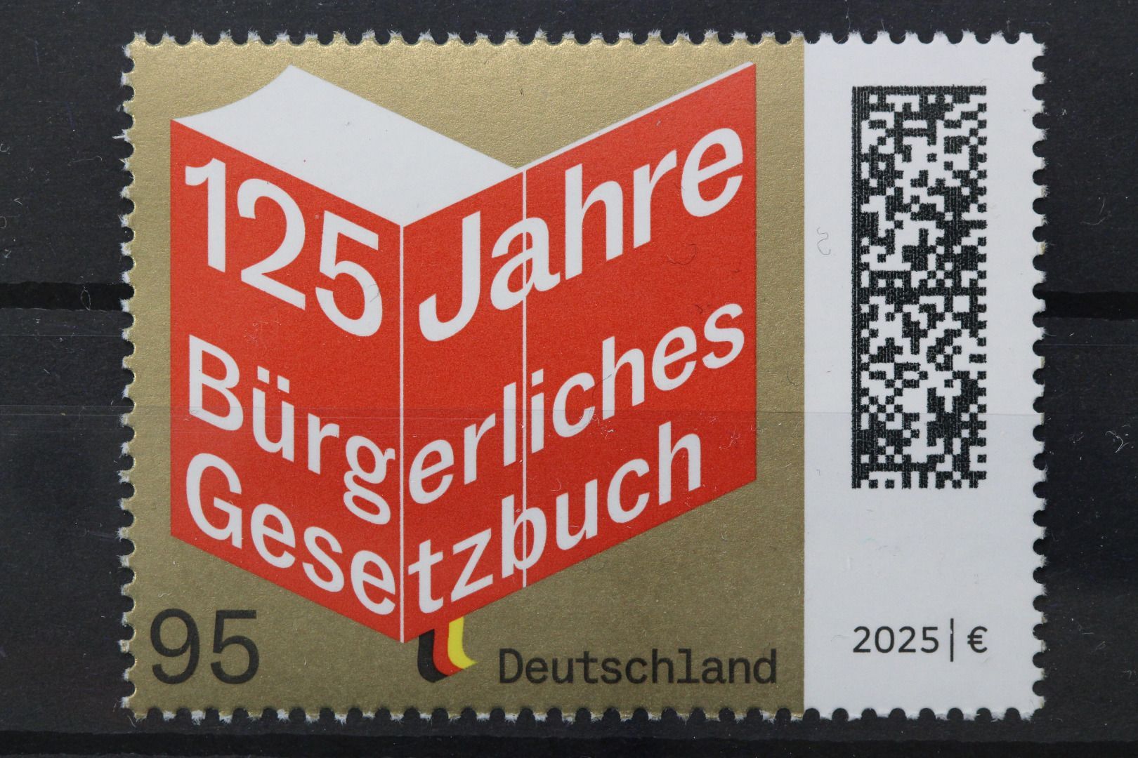 125 Jahre Bürgerliches Gesetzbuch: Bürgerliches Gesetzbuch mit rotem Einband und Lesebändchen in Landesfarben auf goldenem Grund