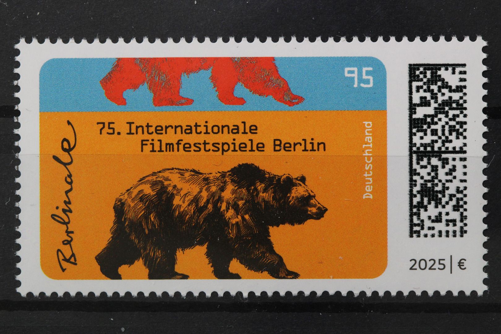75. Internationale Filmfestspiele Berlin: Berliner Wappentier Braunbär (Ursus arctos) auf farbigem Filmstreifen