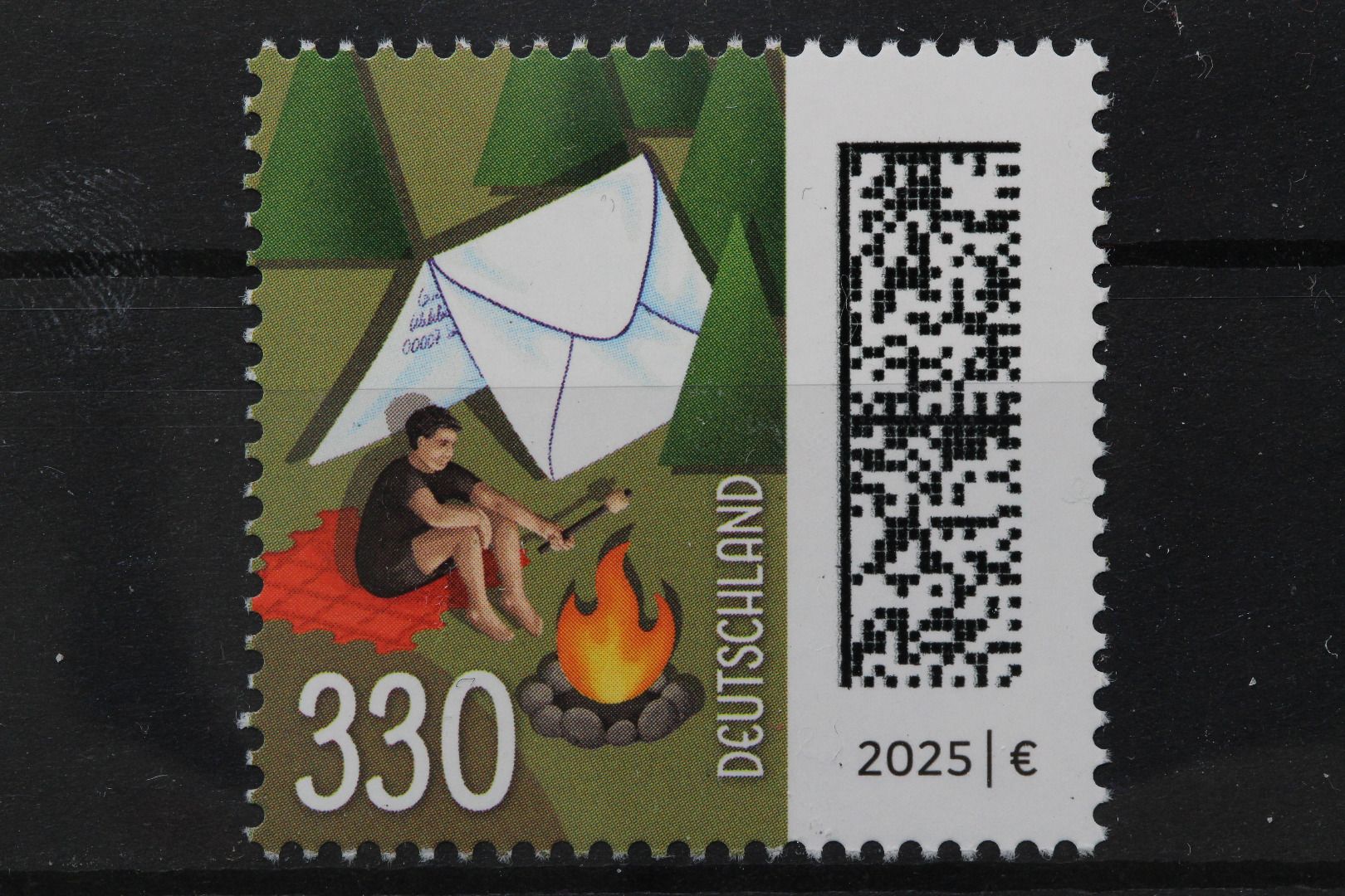 Freimarke: Welt der Briefe (XXVII): Camper am Lagerfeuer mit Briefmarkendecke und Briefzelt