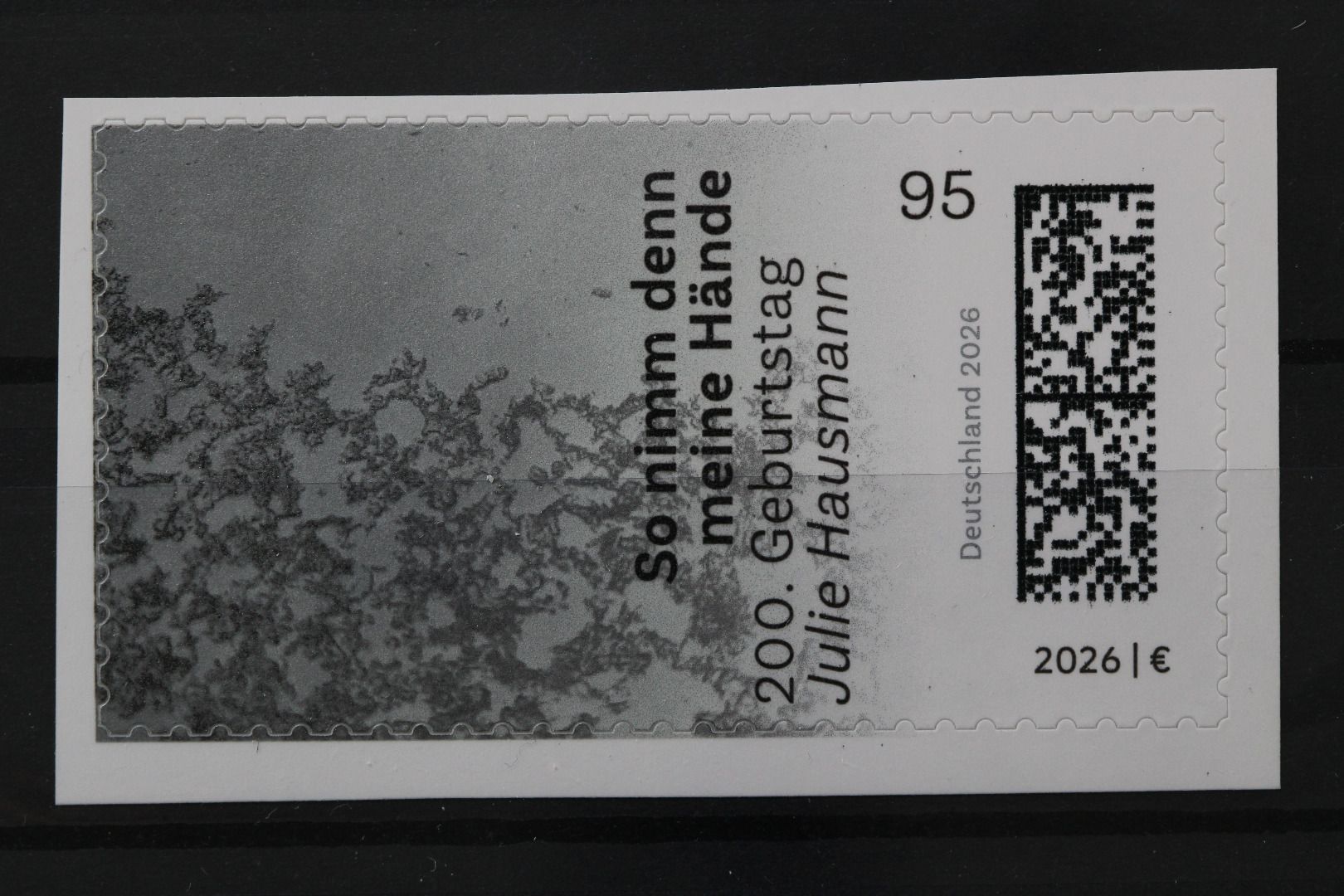 200. Geburtstag von Julie Hausmann. Eisblumenmuster, Liedzeile von Julie Katharina Johanna Hausmann (1826–1901), deutsche Erzieherin und Dichterin geistlicher Lieder. Marke aus dem Folienblatt 156.