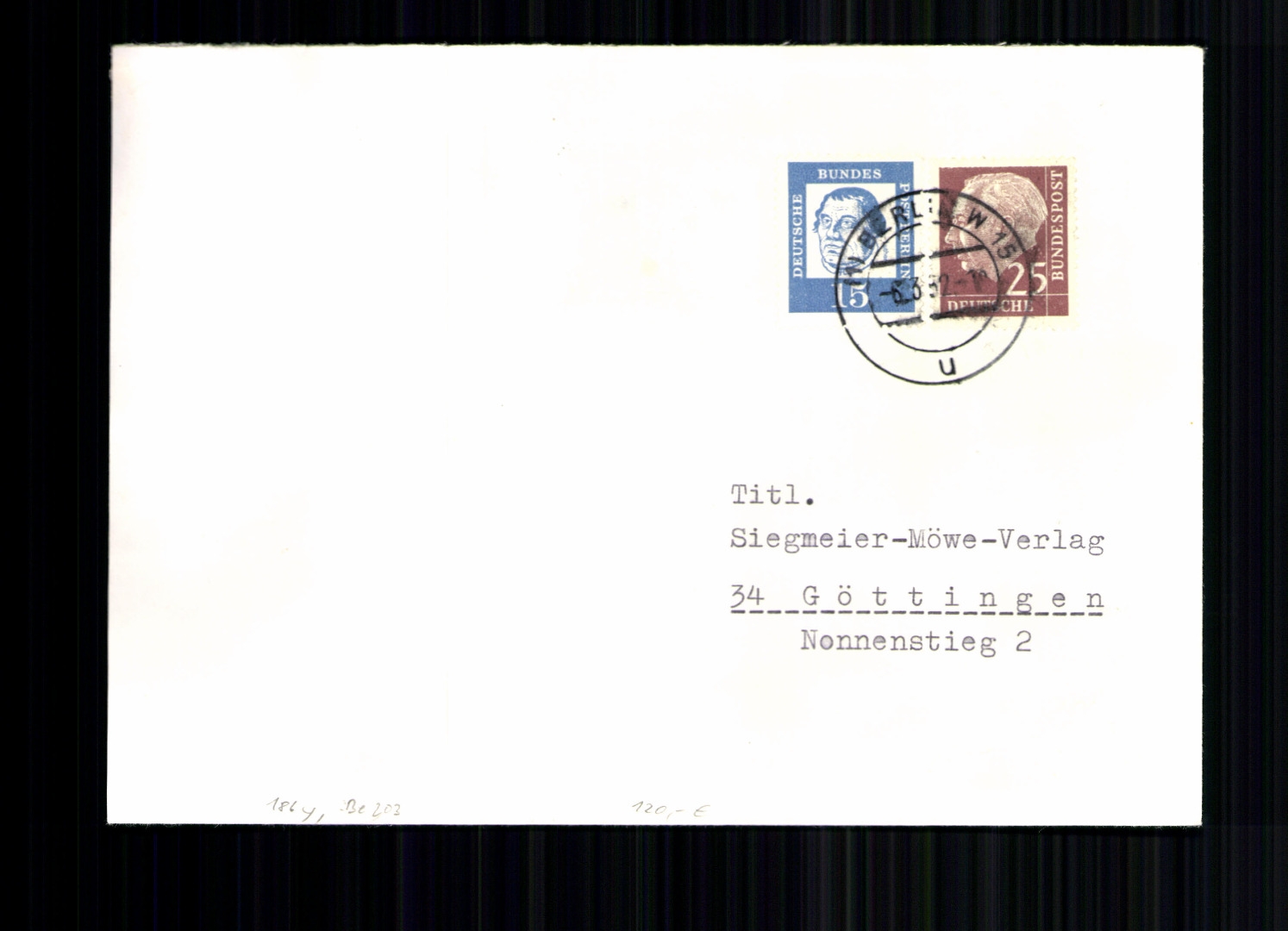 25 Pf. Heuss fluoreszierendes Papier mit Zusatzfrankatur 15 Pf. Bedeutende Deutsche in y-Papier. Oben geöffneter Bedarfsbrief von Berlin nach Göttingen gelaufen. Vorne links neben den Briefmarken einige kleine helle Stellen.