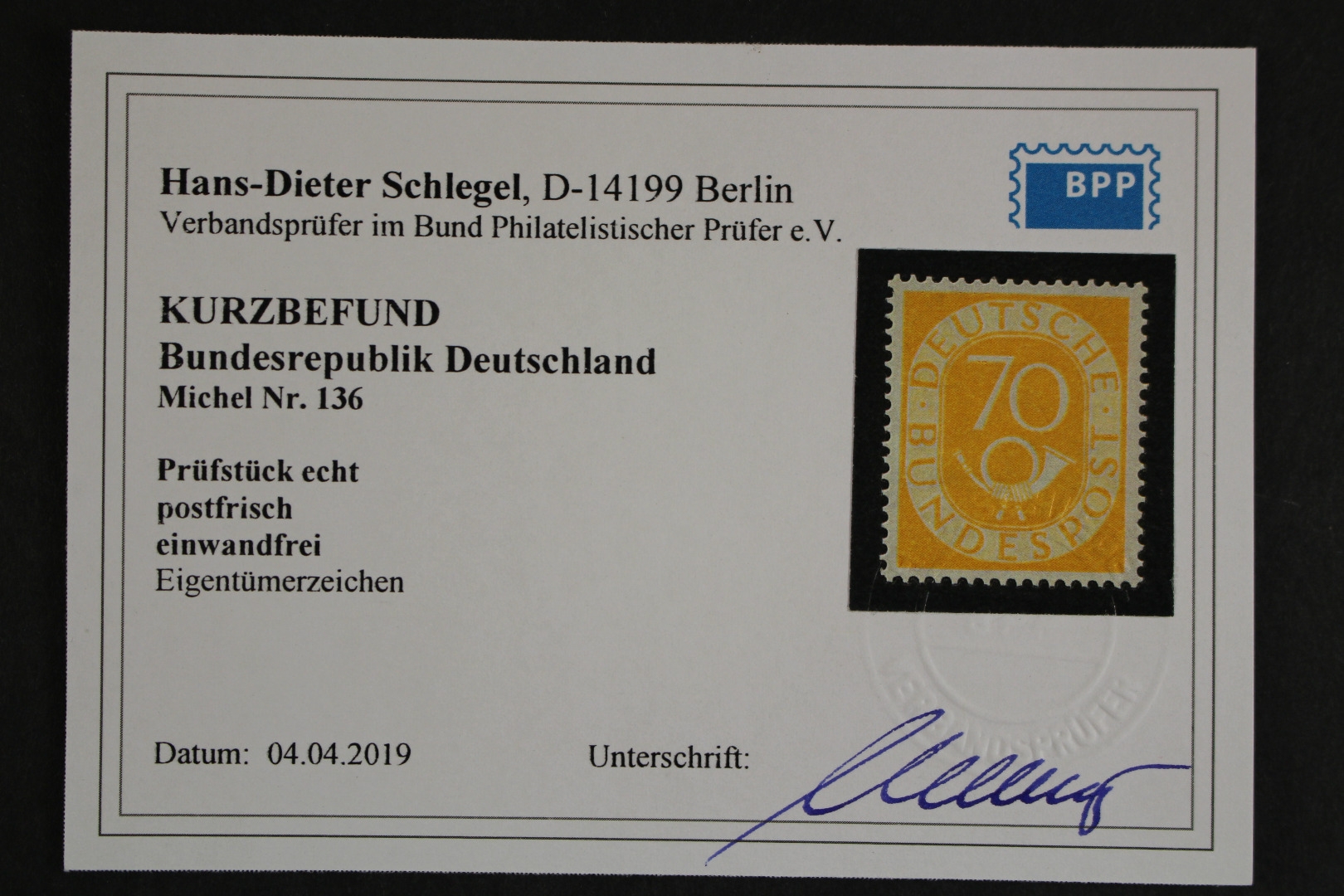 70 Pf. Posthorn, signiert, einwandfreie Erhaltung. Kurzbefund Schlegel (4/2019).