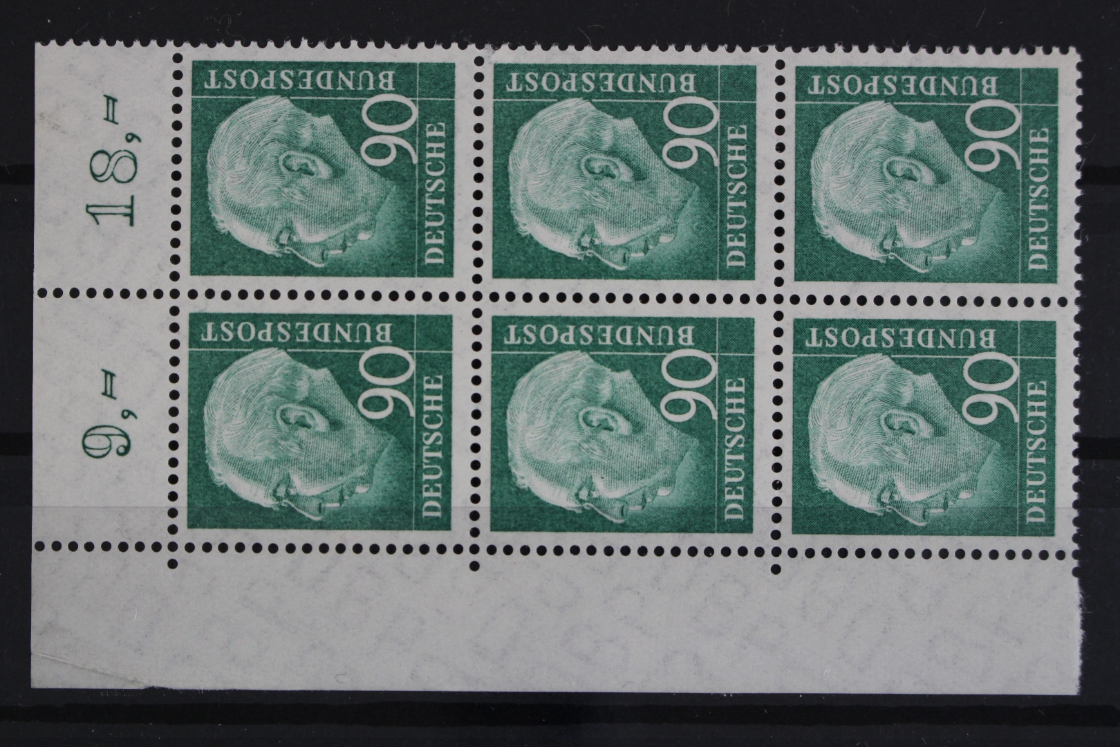 90 Pf. Heuss, geriffelte Gummierung, Ecke mit einem Knick, senkrecht minimal angefaltet.