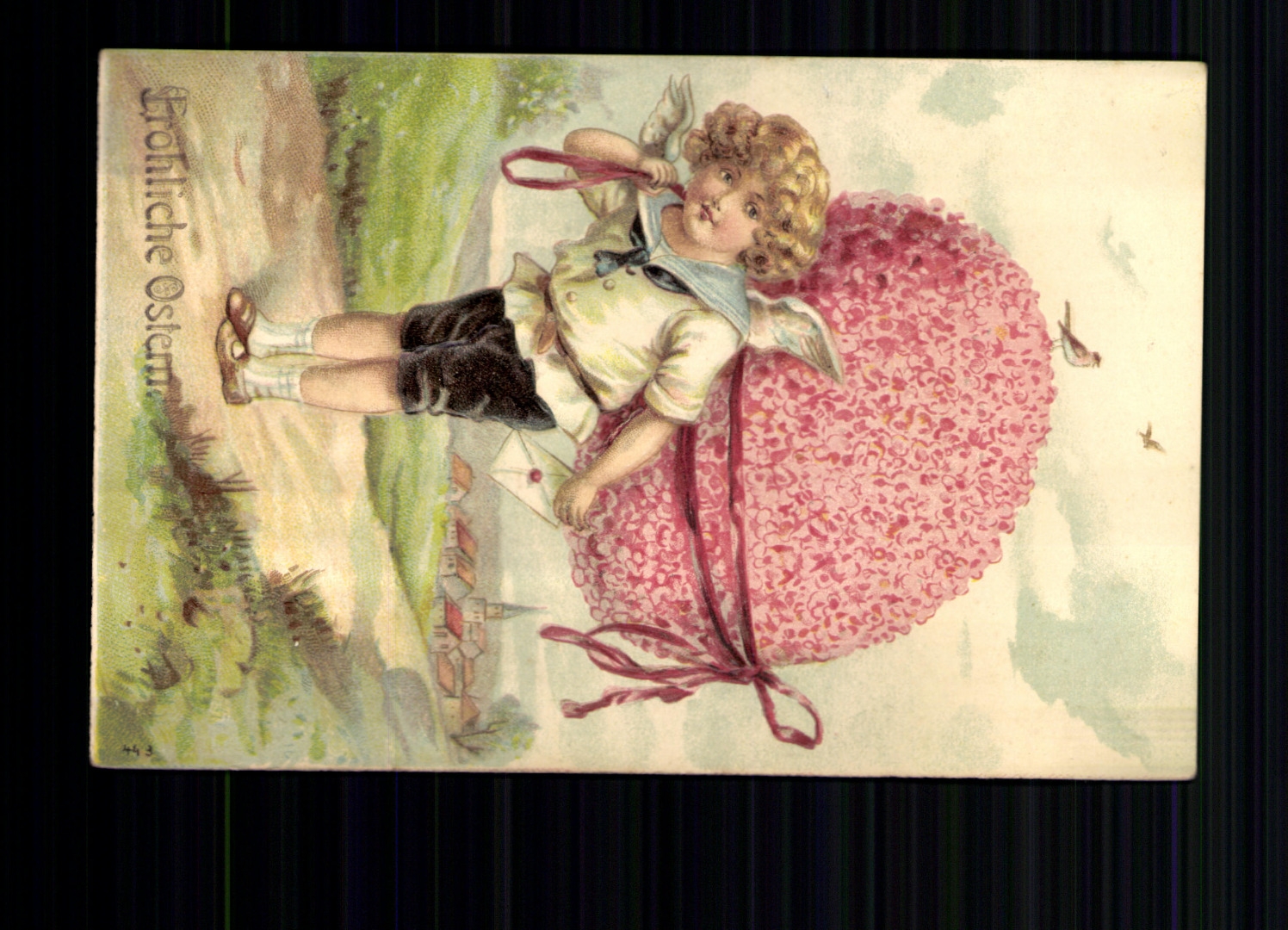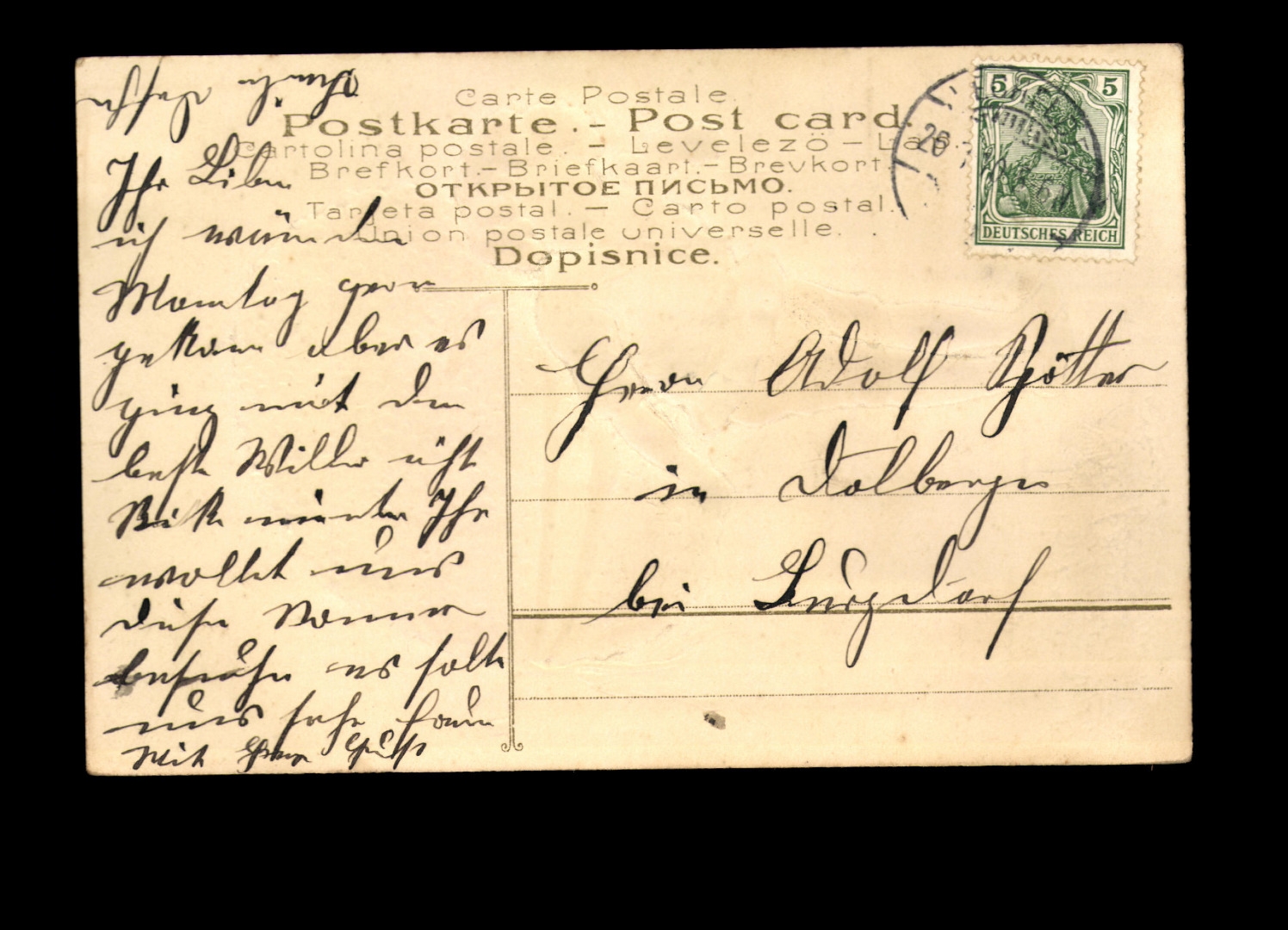 Prägekarte, gelaufen, Ecken bestoßen, leicht fleckig.