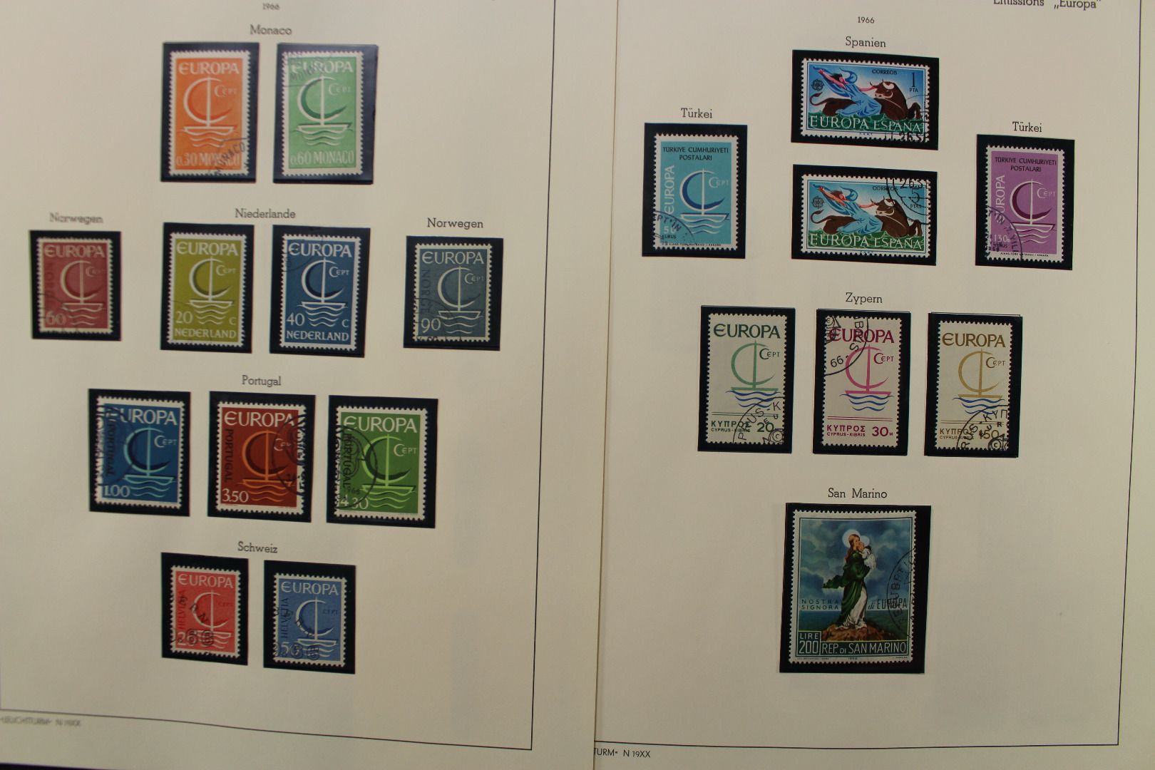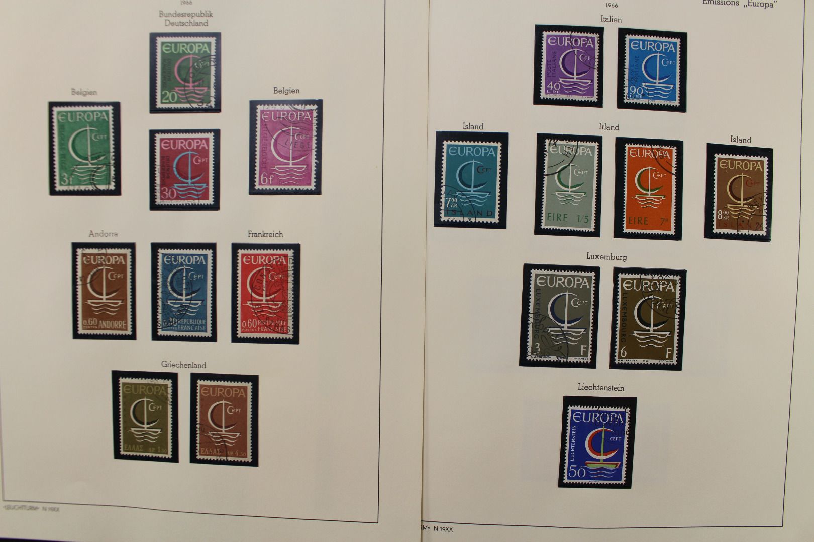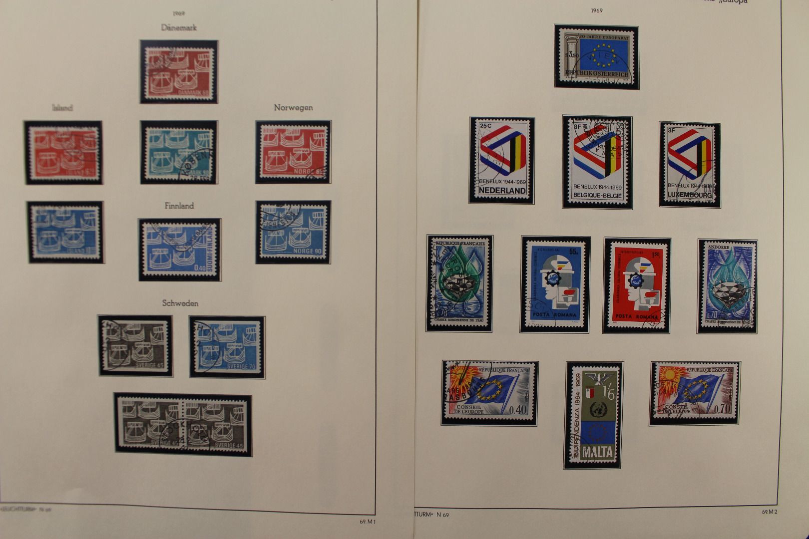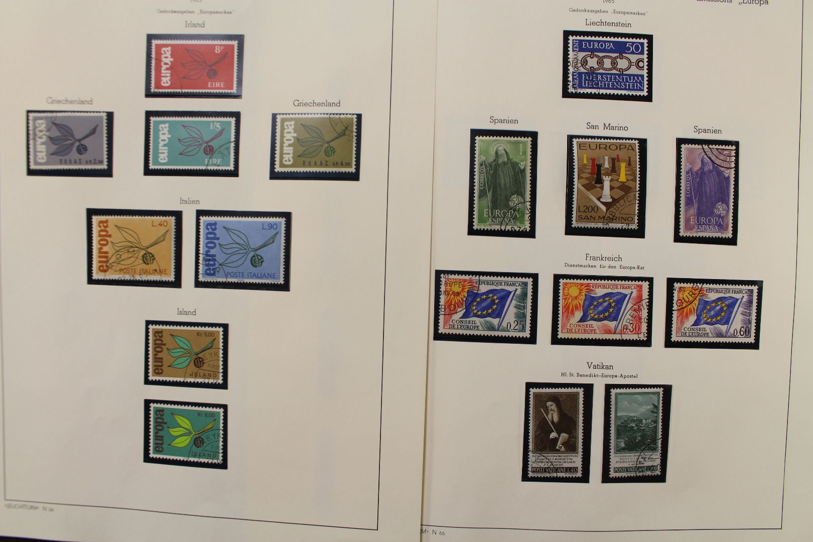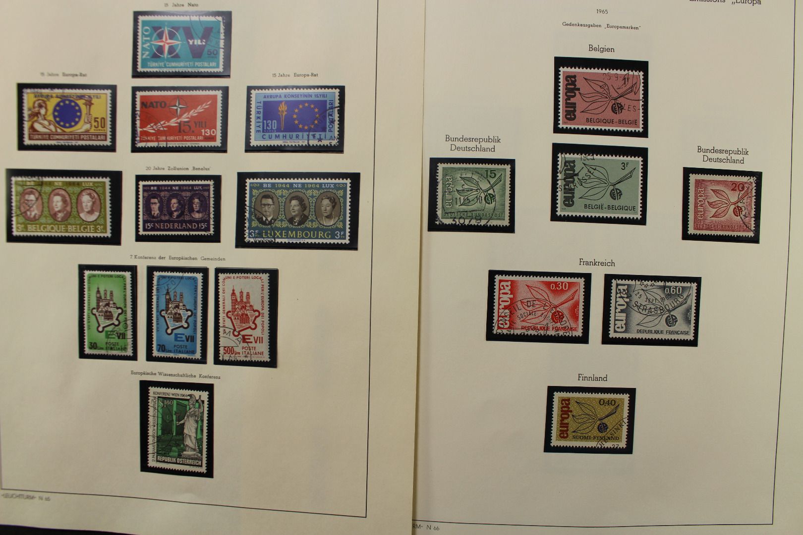 Umfangreiche Teilsammlung in überwiegend guter Qualität, teils etwas unterschiedlich. Es fehlen u.a. Luxemburg 1956 + 1957 u. Spanisch Andorra 1972. Zusätzlich sind viele Mitläufer und andere Nebengebiete enthalten. Untergebracht in einem alten Leuchtturm Vordruckalbum mit überwiegend schwarzen Klemmtaschen mit Klemmbinder.
