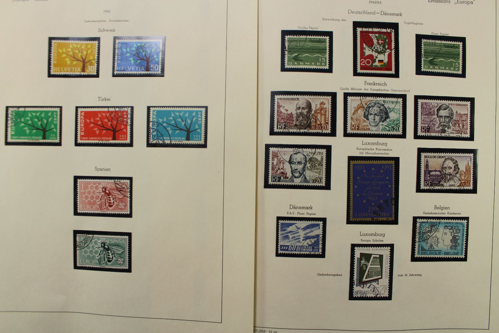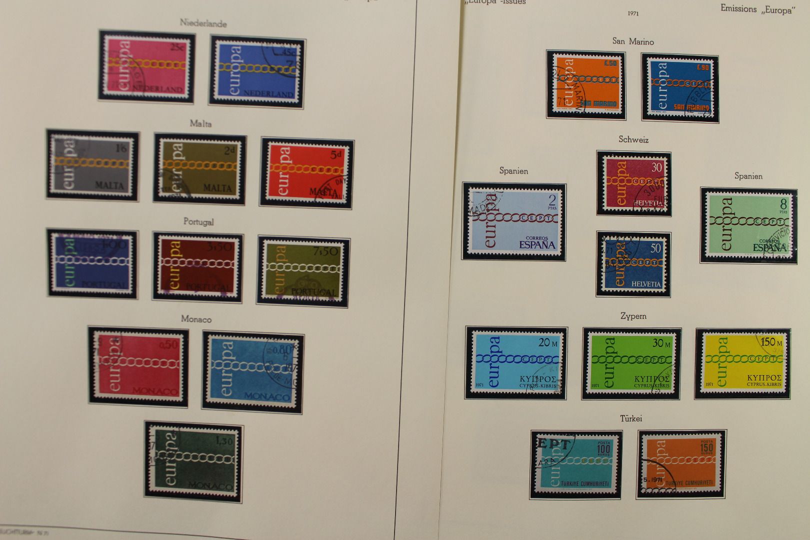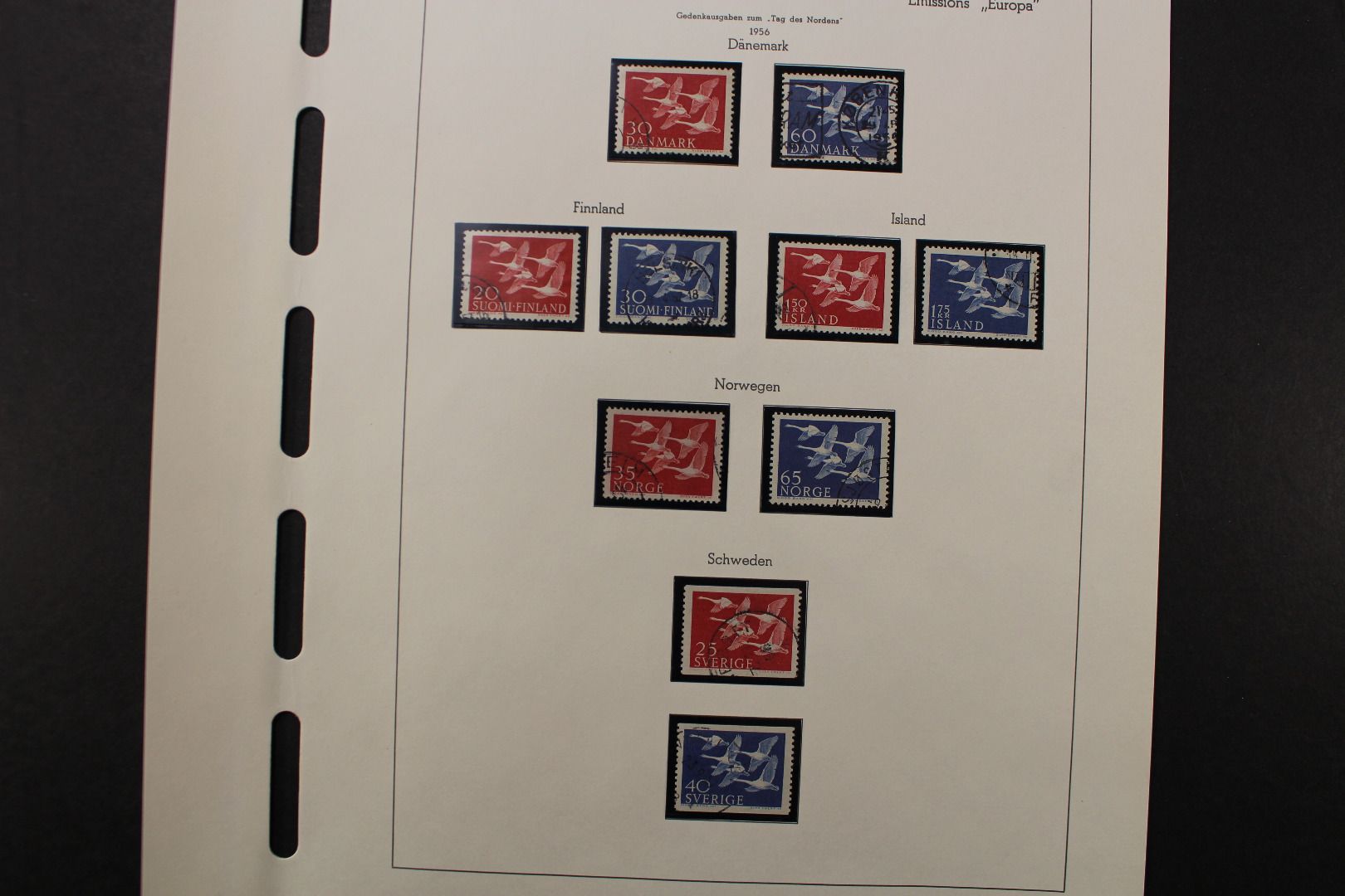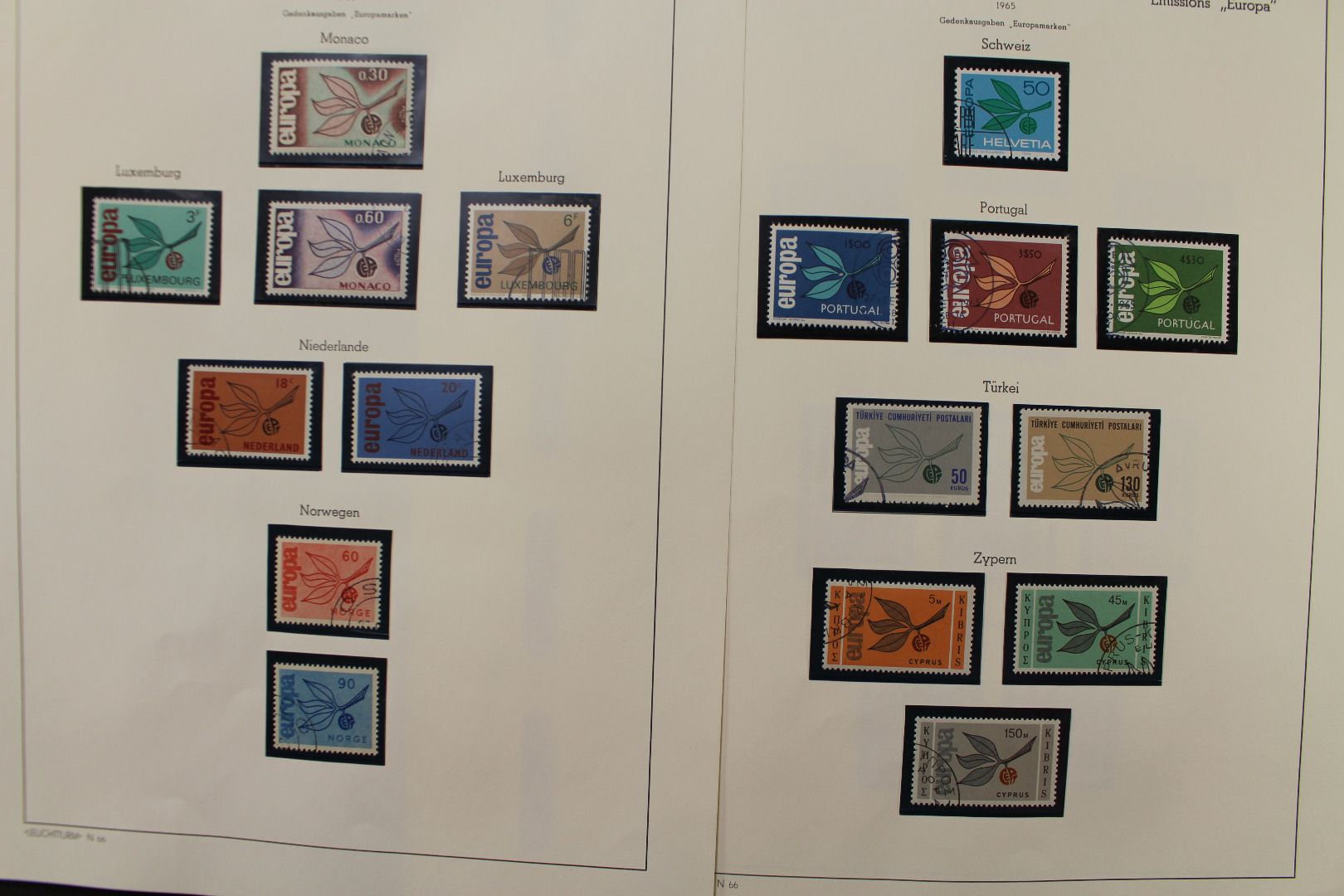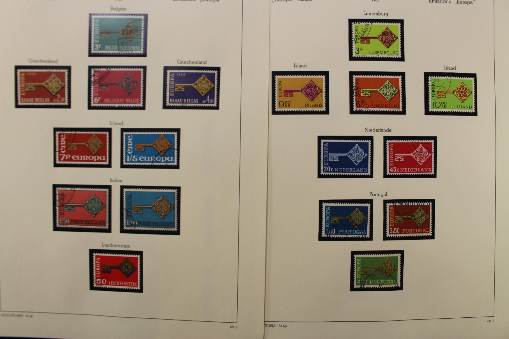 Umfangreiche Teilsammlung in überwiegend guter Qualität, teils etwas unterschiedlich. Es fehlen u.a. Luxemburg 1956 + 1957 u. Spanisch Andorra 1972. Zusätzlich sind viele Mitläufer und andere Nebengebiete enthalten. Untergebracht in einem alten Leuchtturm Vordruckalbum mit überwiegend schwarzen Klemmtaschen mit Klemmbinder.