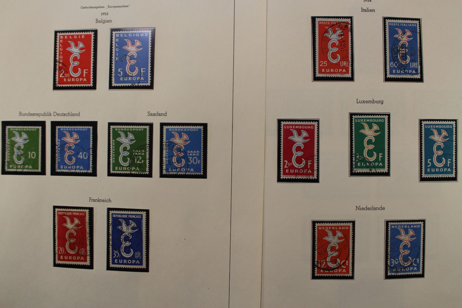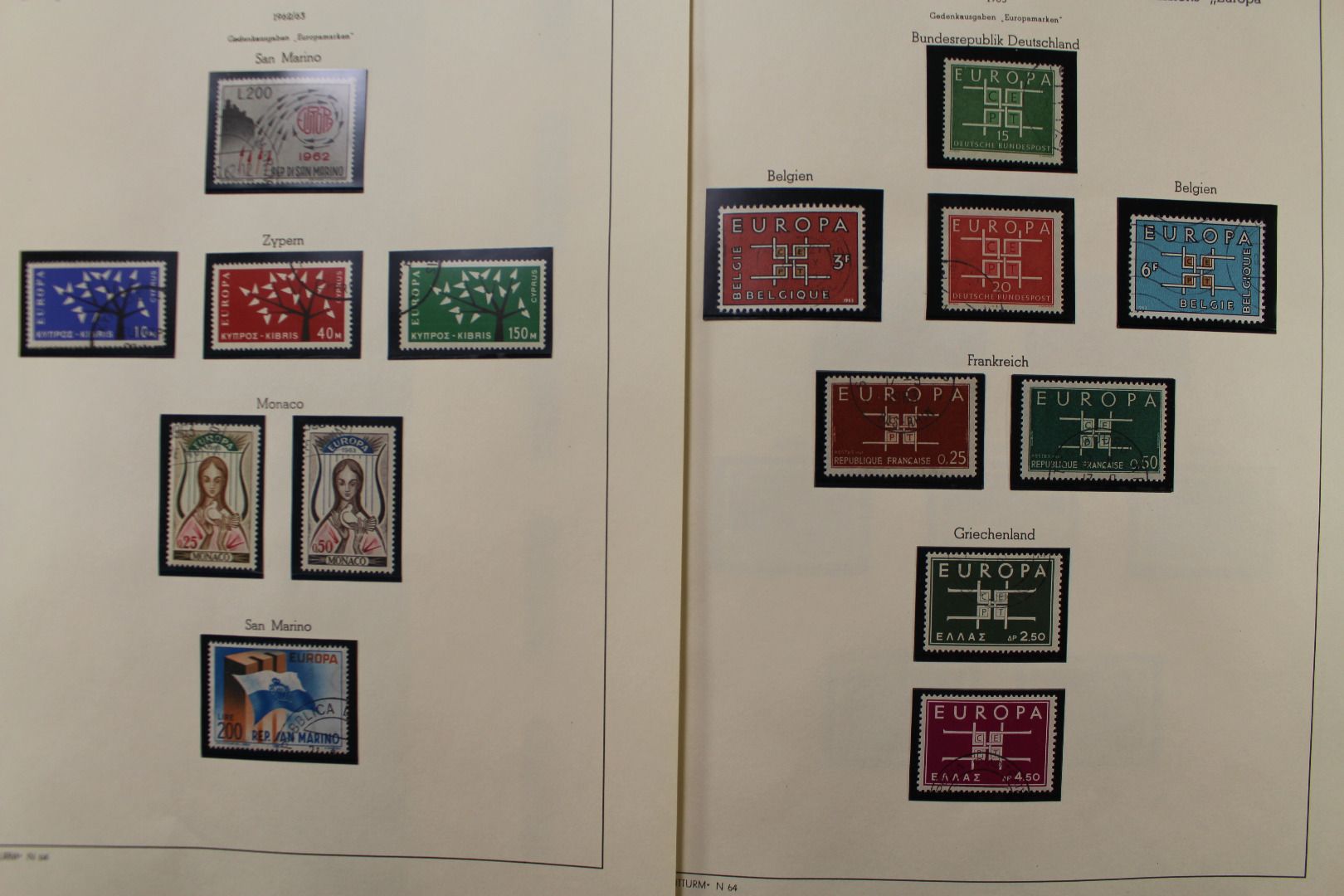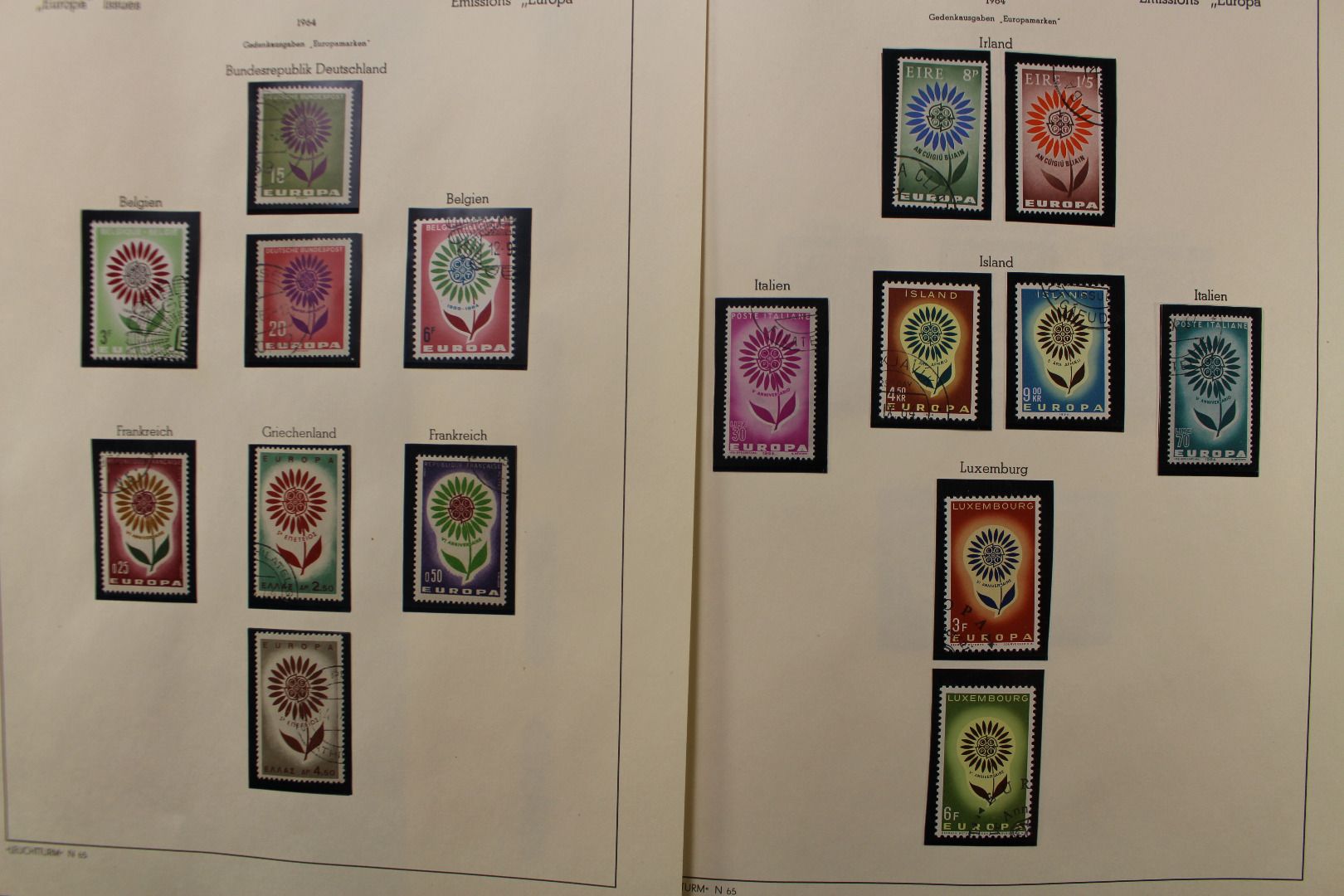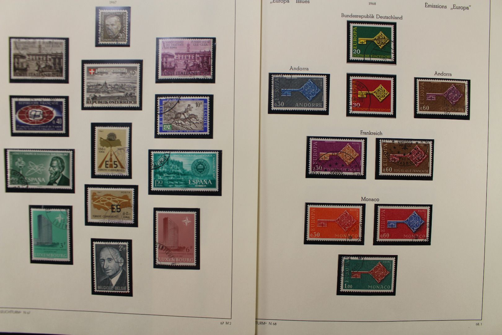 Umfangreiche Teilsammlung in überwiegend guter Qualität, teils etwas unterschiedlich. Es fehlen u.a. Luxemburg 1956 + 1957 u. Spanisch Andorra 1972. Zusätzlich sind viele Mitläufer und andere Nebengebiete enthalten. Untergebracht in einem alten Leuchtturm Vordruckalbum mit überwiegend schwarzen Klemmtaschen mit Klemmbinder.