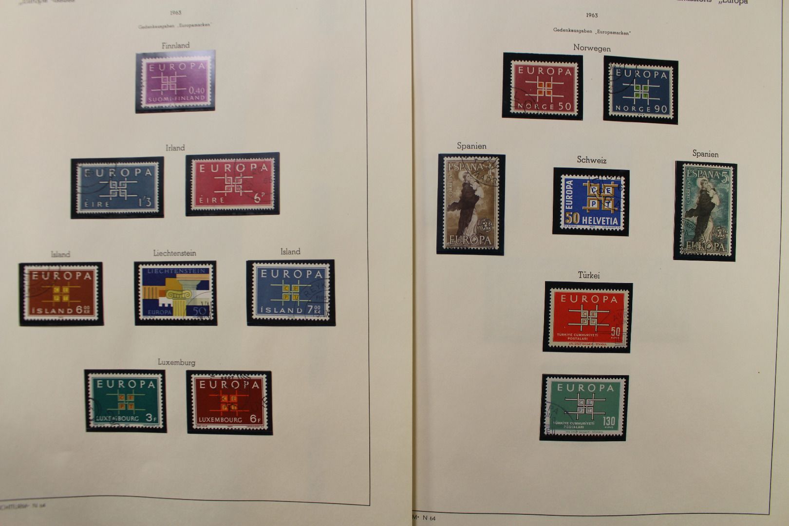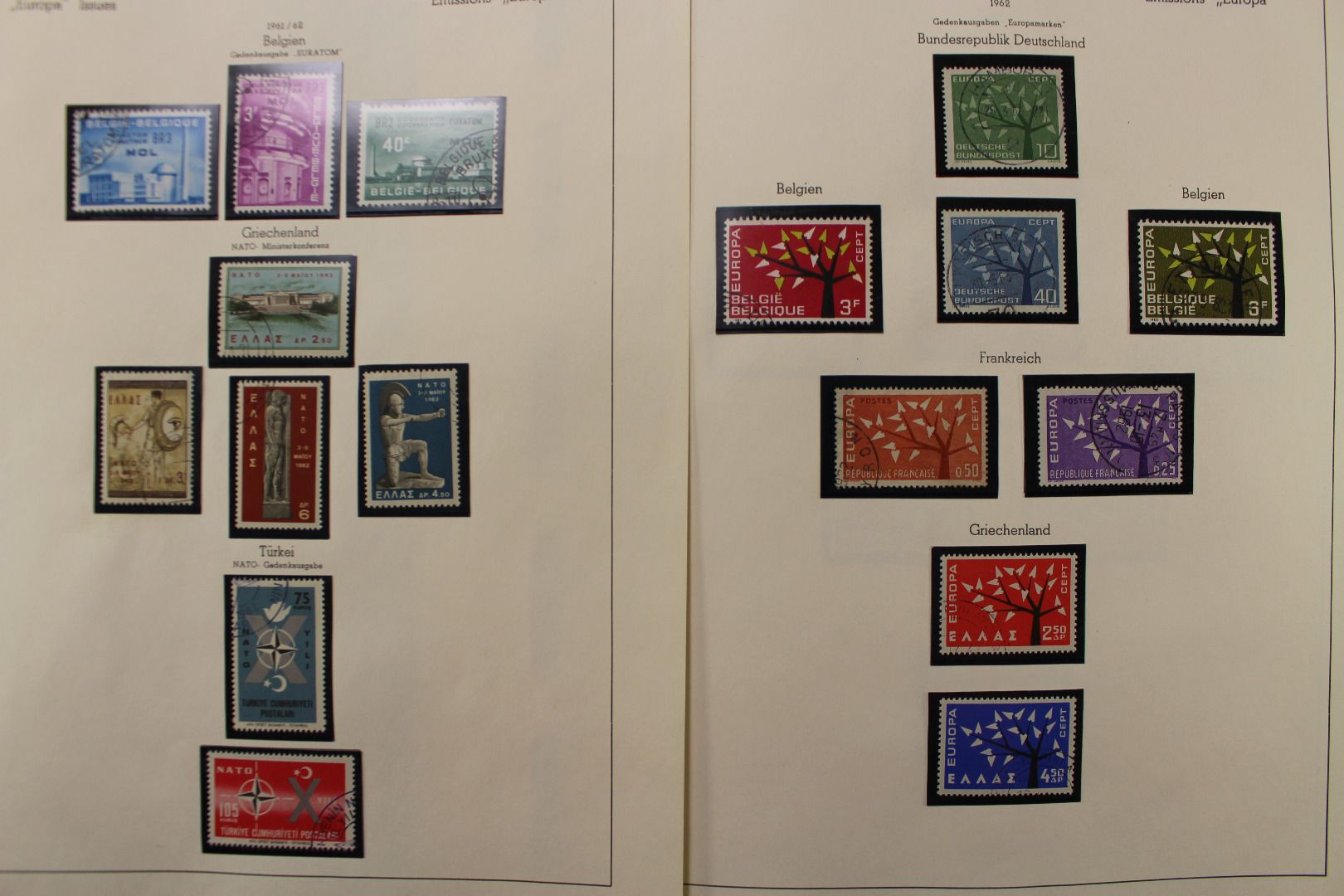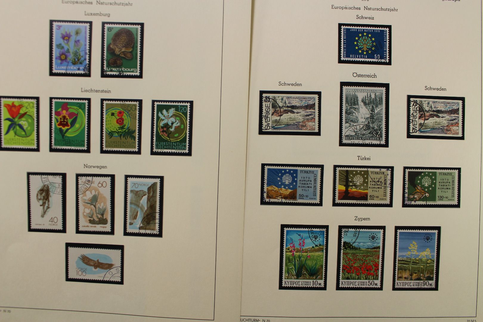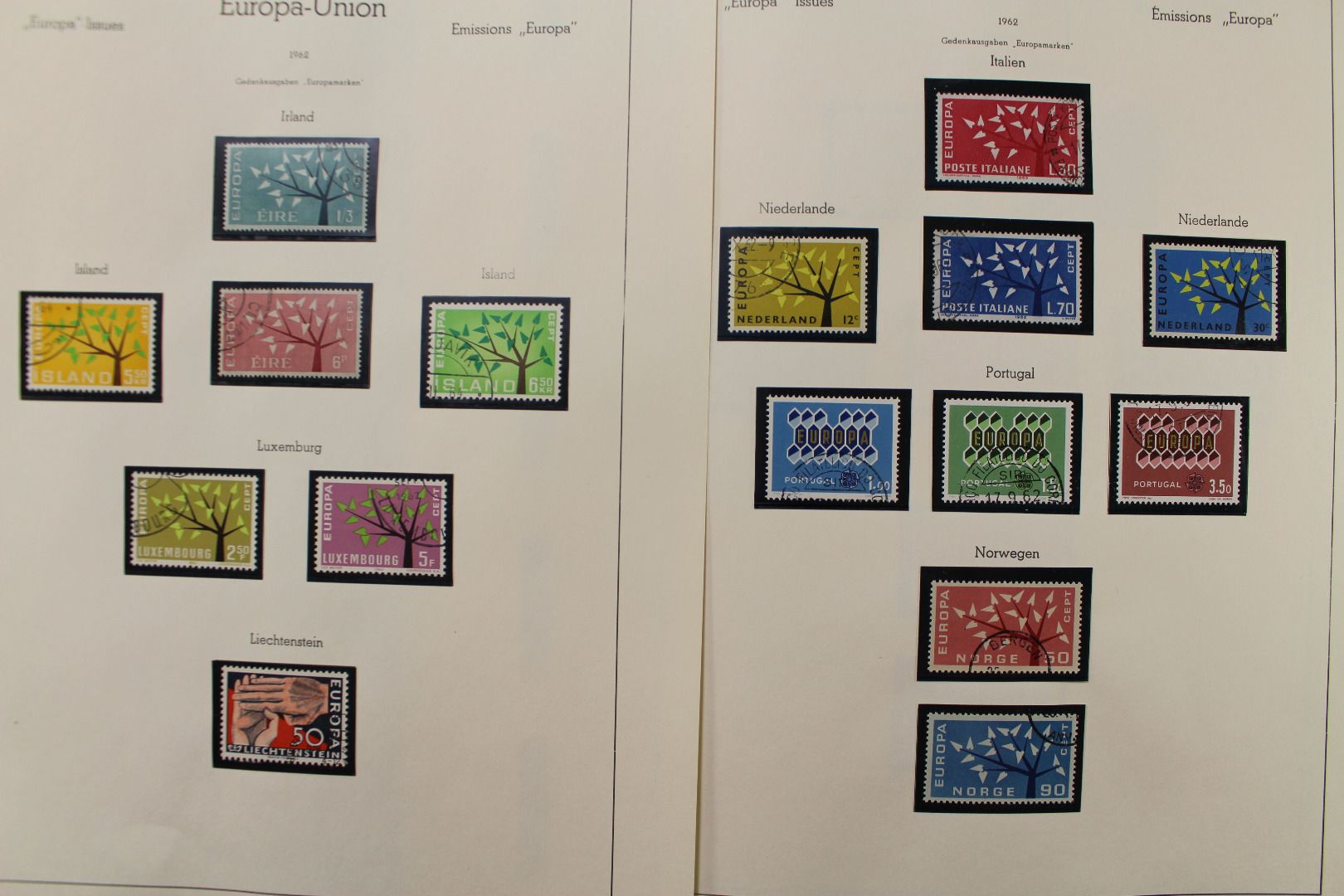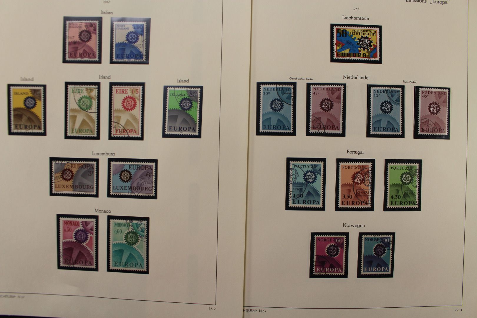 Umfangreiche Teilsammlung in überwiegend guter Qualität, teils etwas unterschiedlich. Es fehlen u.a. Luxemburg 1956 + 1957 u. Spanisch Andorra 1972. Zusätzlich sind viele Mitläufer und andere Nebengebiete enthalten. Untergebracht in einem alten Leuchtturm Vordruckalbum mit überwiegend schwarzen Klemmtaschen mit Klemmbinder.