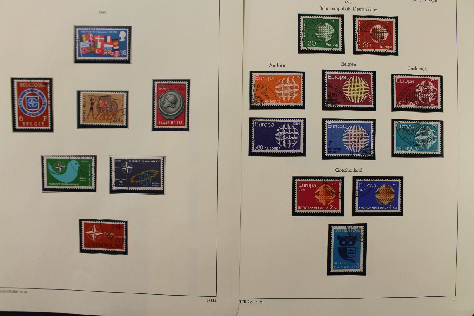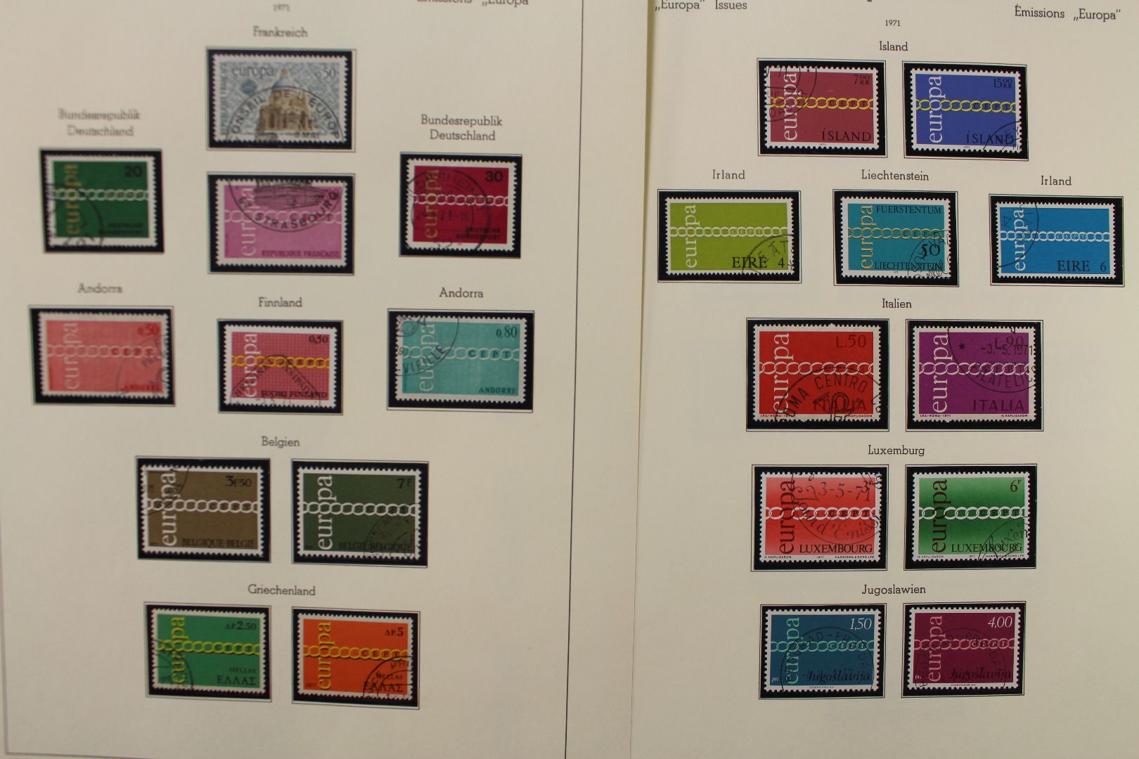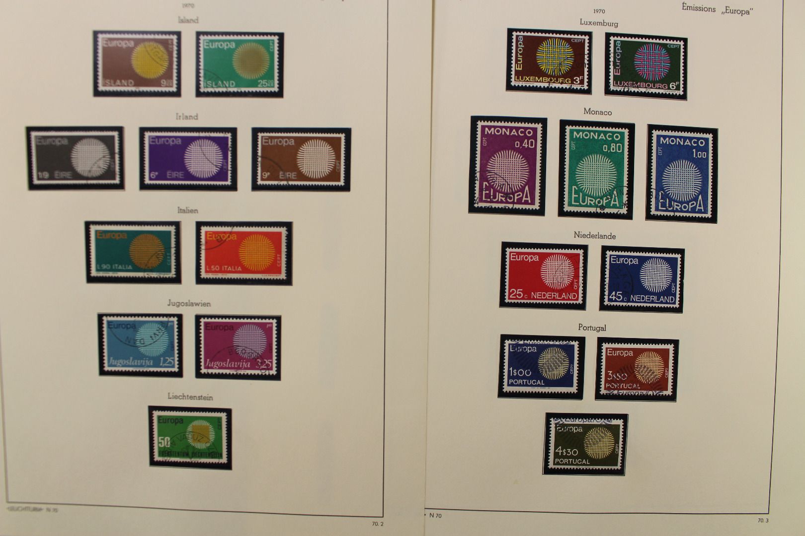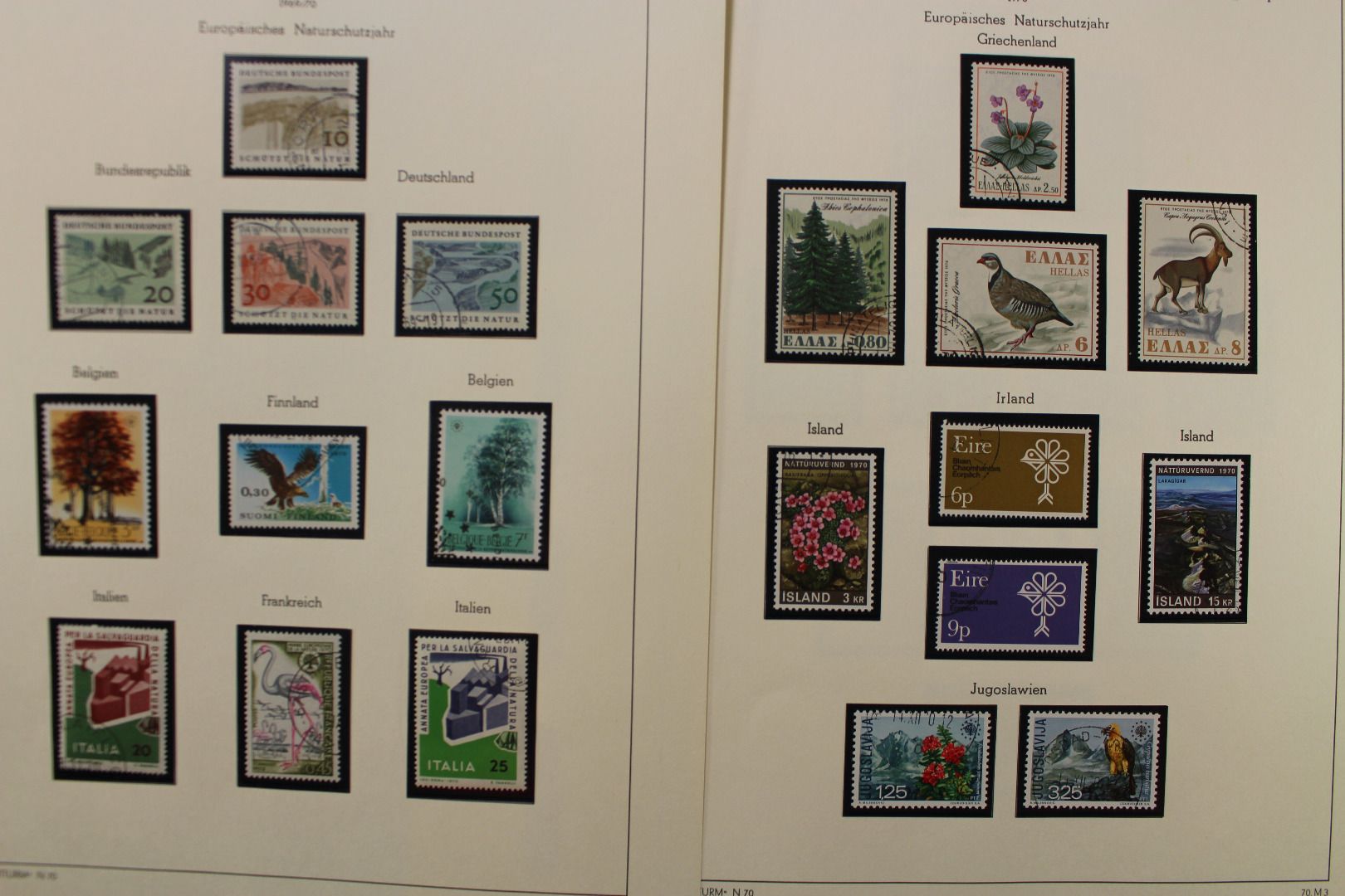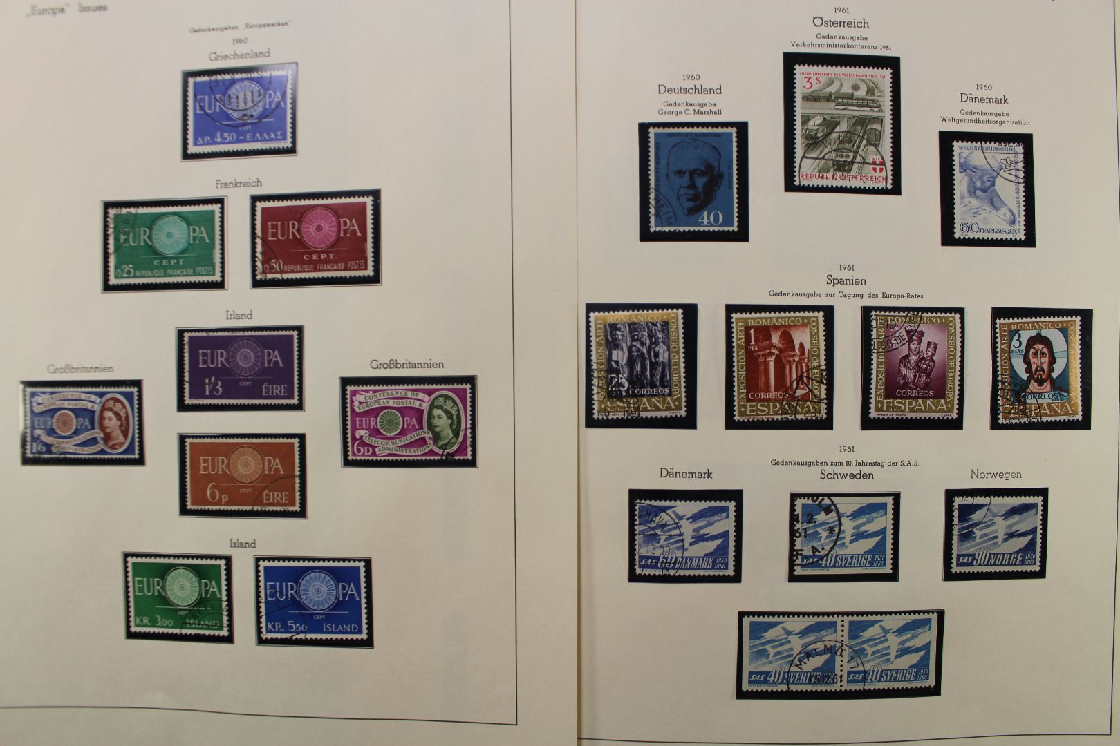 Umfangreiche Teilsammlung in überwiegend guter Qualität, teils etwas unterschiedlich. Es fehlen u.a. Luxemburg 1956 + 1957 u. Spanisch Andorra 1972. Zusätzlich sind viele Mitläufer und andere Nebengebiete enthalten. Untergebracht in einem alten Leuchtturm Vordruckalbum mit überwiegend schwarzen Klemmtaschen mit Klemmbinder.