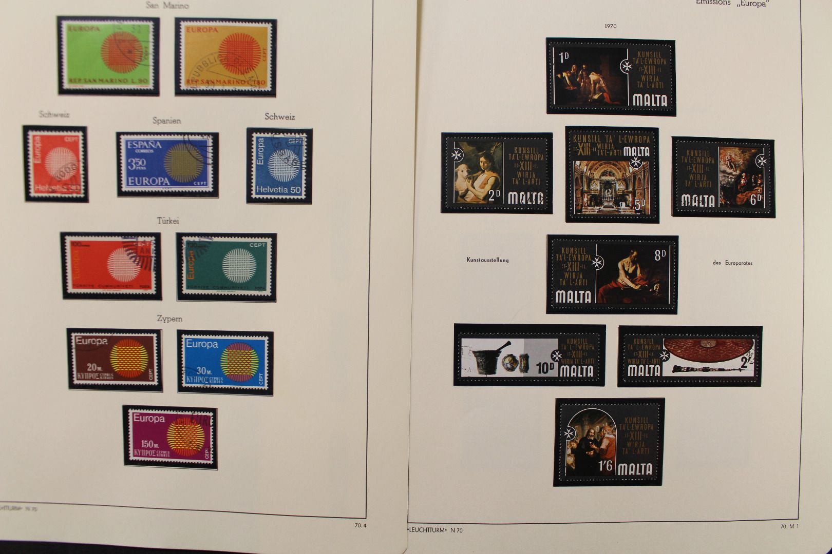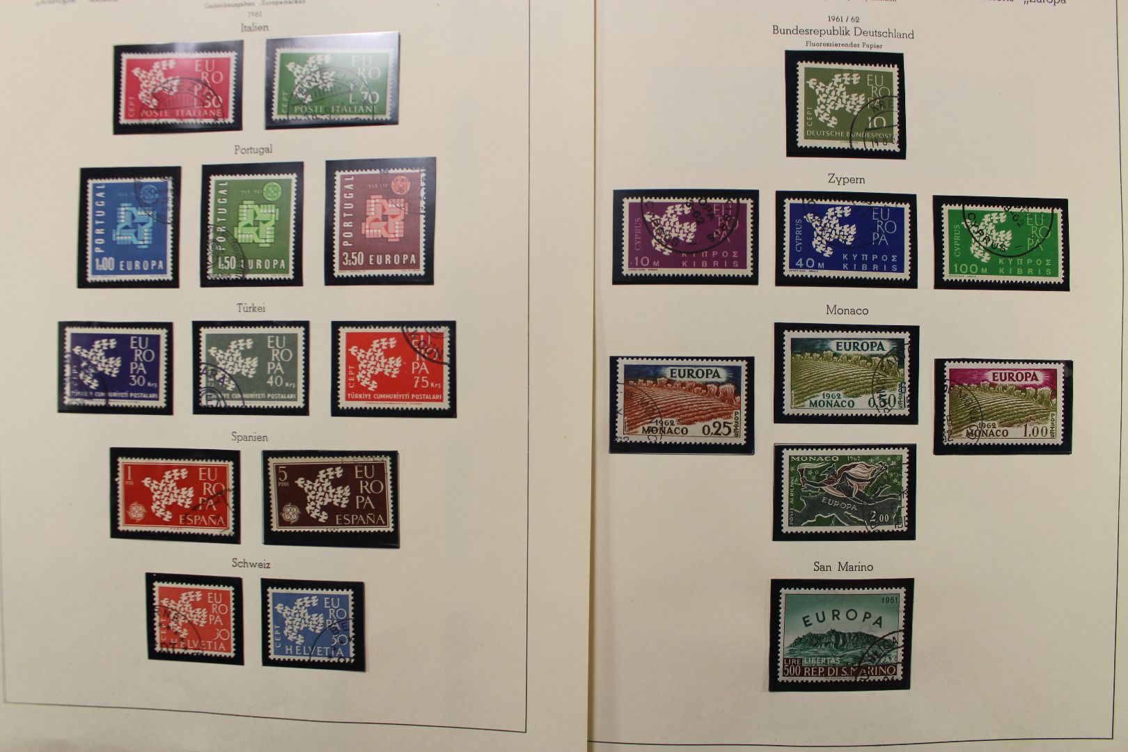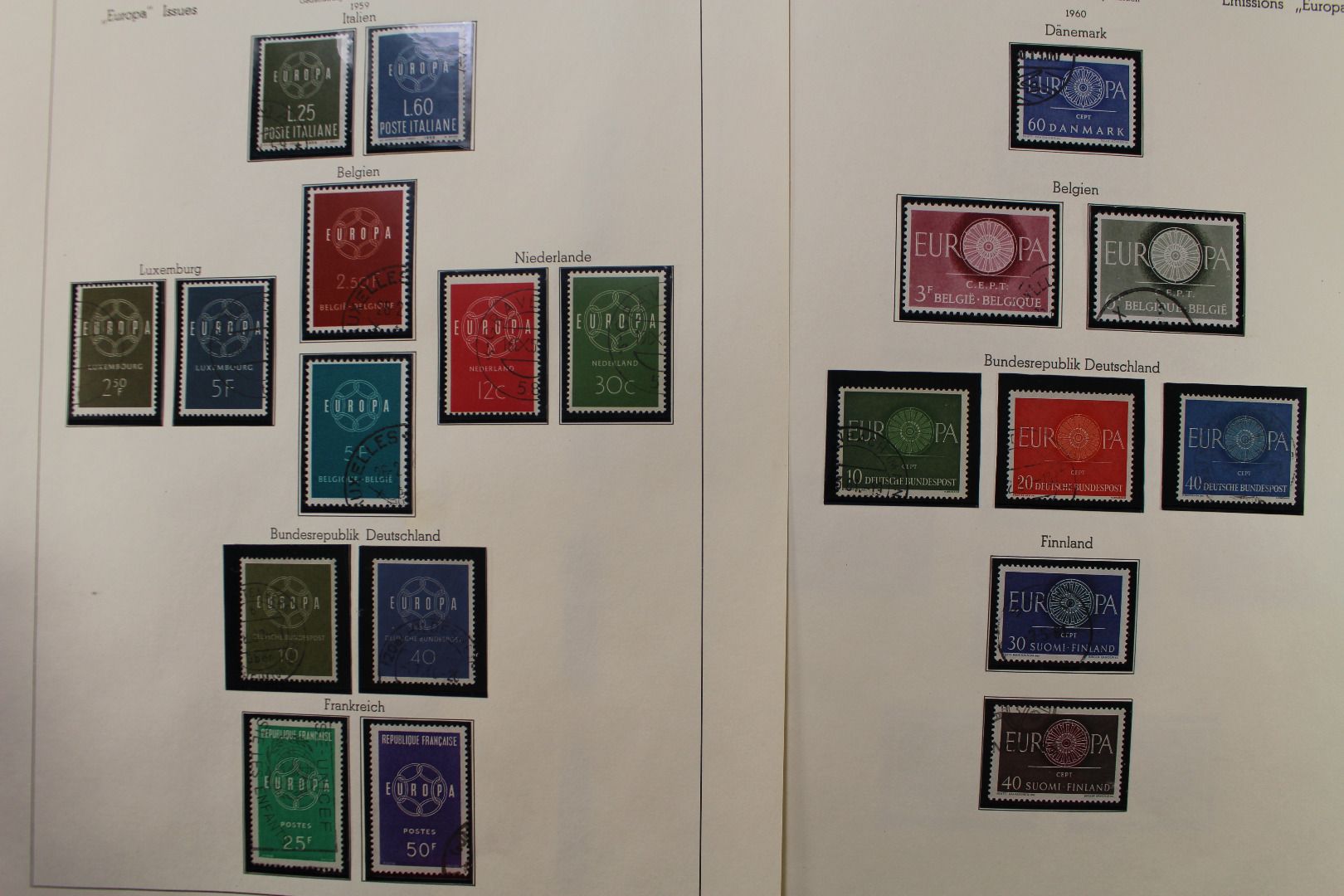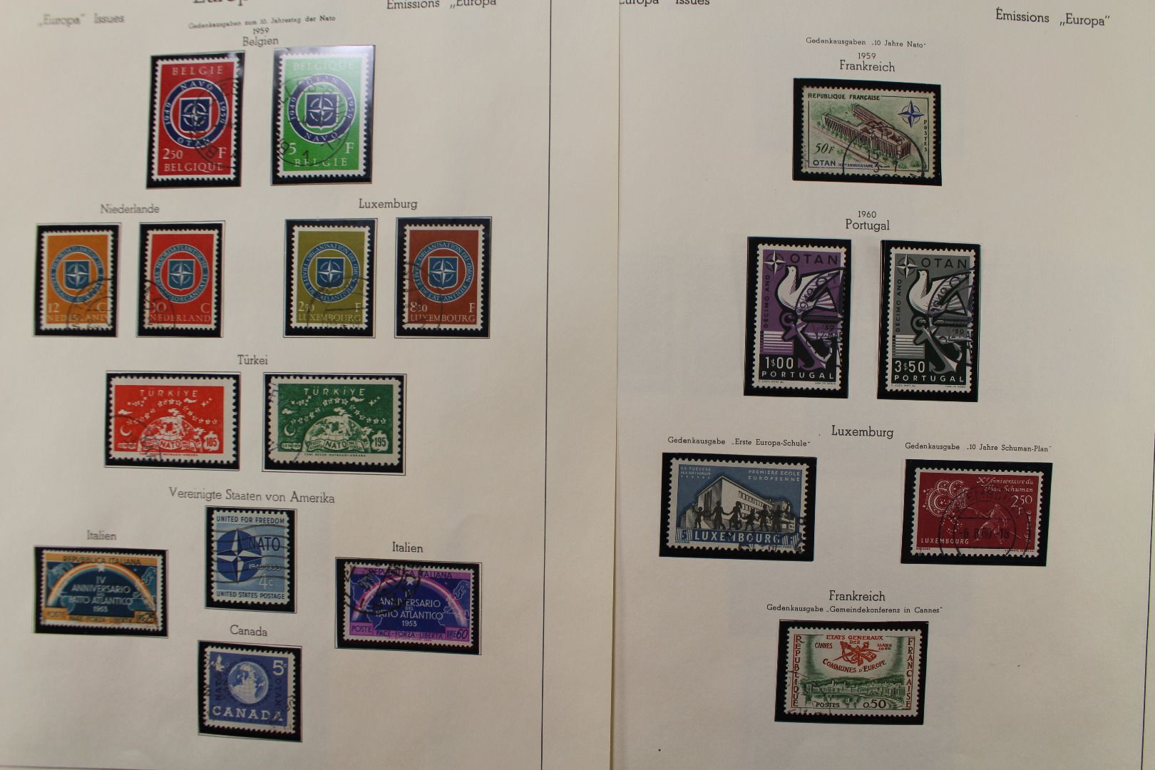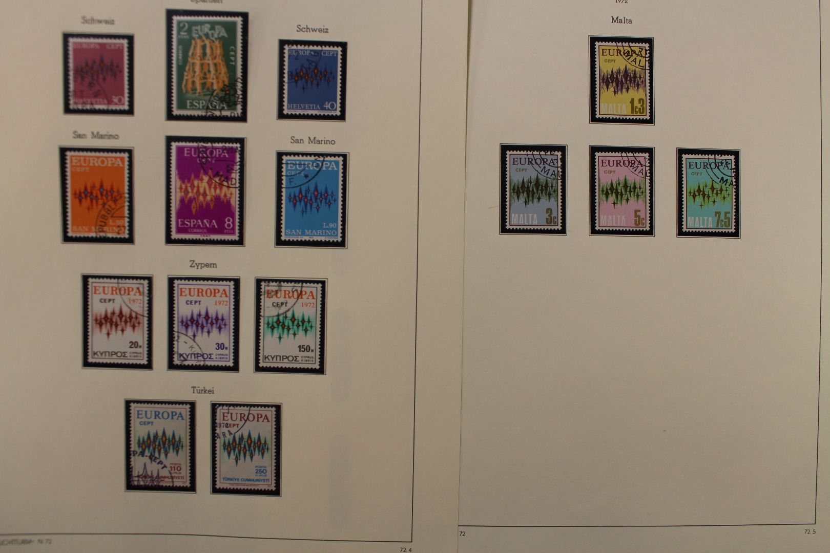 Umfangreiche Teilsammlung in überwiegend guter Qualität, teils etwas unterschiedlich. Es fehlen u.a. Luxemburg 1956 + 1957 u. Spanisch Andorra 1972. Zusätzlich sind viele Mitläufer und andere Nebengebiete enthalten. Untergebracht in einem alten Leuchtturm Vordruckalbum mit überwiegend schwarzen Klemmtaschen mit Klemmbinder.