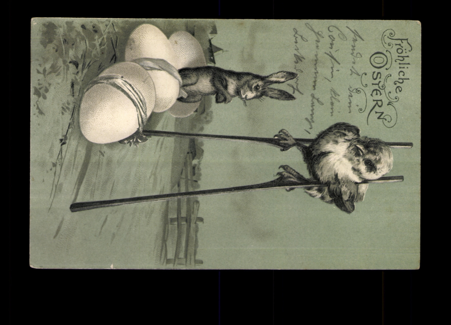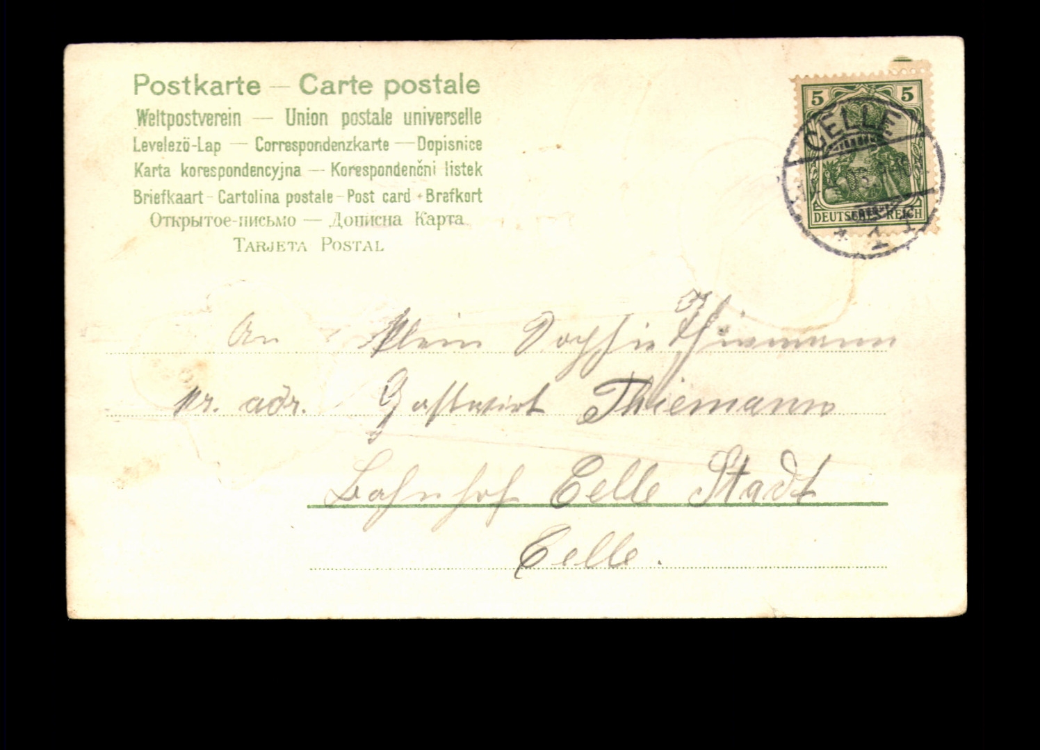 Prägekarte, gelaufen, Ecken bestoßen, leicht fleckig, kleiner Einriss rechts.