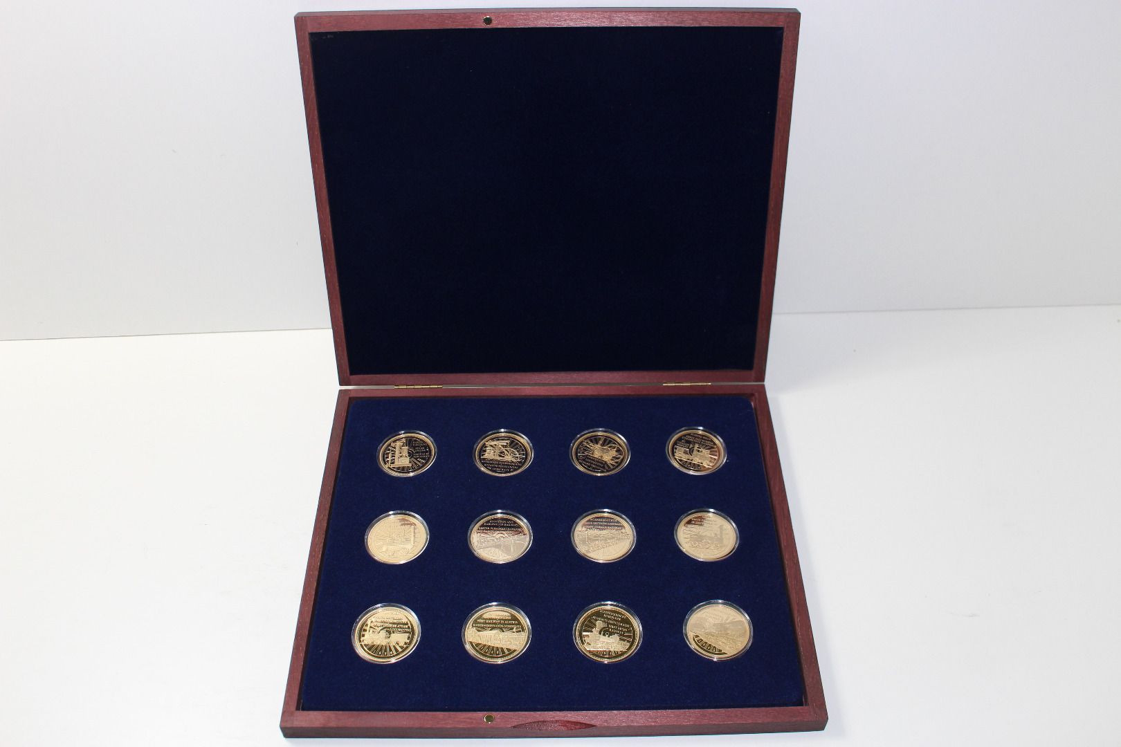 12 Medaillen in polierter Platte, 33 mm Durchmesser und 14,6 Gramm schwer. Material: Kupfer/Nickel. Untergebracht in einer Kassette.