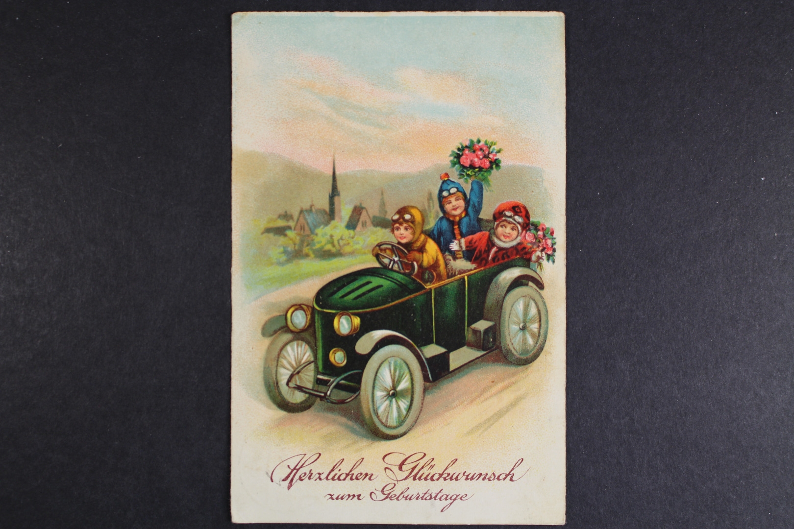 Glückwunsch zum Geburtstag, 3 Kinder mit Blumen im Auto