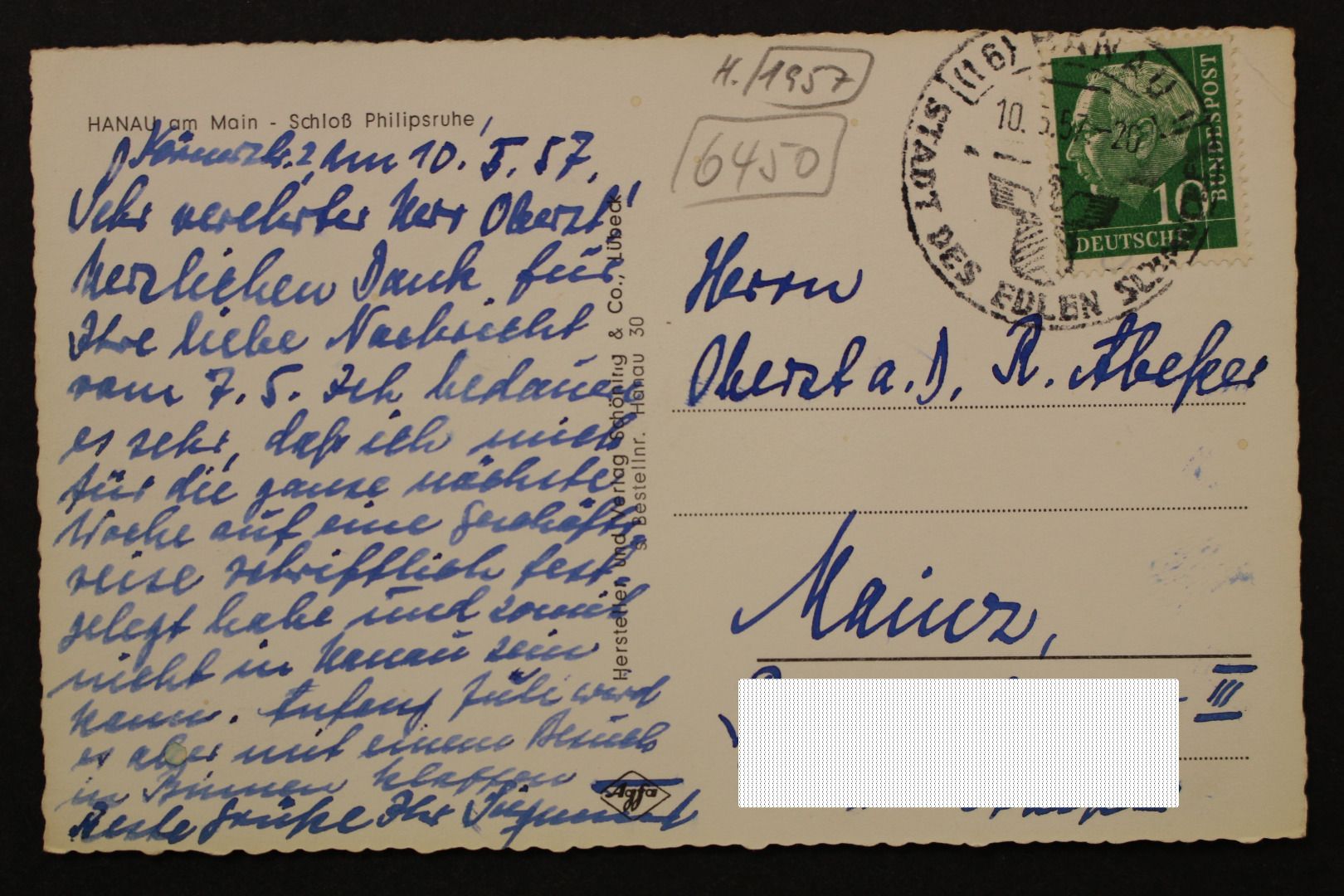 Karte gelaufen, etwas bestoßen, leicht fleckig, Eckknick links oben