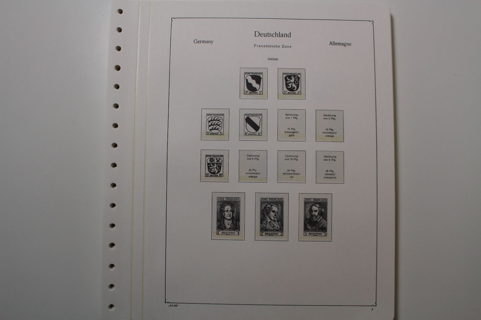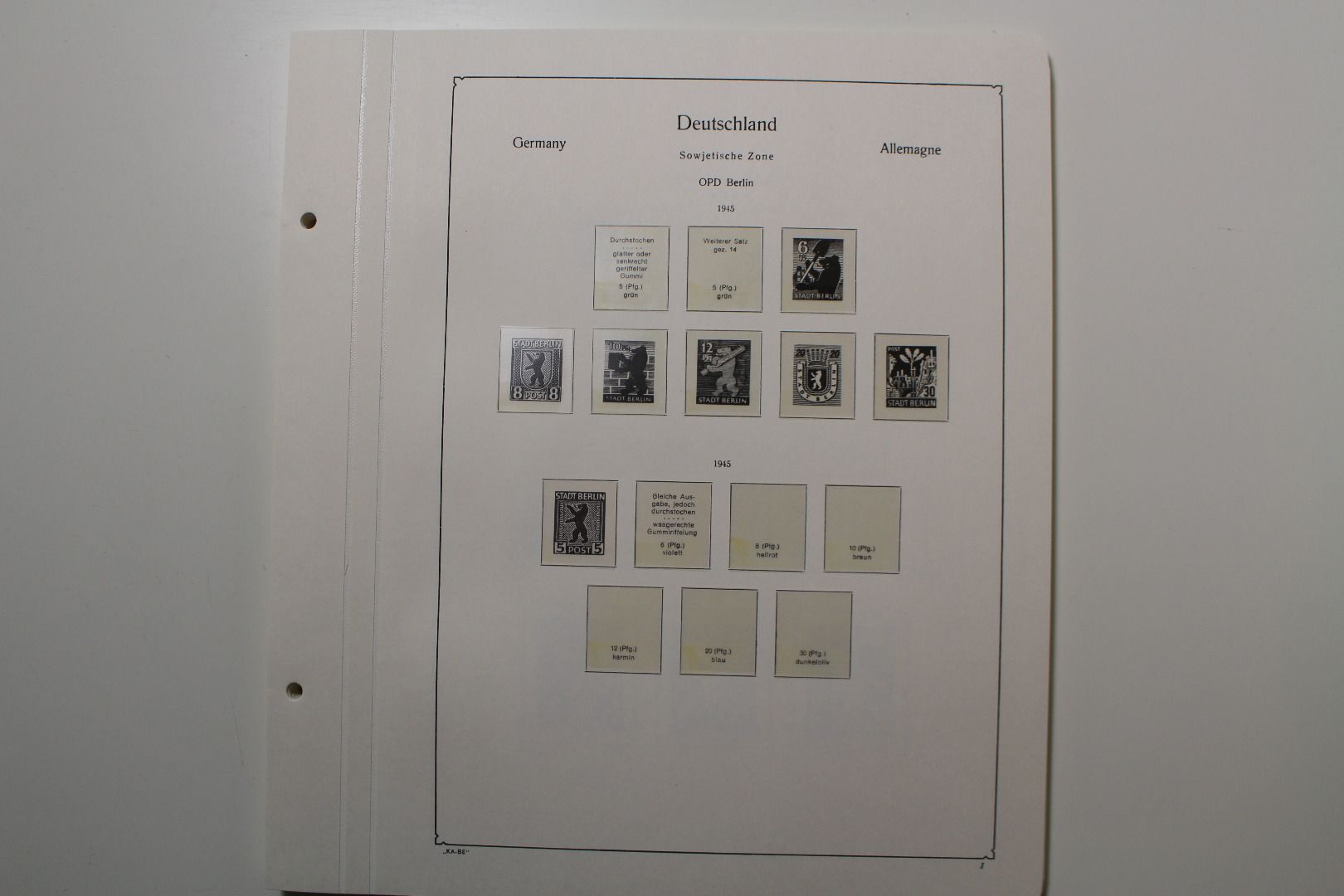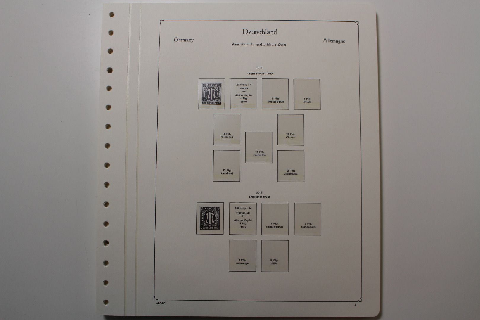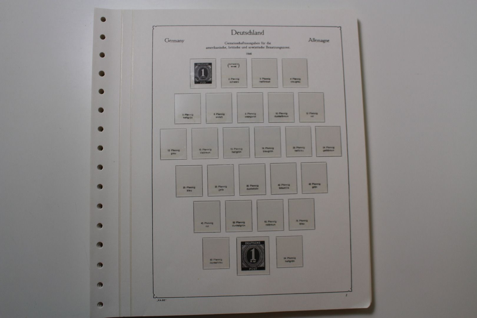 Enthalten sind die Gebiete: Gemeinschaftsausgaben (4 Blätter), Französische Zone (18 Blätter), Amerikanische u. Britische Zone (11 Blätter und Sowjetische Zone (27 Blätter) - also insgesamt 60 Blätter mit Klemmtaschen und einem Klemmbinder. Auf den Blättern fehlen Unterarten, auch z.B. Baden 46 II oder SBZ Block 1 + 2 in der 2. Papiersorte. Alles in guter gebrauchter Erhaltung. Durch das Einkleben der Klemmtaschen ist teilweise der Kleber zu sehen. Das kommt durch das Alter der Blätter.