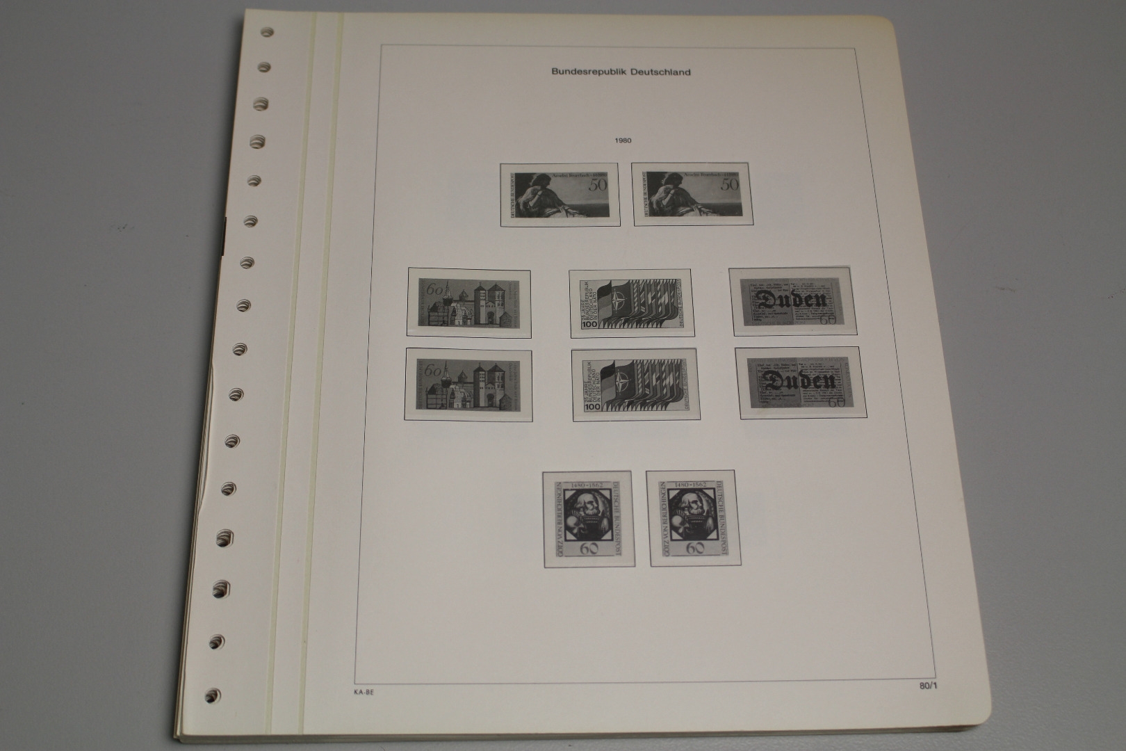 Postfrisch und gestempelt auf einem Blatt nebeneinander. Kompletter Vordrucksatz mit 37 Blättern, ältere Ausgabe mit selbst eingeklebten Klemmtaschen. Die C/D Werte der MiNr. 1028 (1979) sind in diesem Satz enthalten. Die Blätter sind gebraucht mit leichten Alterungsspuren.
