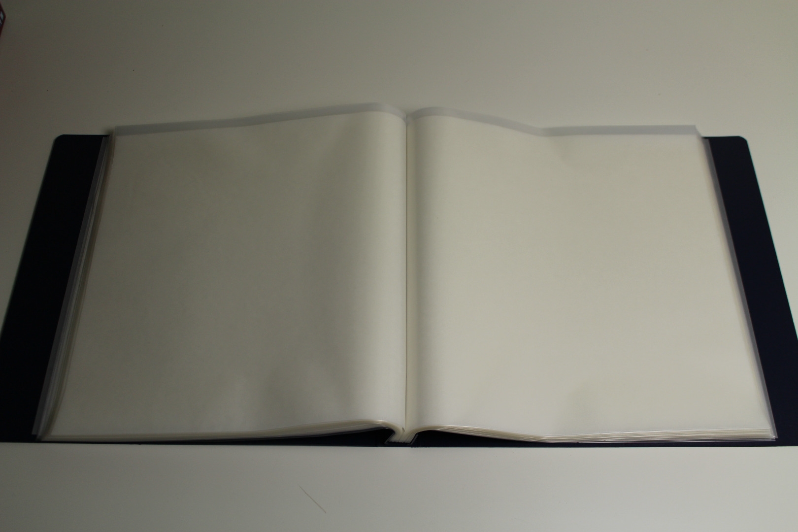 aus hochtransparenter, weichmacherfreierFolie mit Zwischenblatt aus Pergamin für 100 Bogen bis 290 x 310 mm im Einband aus starker, dunkelblauer Hartpappe. Albumformat: 325 x 325 mm