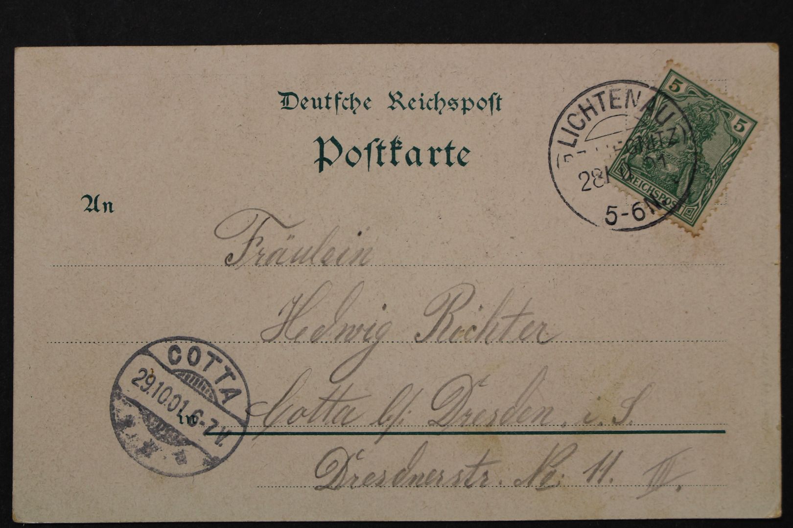Karte gelaufen, Ecken leicht bestoßen, etwas fleckig