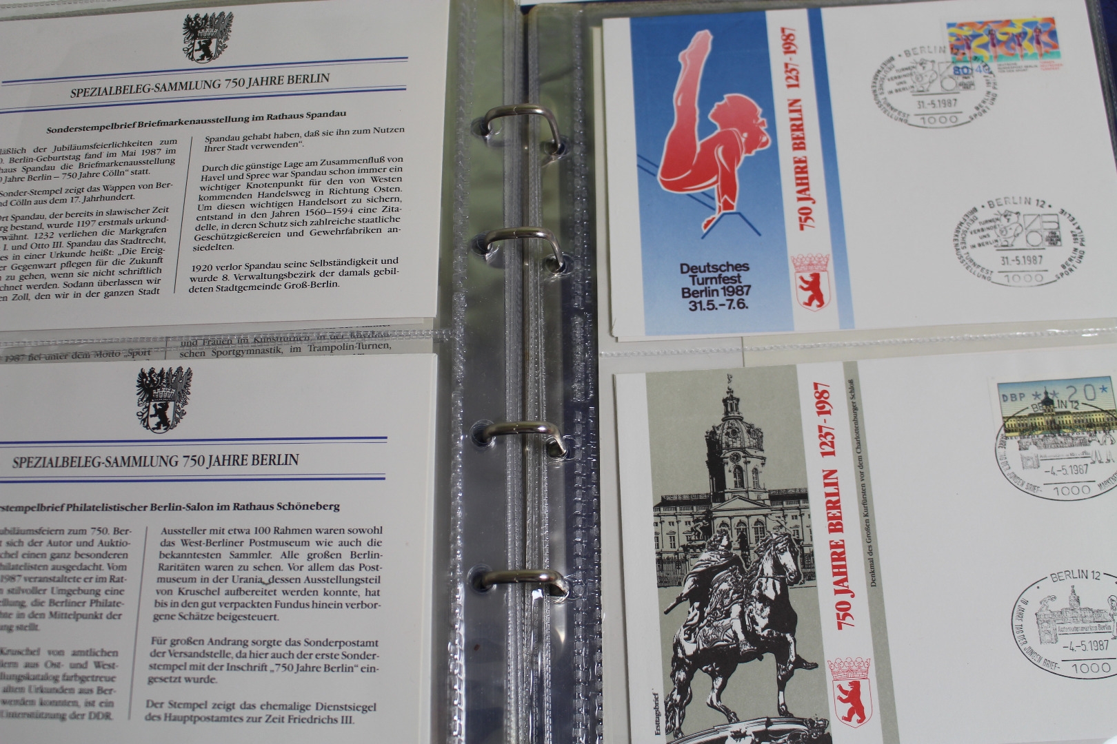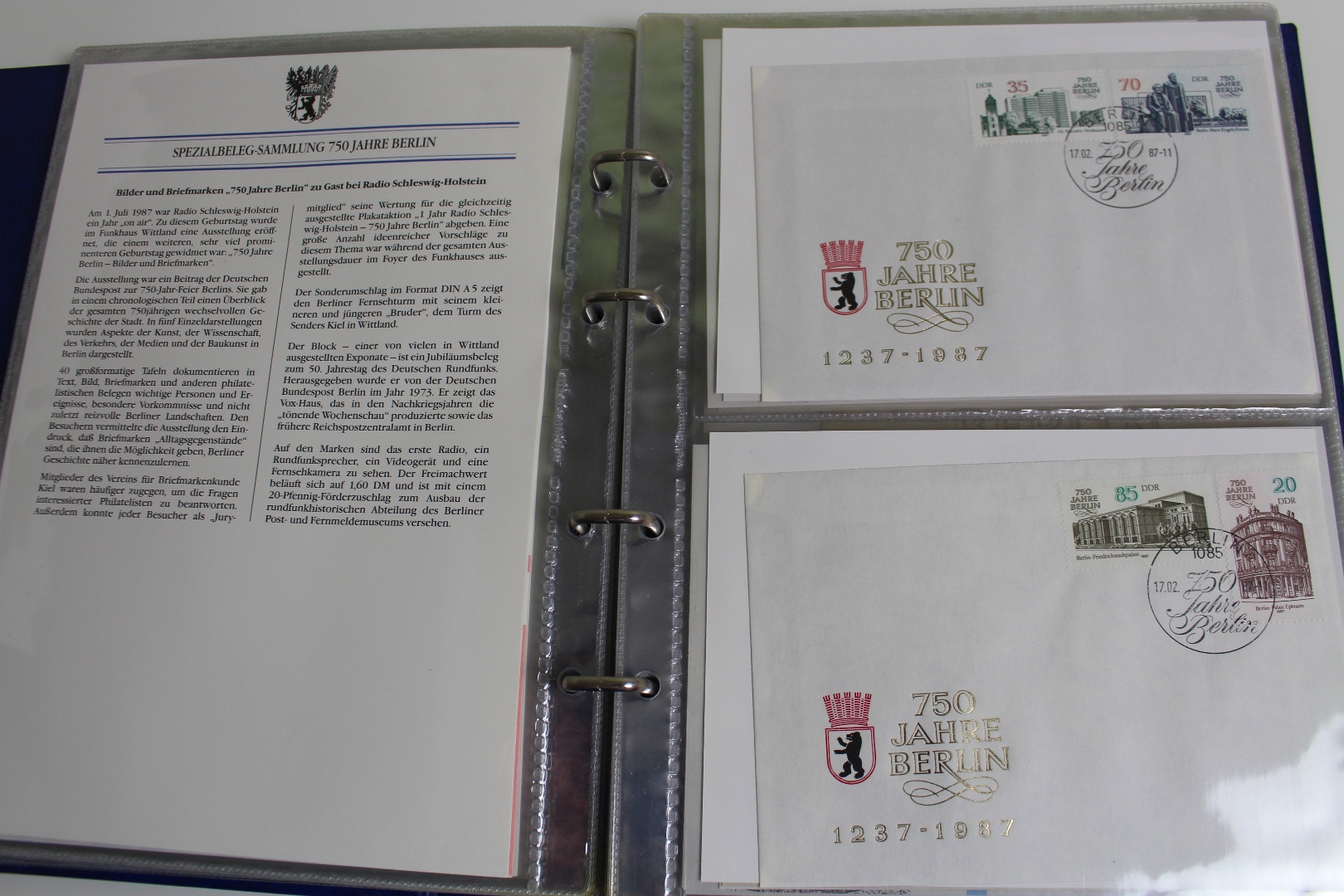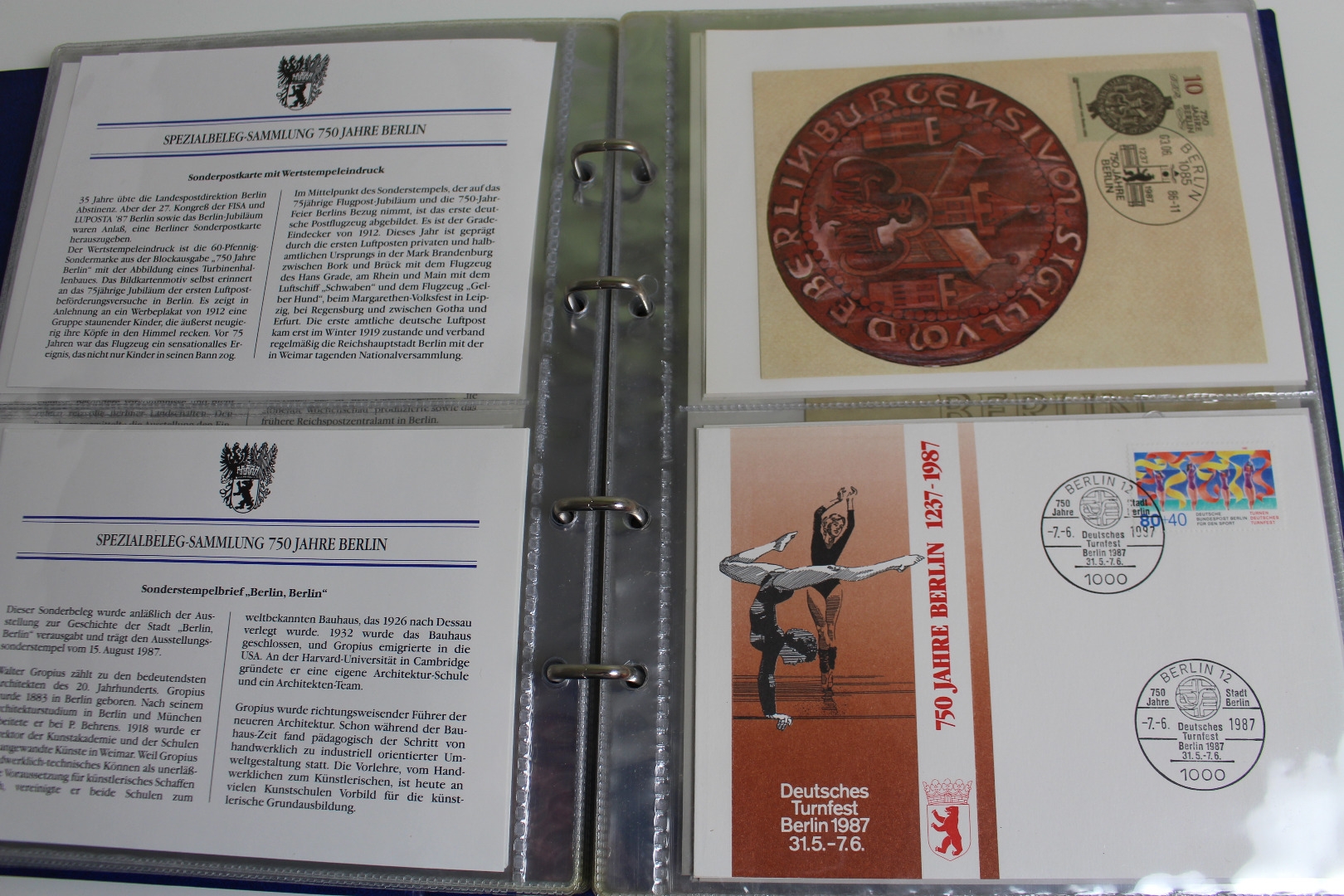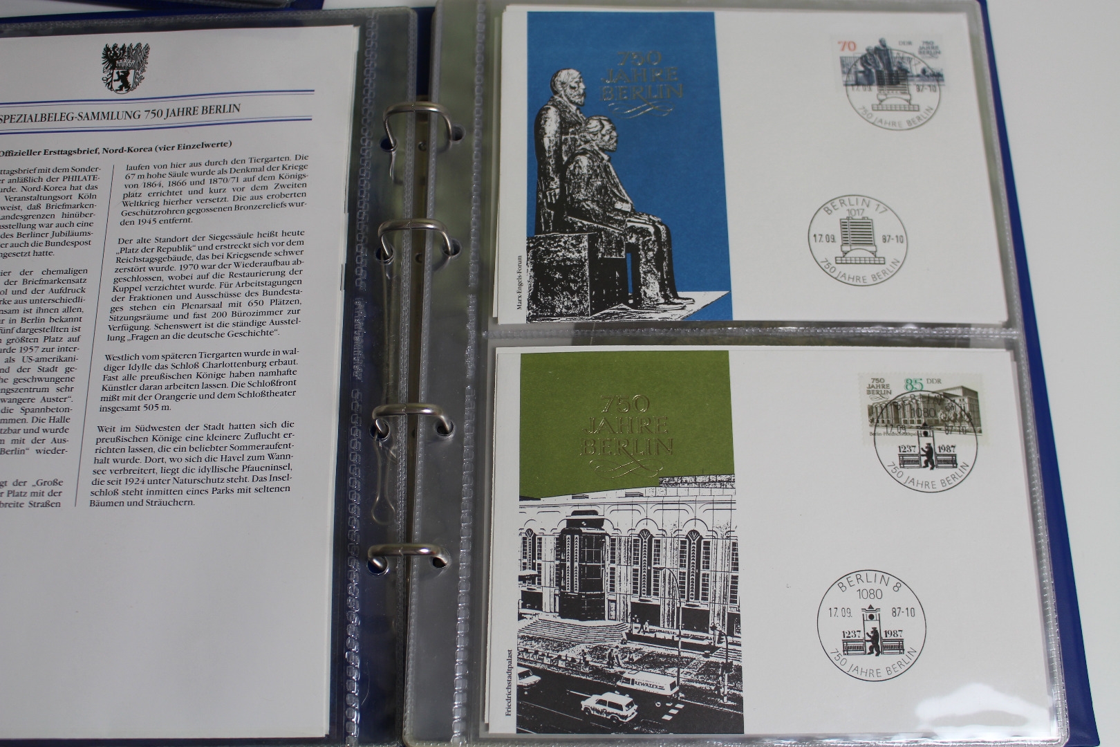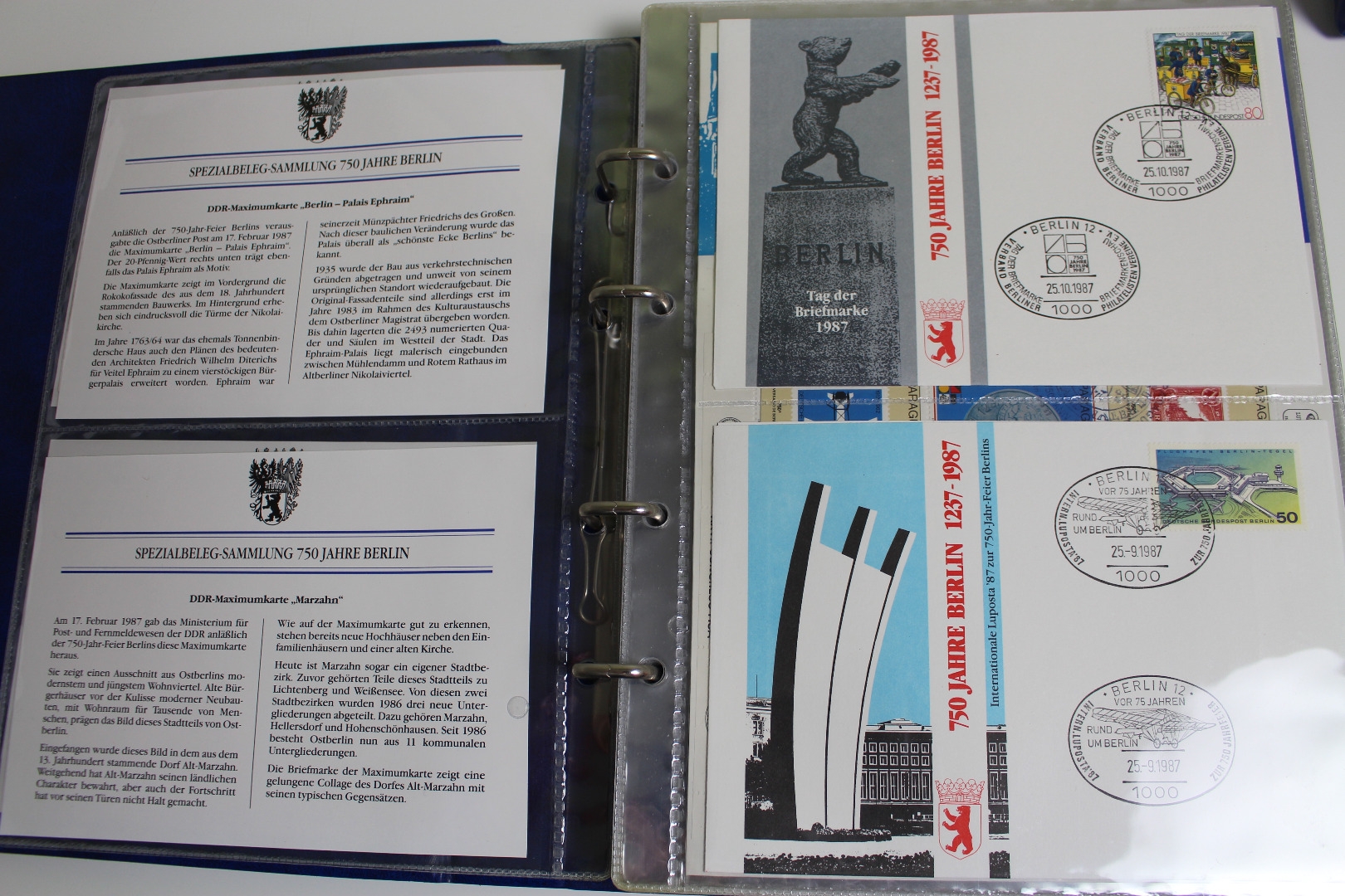 Teilsammlung mit vielen Briefmarken und Sonderbelegen, -drucken, Maximumkarten, 2 Numisbriefen usw. aus den Gebieten BRD, Berlin und DDR sowie etwas Ausland. Untergebracht in 2 Ringbindern. Ein Binder vorder- und rückseitig mit starker Wellenbildung.