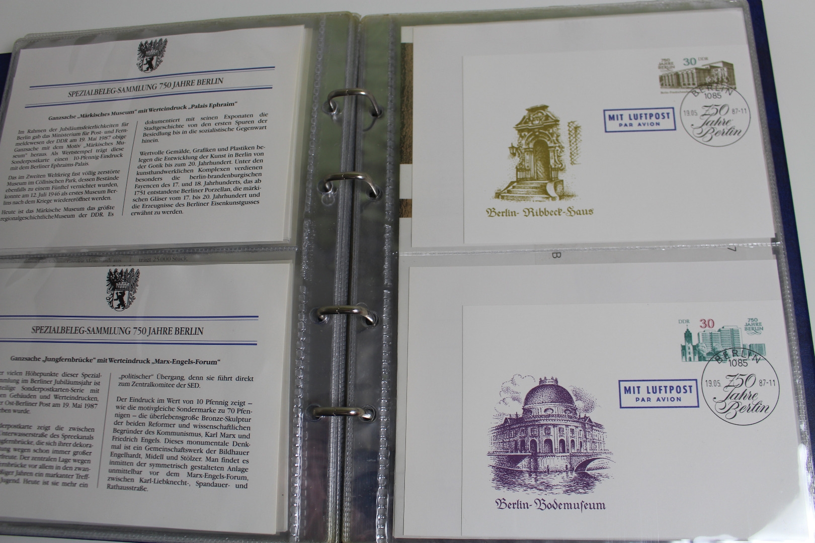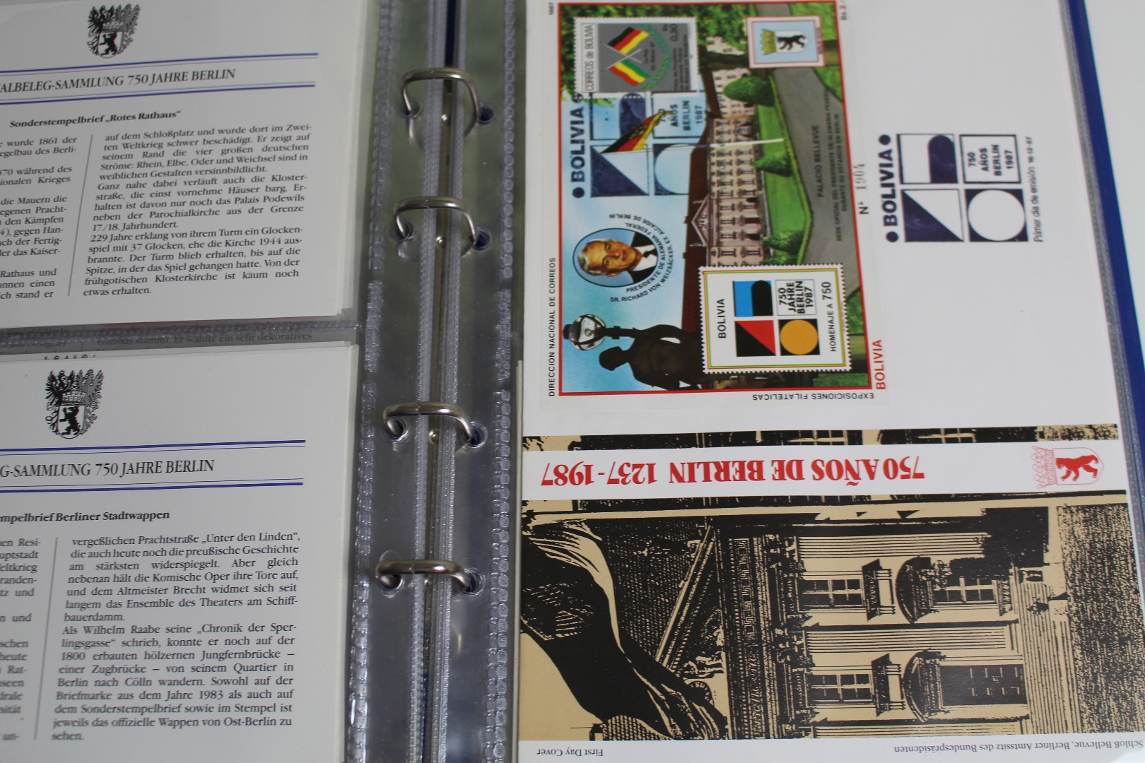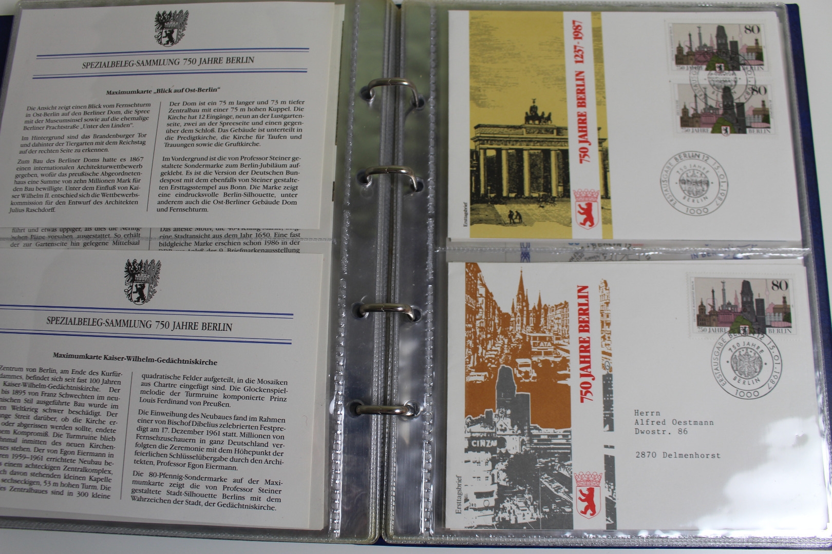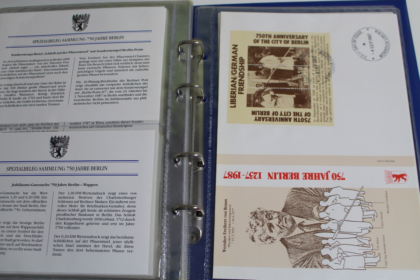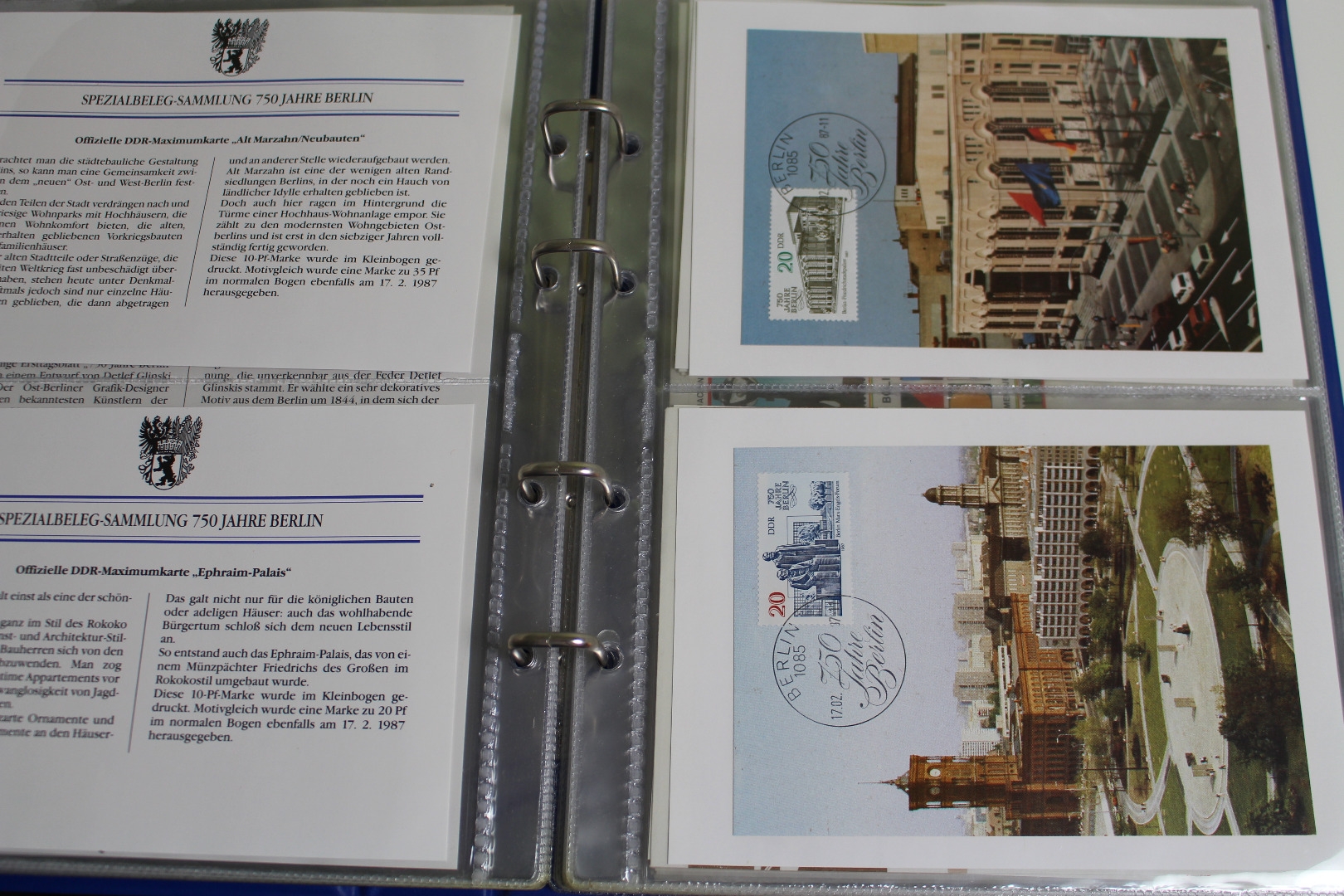 Teilsammlung mit vielen Briefmarken und Sonderbelegen, -drucken, Maximumkarten, 2 Numisbriefen usw. aus den Gebieten BRD, Berlin und DDR sowie etwas Ausland. Untergebracht in 2 Ringbindern. Ein Binder vorder- und rückseitig mit starker Wellenbildung.