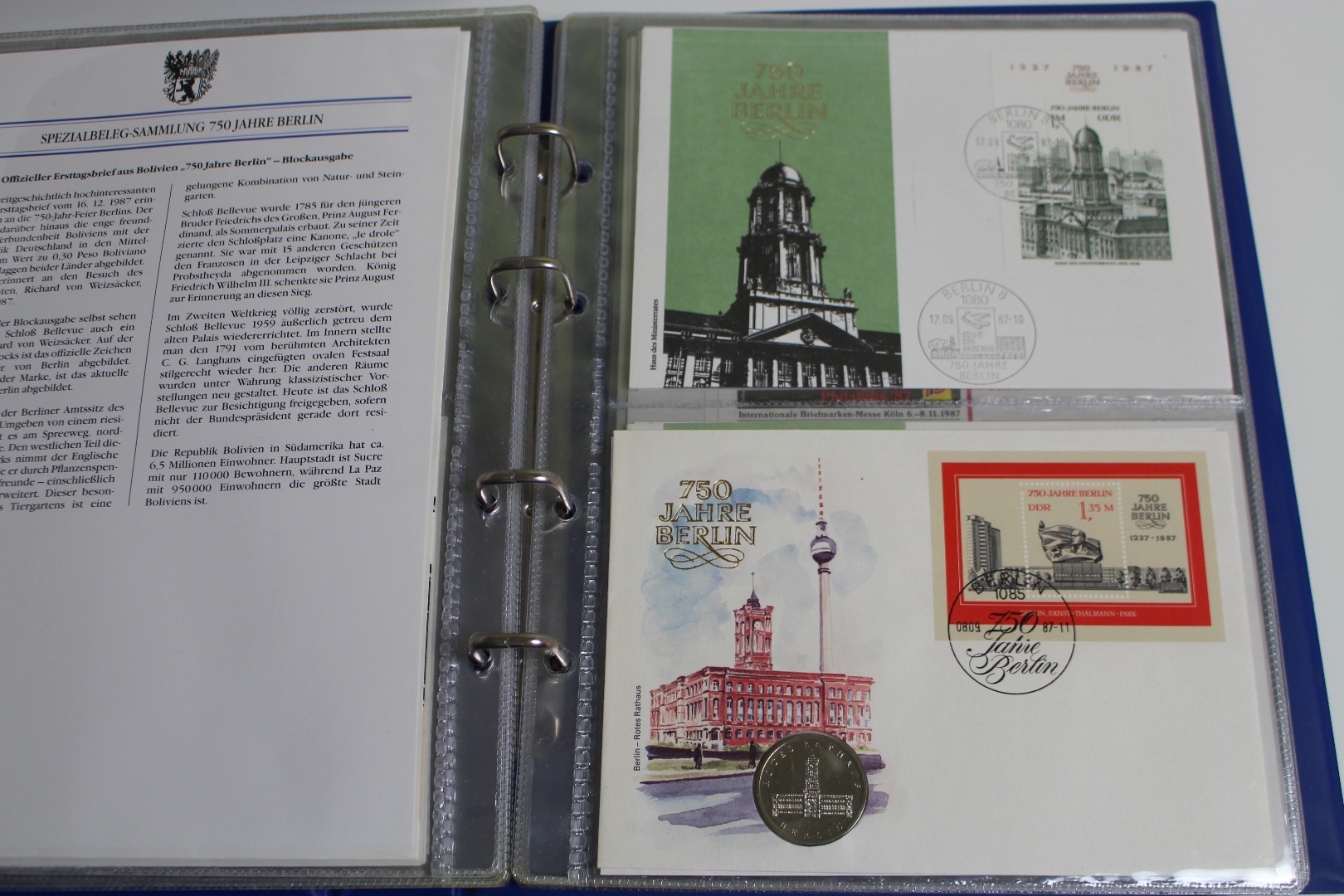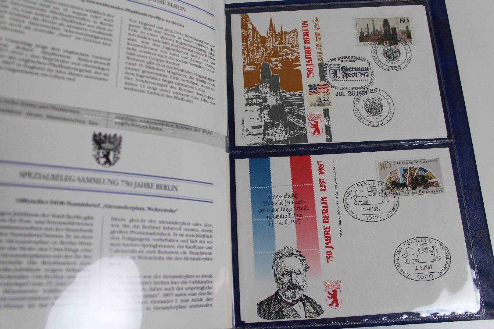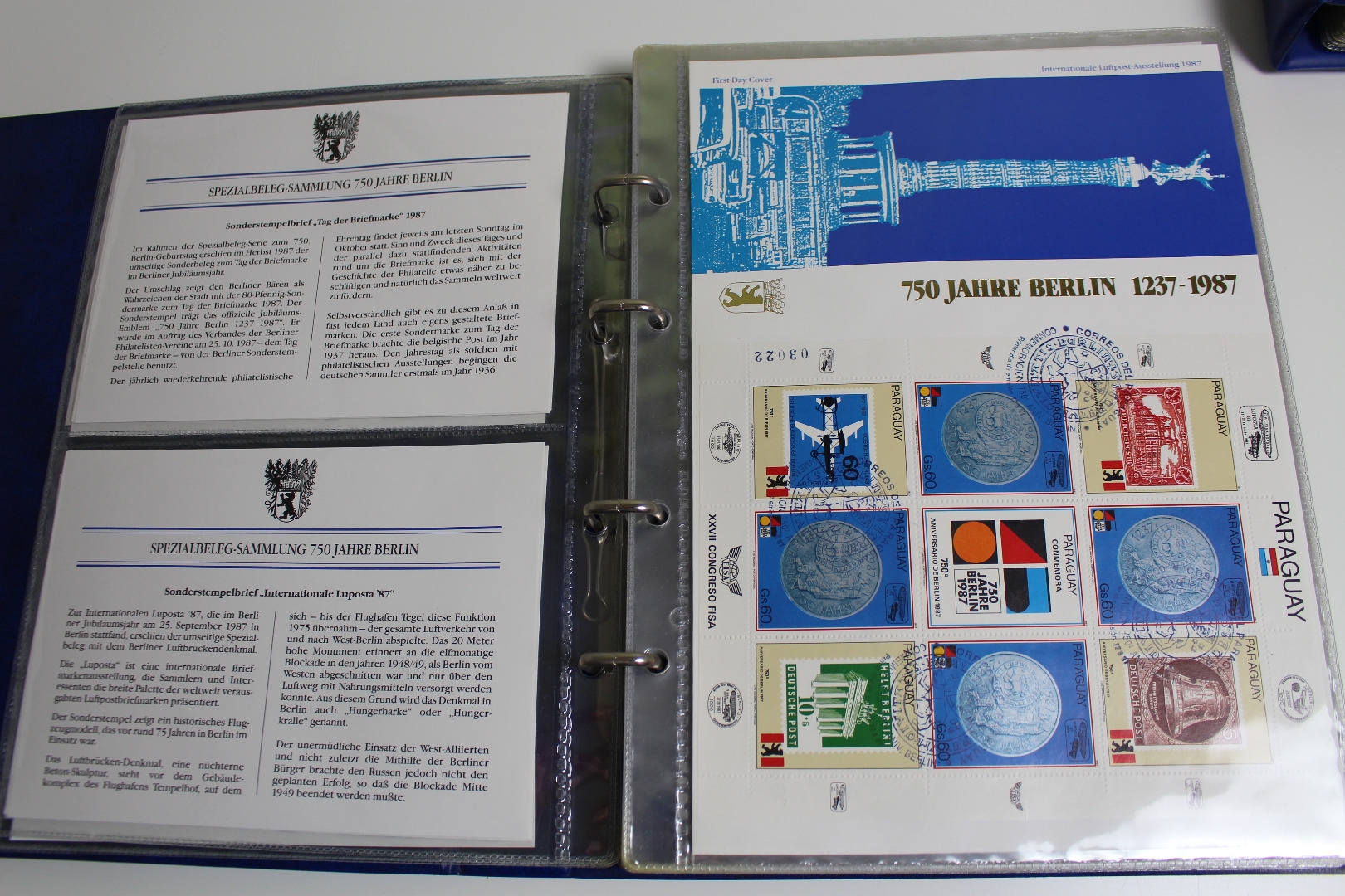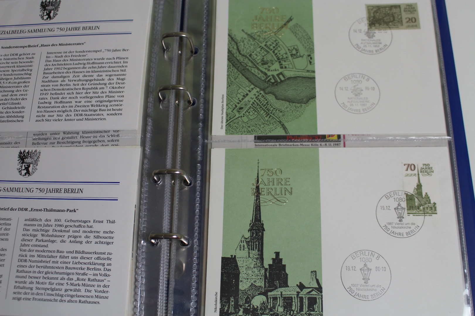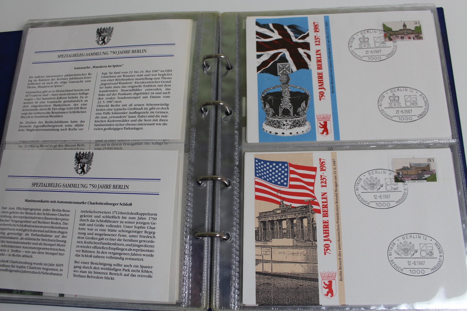 Teilsammlung mit vielen Briefmarken und Sonderbelegen, -drucken, Maximumkarten, 2 Numisbriefen usw. aus den Gebieten BRD, Berlin und DDR sowie etwas Ausland. Untergebracht in 2 Ringbindern. Ein Binder vorder- und rückseitig mit starker Wellenbildung.