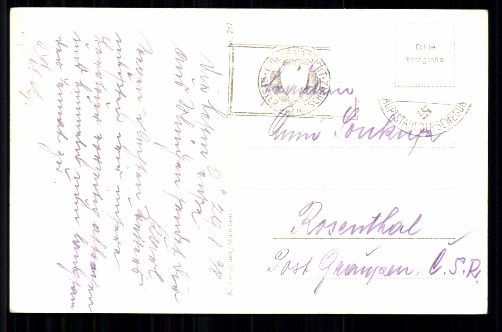 Karte gelaufen, Marke sauber abgelöst, etwas bestoßen, leicht fleckig. Vorderseitig mittig einige Kratzer.