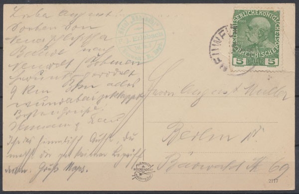 gelaufen, Ecken bestoßen, leicht fleckig, links oben Knitter, Marke beschädigt