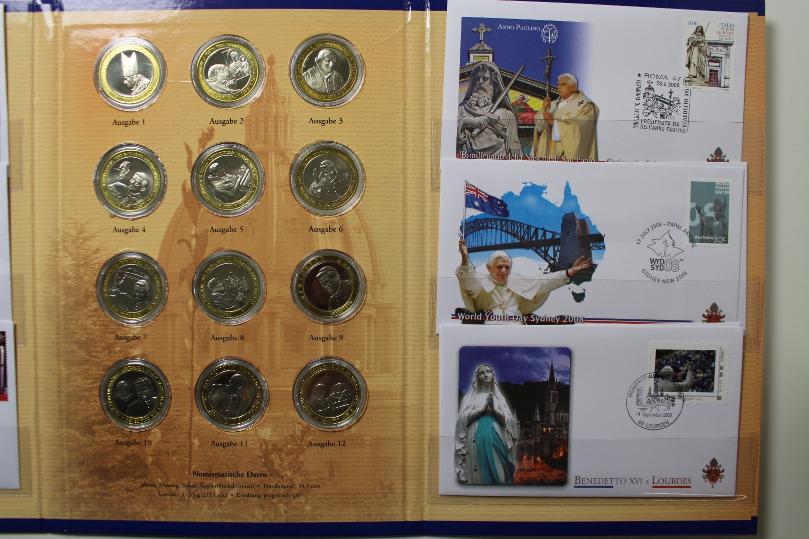 12 Medaillen (Metall: Messing (Rand), Kupfer/Nickel (Innen), Durchmesser 34,5 mm, Gewicht 15,55 g, Erhaltung: prägefrisch) + 12 Briefe. Wir haben die Zuordnung der Medaillen und Briefe nicht überprüft. Geliefert wir genau der abgebildete Artikel.