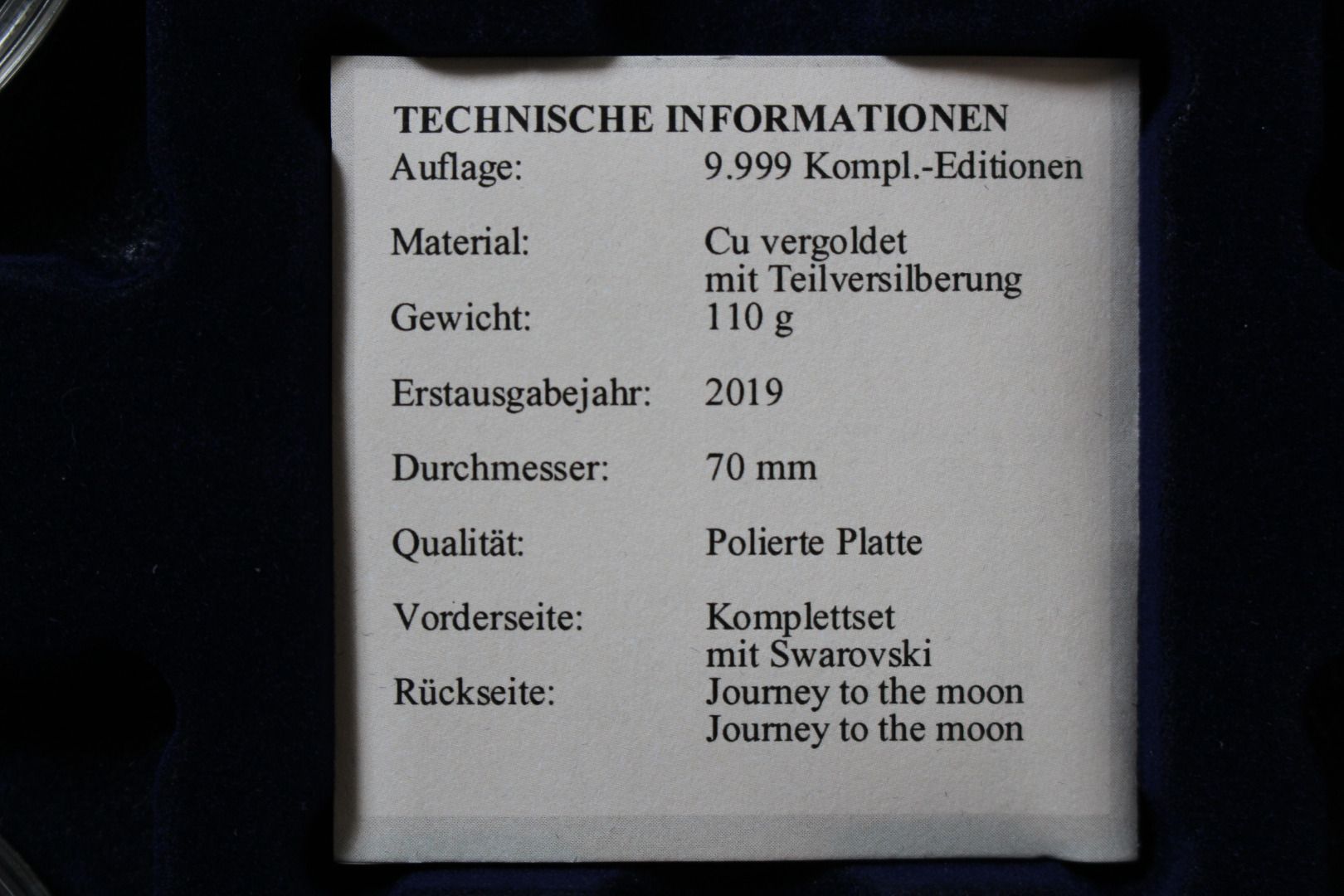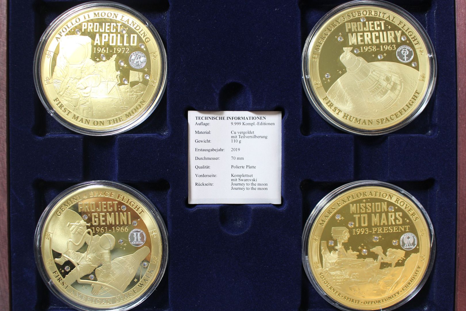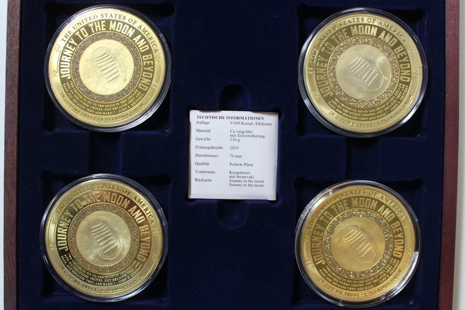 4 Medaillen in polierter Platte, 70 mm Durchmesser und 110 Gramm schwer. Material: Kupfer/Nickel mit Swarovski. Untergebracht in einer Kassette.