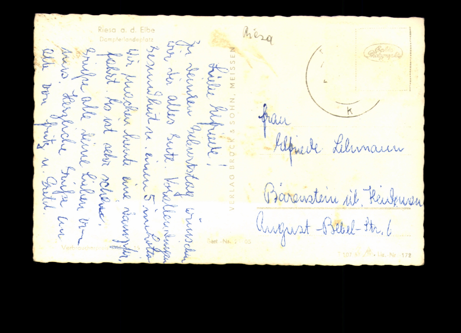 Gelaufen, Marke abgelöst, Ecken bestoßen, fleckig.