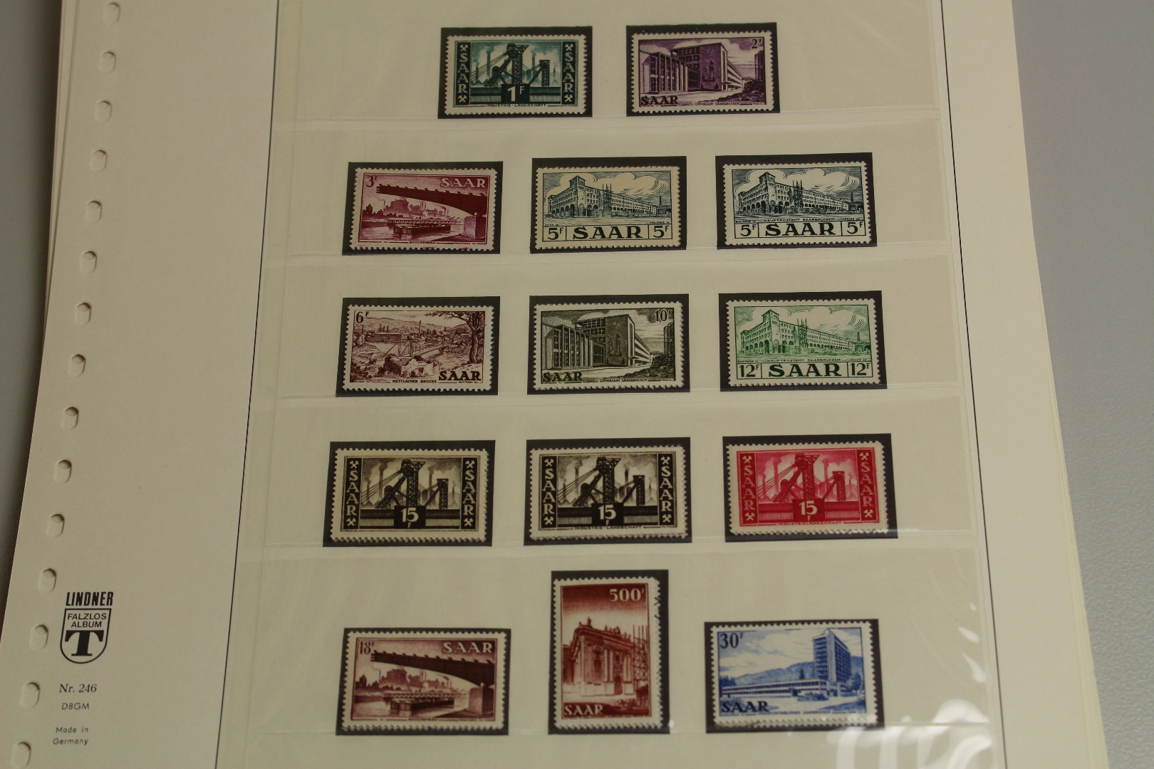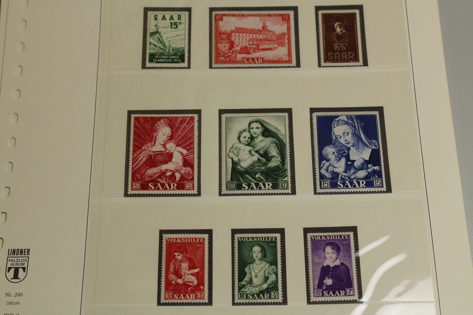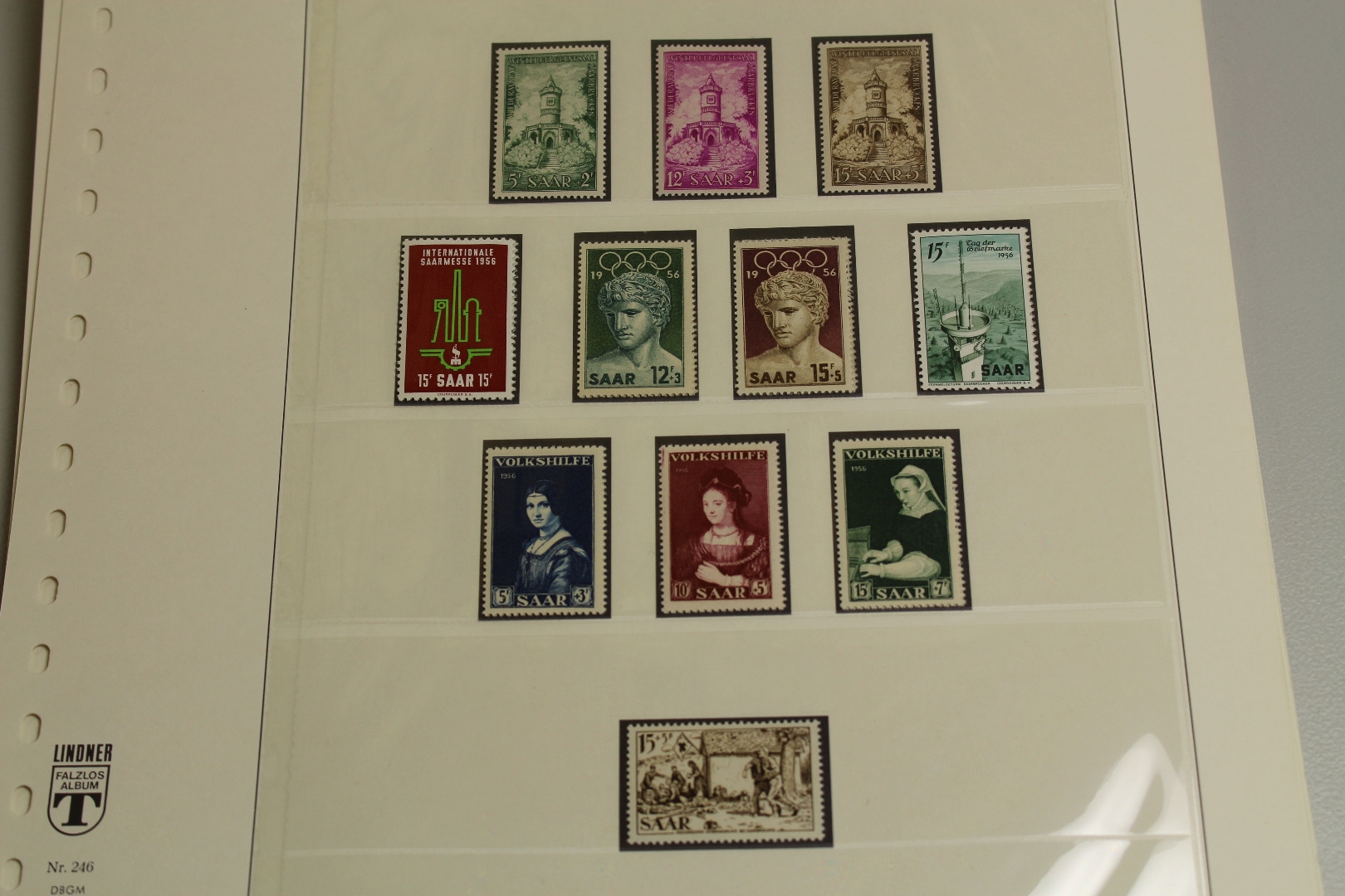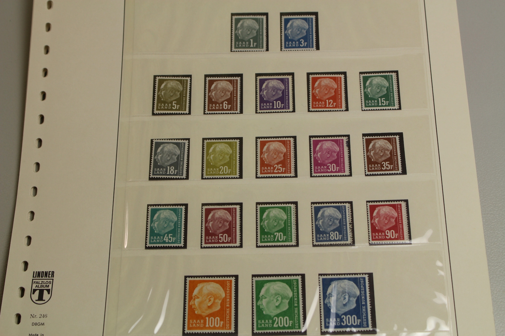 Es fehlen Block 1 + 2 und die Dienstmarken 33-44. Sonst in den Hauptnummern komplette Sammlung. Alle enthaltenen Briefmarken sind einwandfrei postfrisch. Zusätzlich sind viele Briefmarken auch noch gestempelt auf den Lindner T Vordruckblättern eingefalzt.