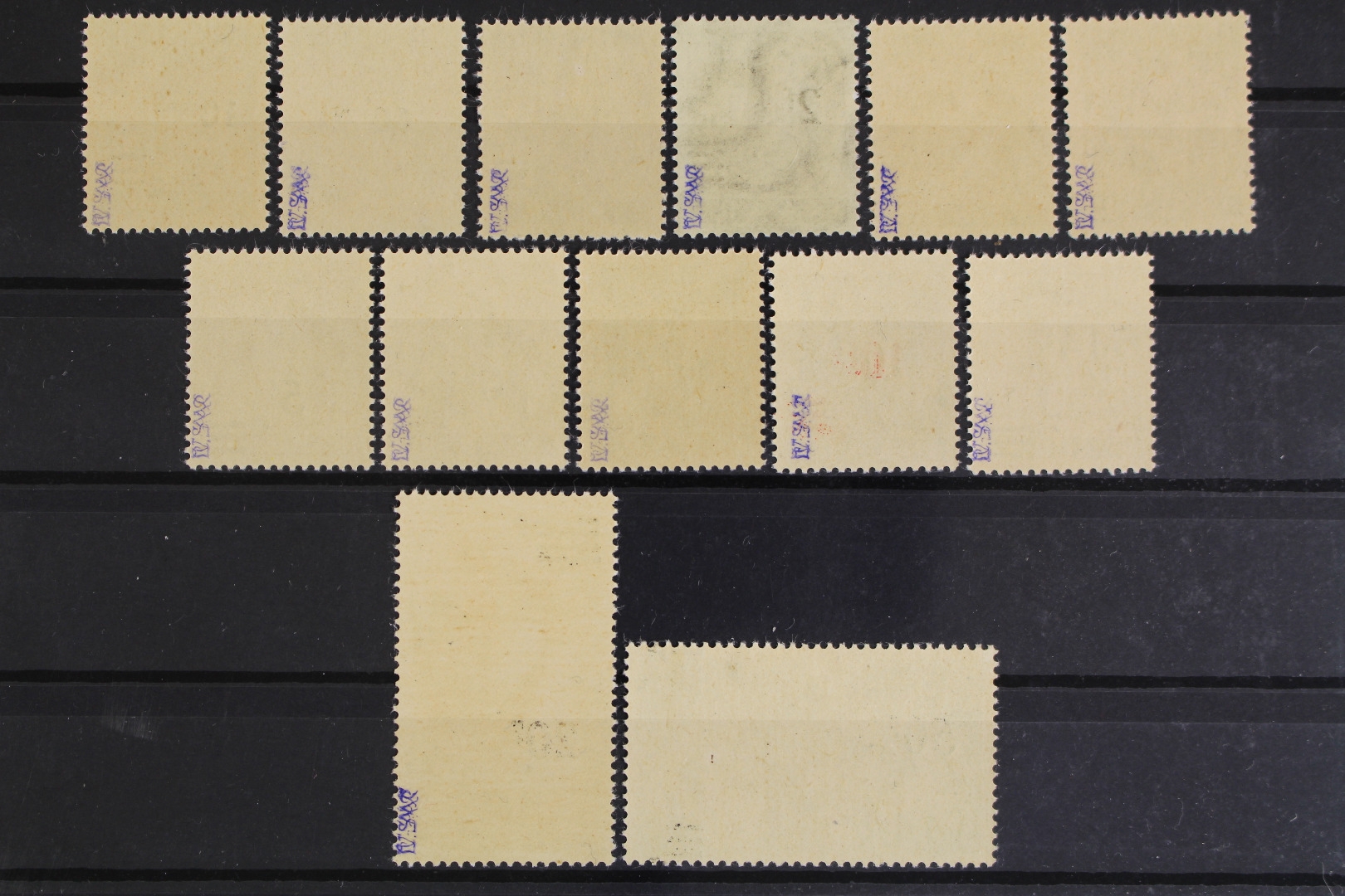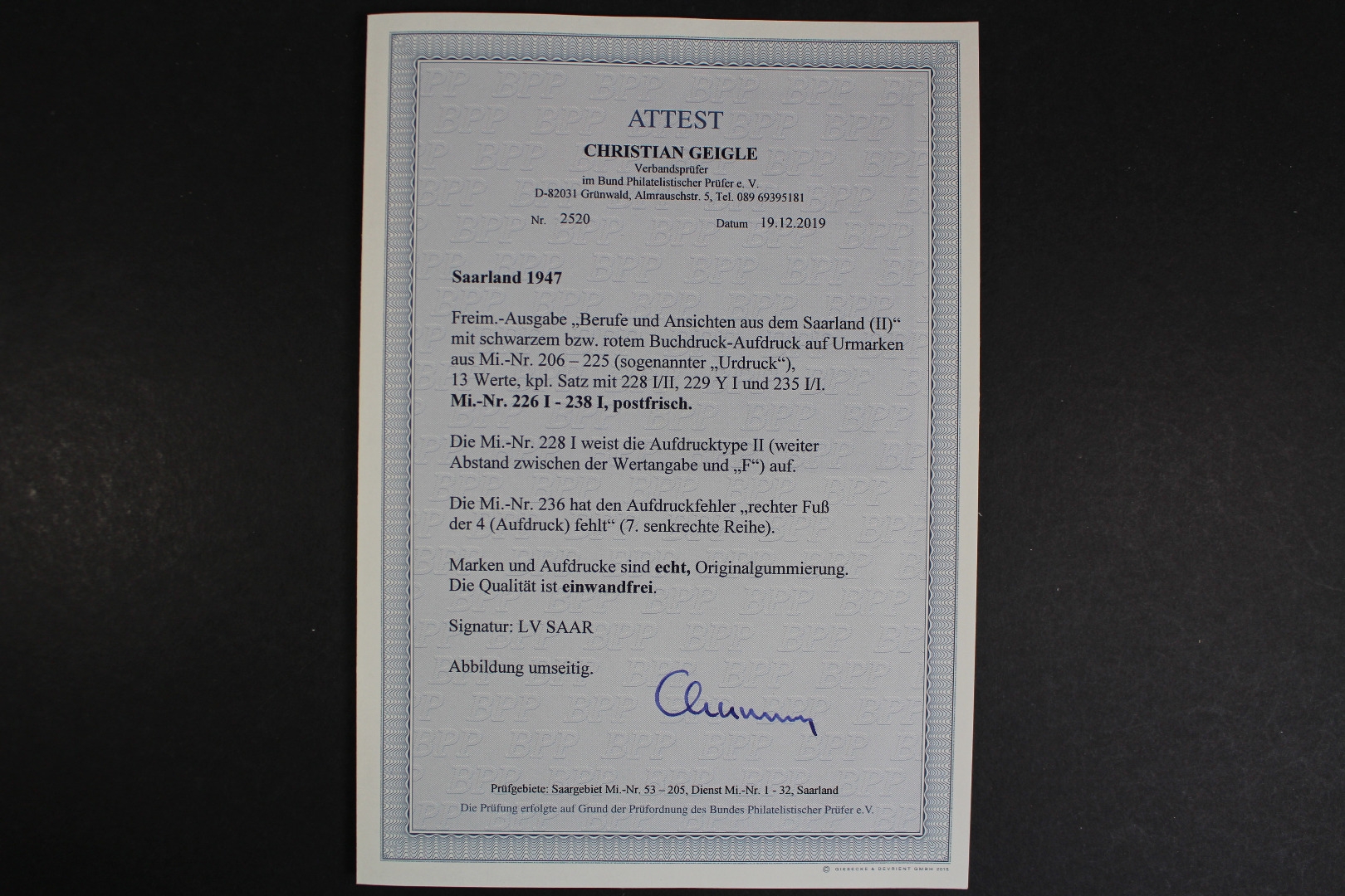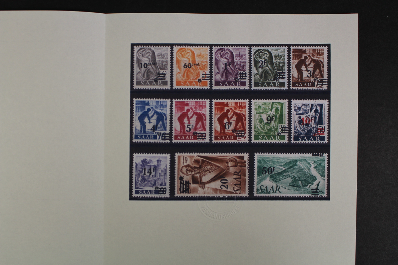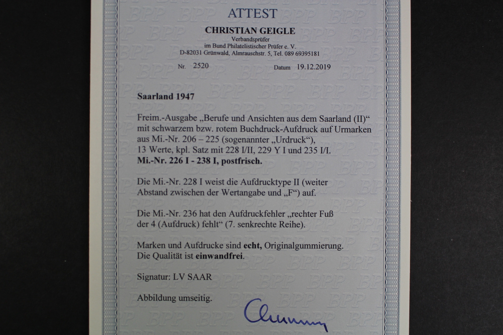 Freimarken Ausgabe mit Aufdruck, 13 Werte, kompletter Satz. MiNr. 228 in Aufdrucktype II und 236 mit Aufdruckfehler I. Einwandfreie Erhaltung. Altsignum der LV-Saar. Fotoattest Geigle (12/2019).