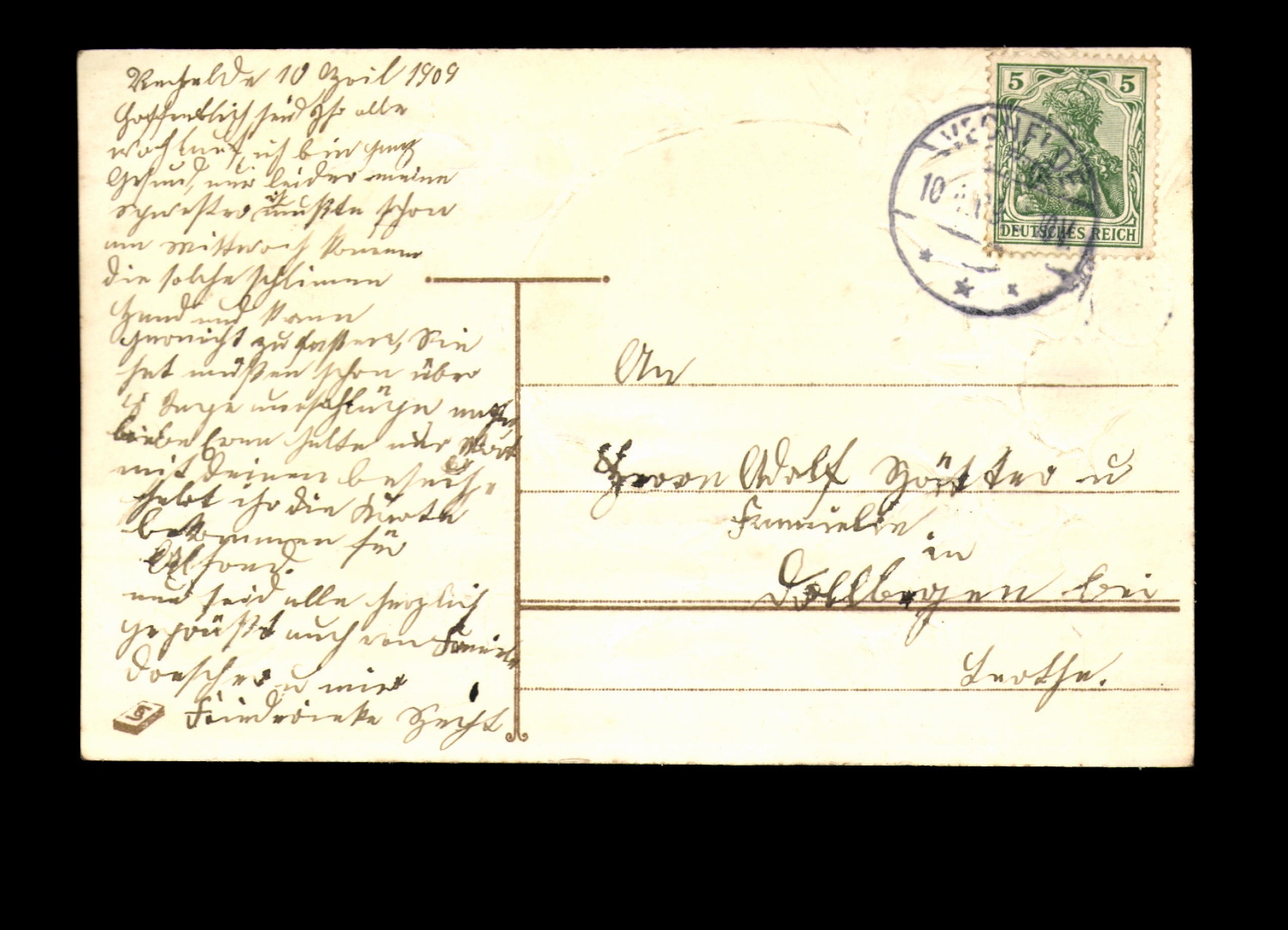 Prägekarte, gelaufen, Ecken bestoßen, leicht fleckig.
