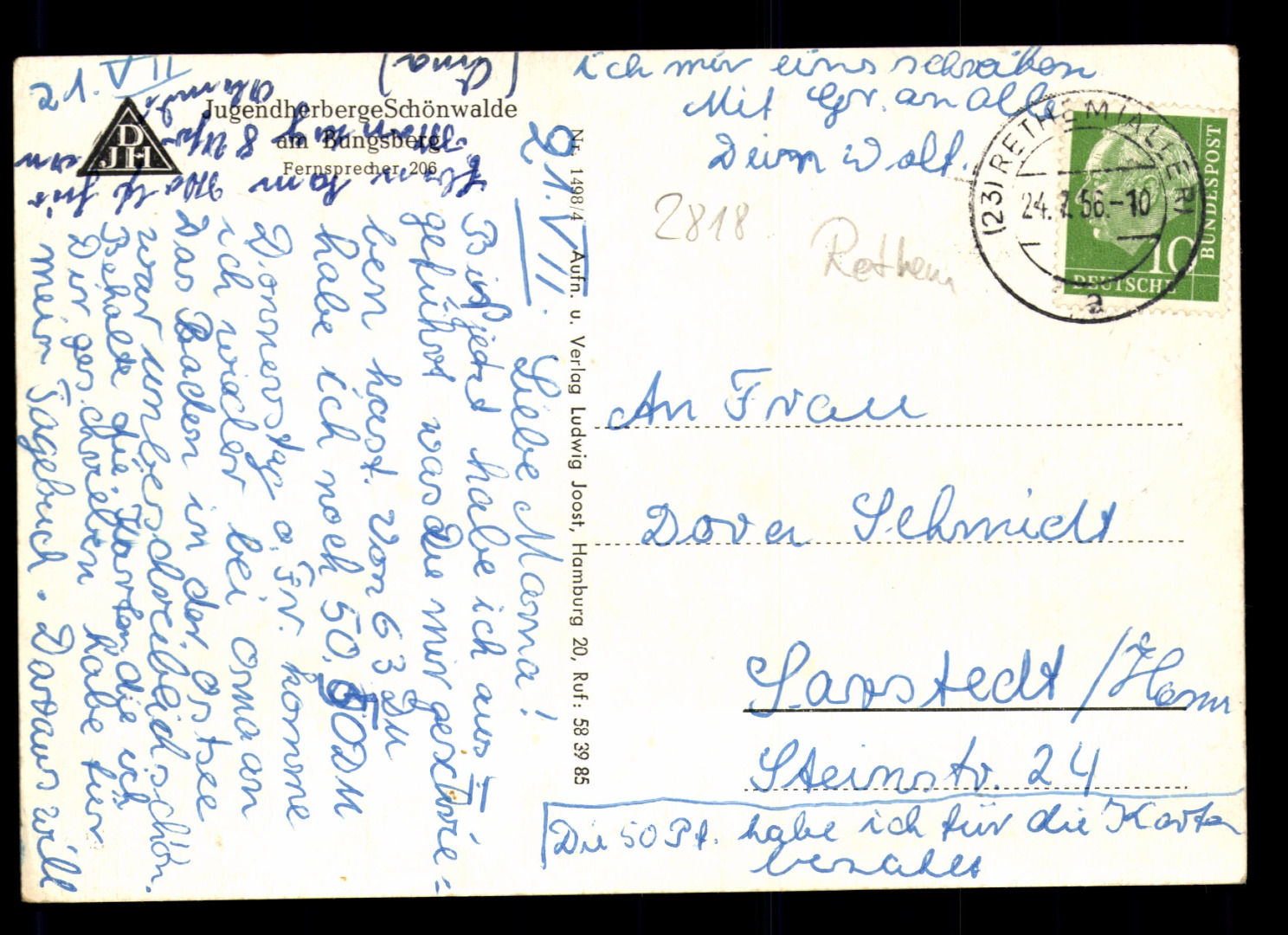 Gelaufen, leicht bestoßen, leicht fleckig, einige Büge links, Eckknicke rechts oben und unten. Gelaufen ab Rethem/Aller.