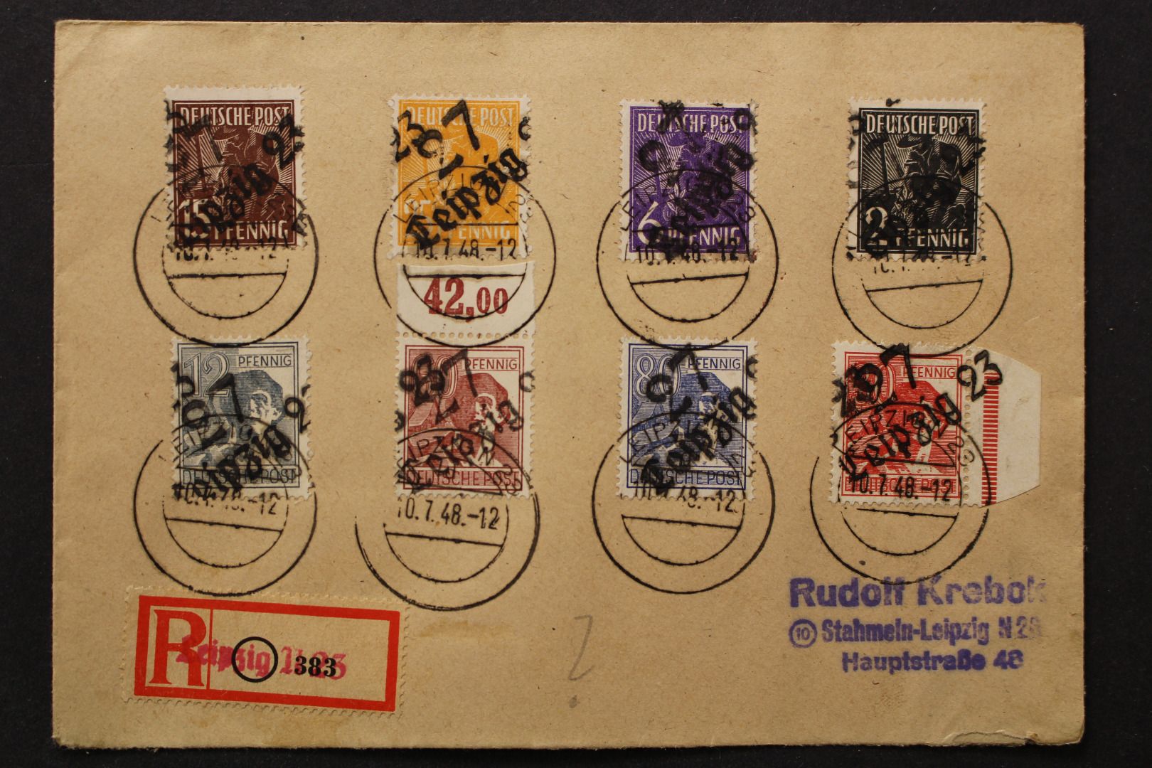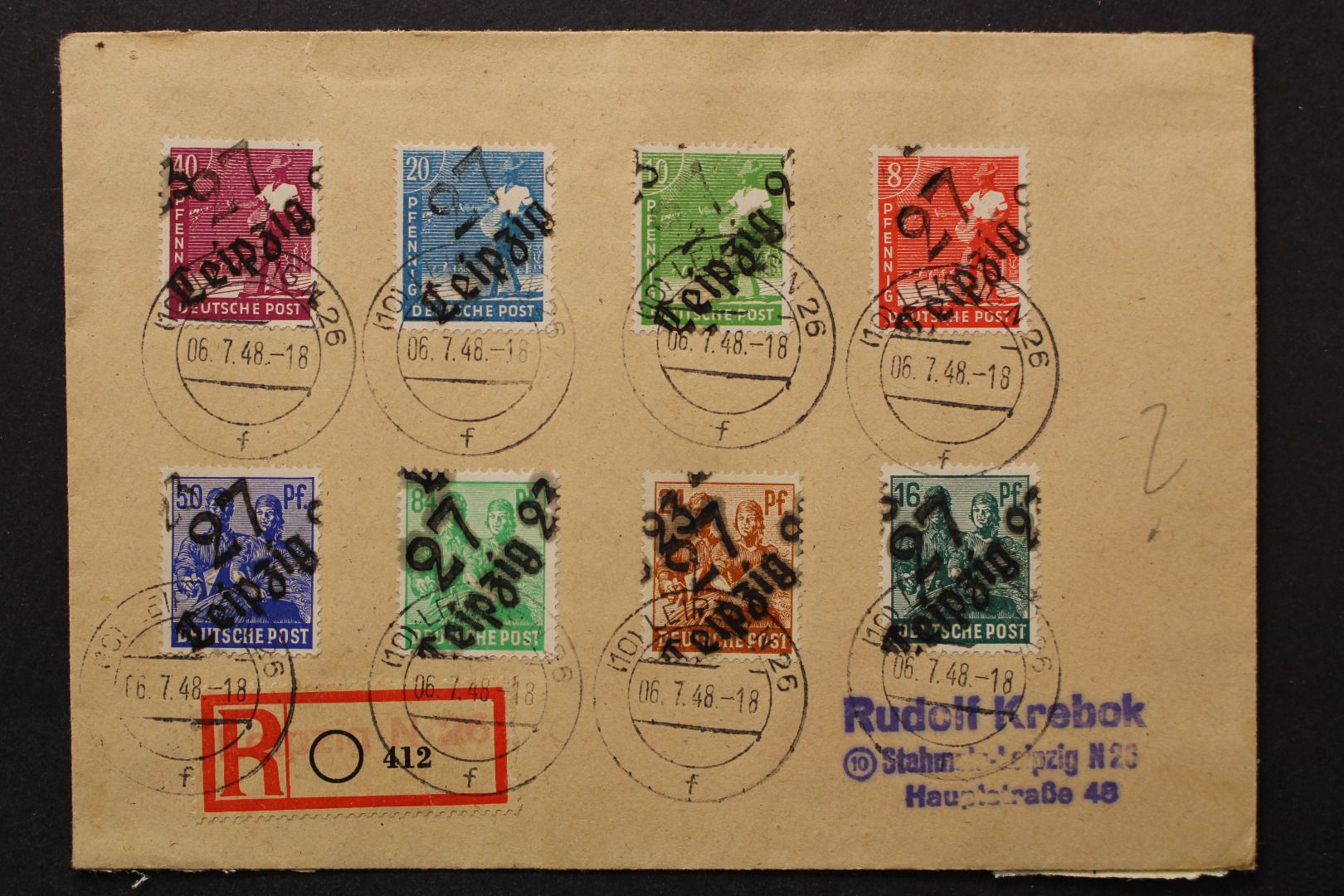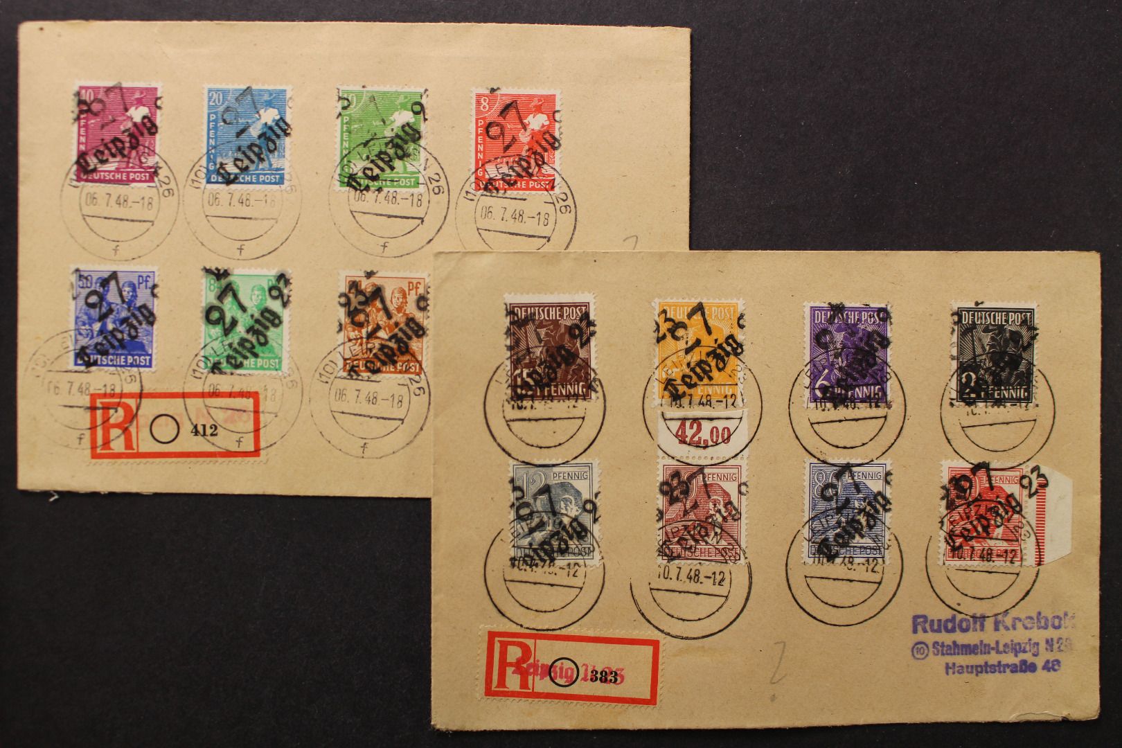 Bezirkshandstempel, 16 Werte auf zwei Satzbriefen, Einschreiben vom 6. bzw. 10.7.48, gemäß Böheim nicht prüfbar (2020).