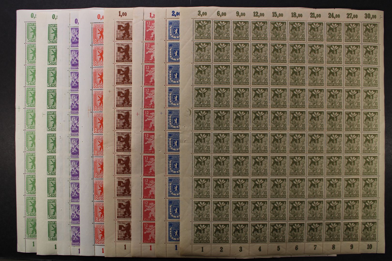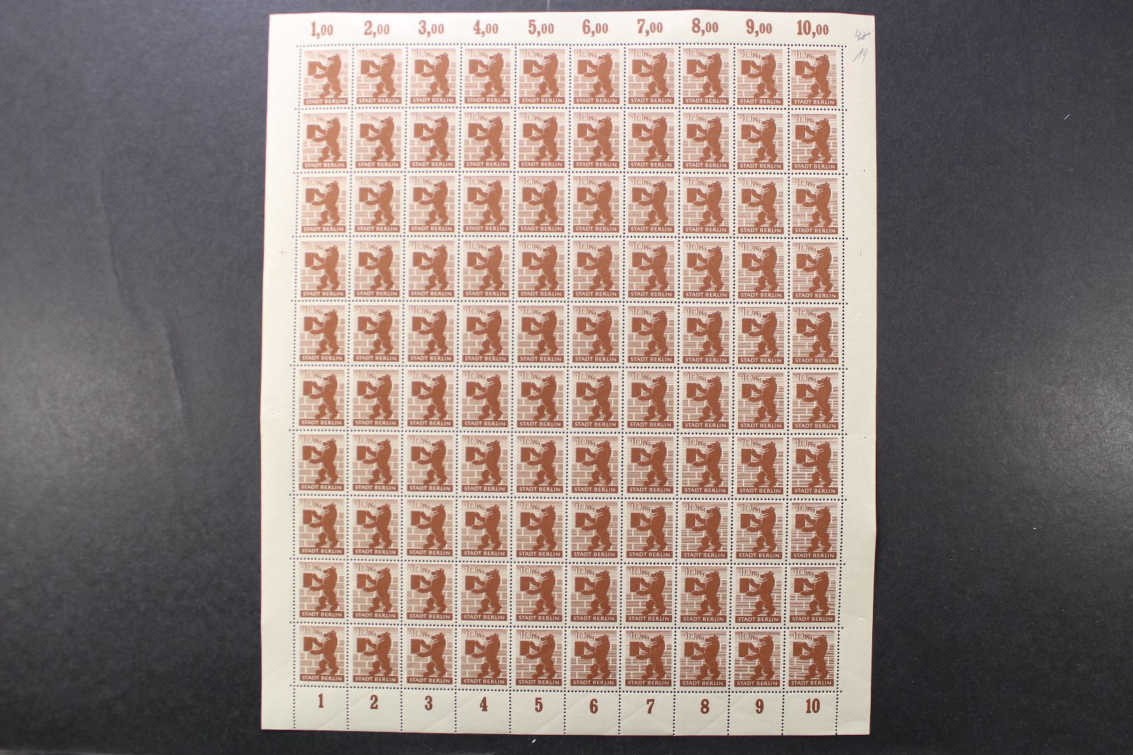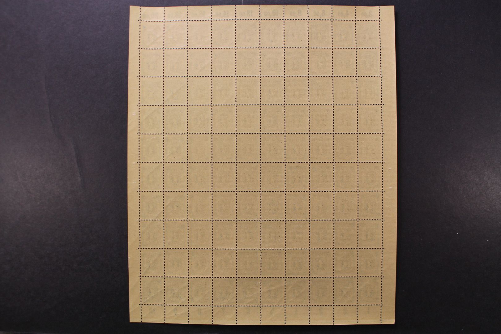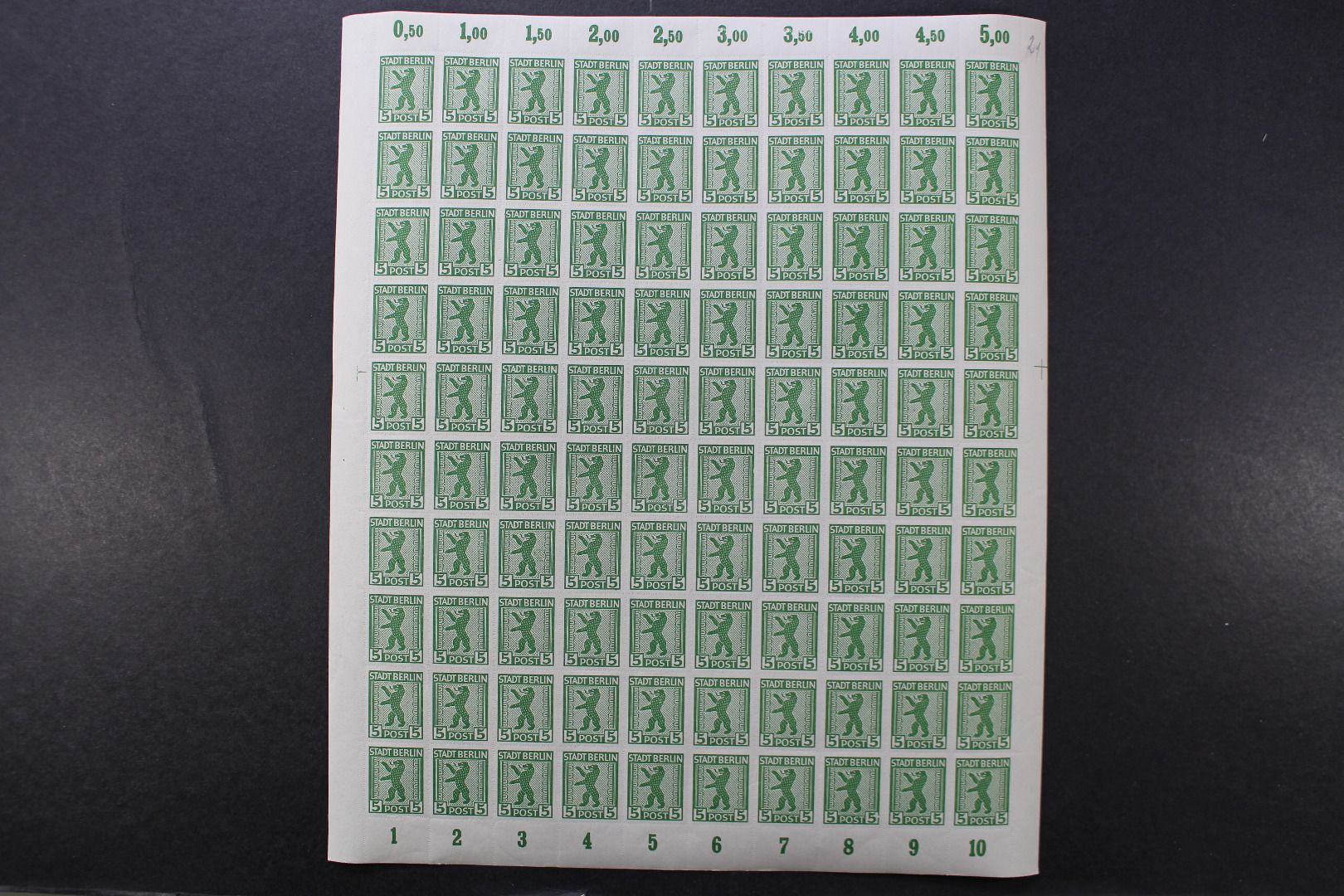 Freimarken 1945, 8 komplett erhaltene Bögen in überwiegend sehr guter Qualität. Lediglich die Nr. 1 B hat über den ganzen Bogen einen verlaufenen Gummi und die Nr. 6 A weist im unteren Bereich leichte Gummianhaftungen auf. Teils sind die Ränder leicht angetrennt. Übliche Büge. Bei einer schnellen Durchsicht haben wir bereits viele Plattenfehler gesehen. Sicher eine tolle Fundgrube für den Spezialisten.