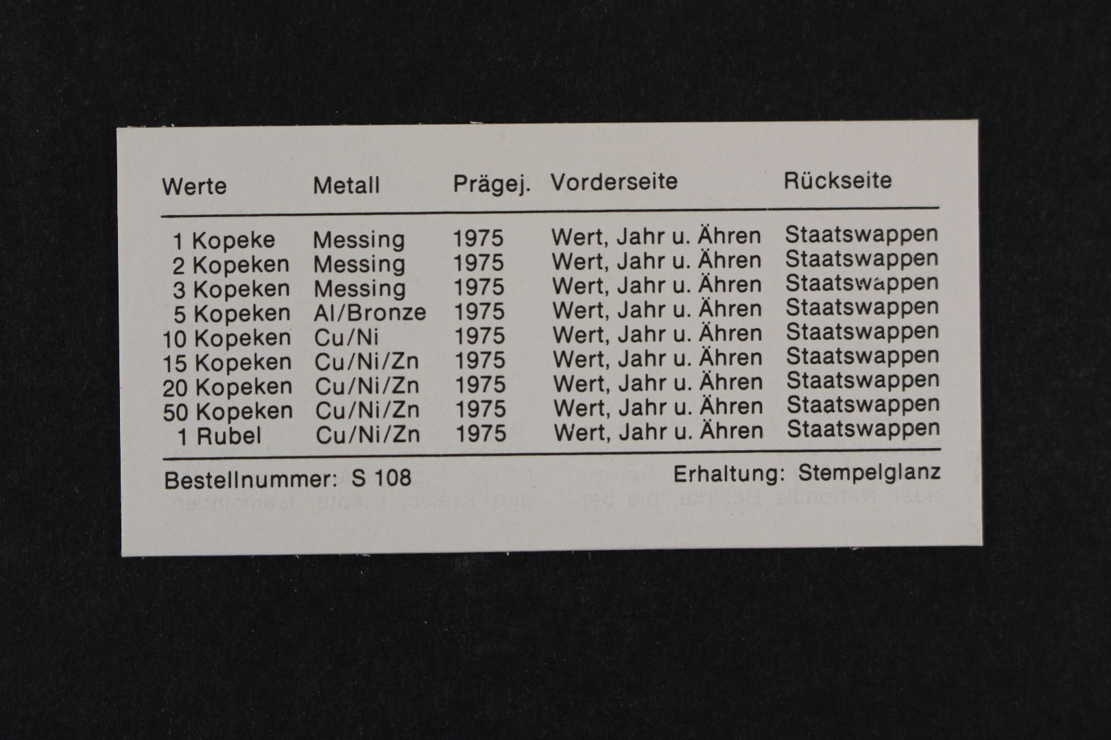 1 Kopeke bis 1 Rubel + Leningrad Plakette. Die Hartplastikverpackung ist einwandfrei, einige Münzen sind angelaufen.