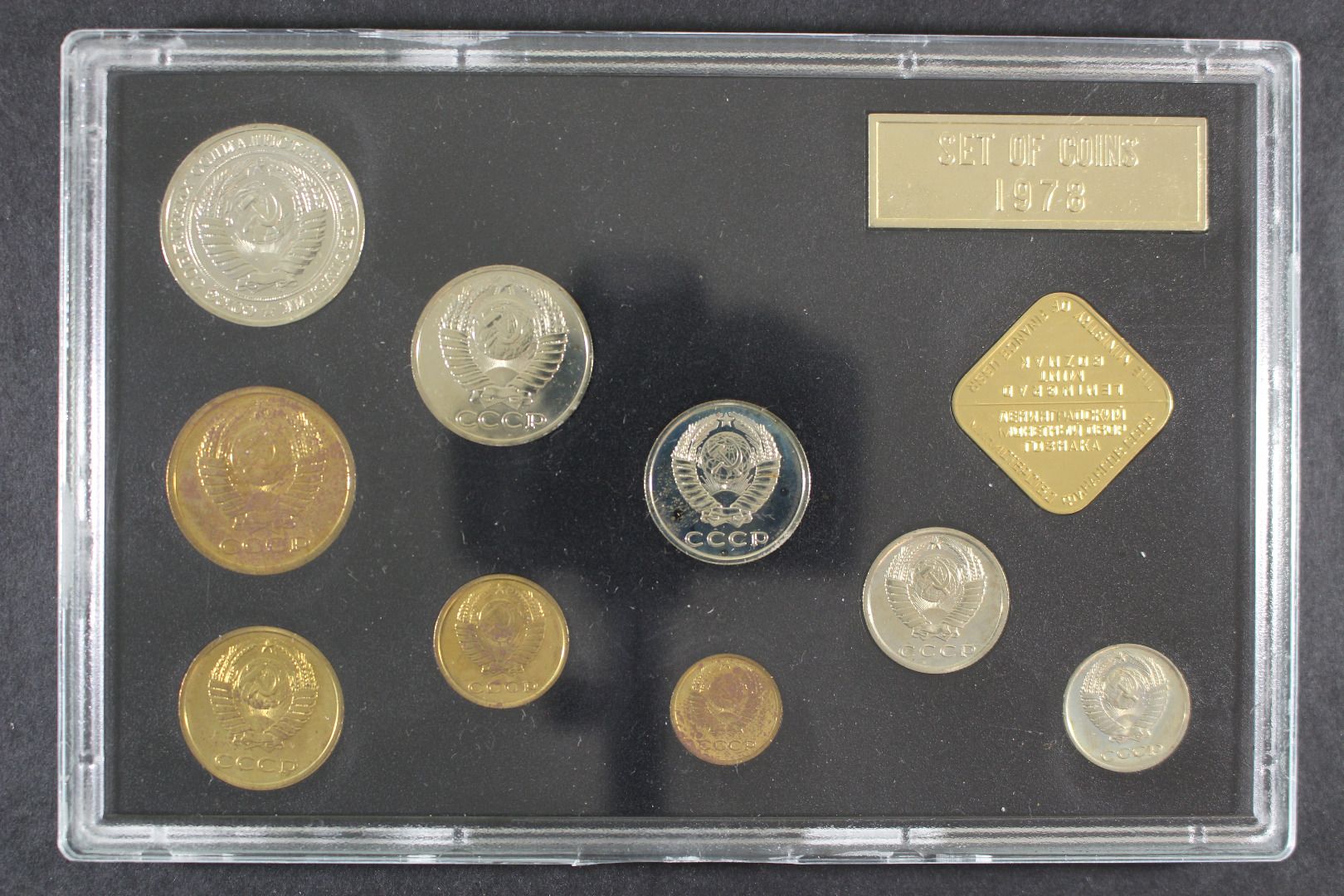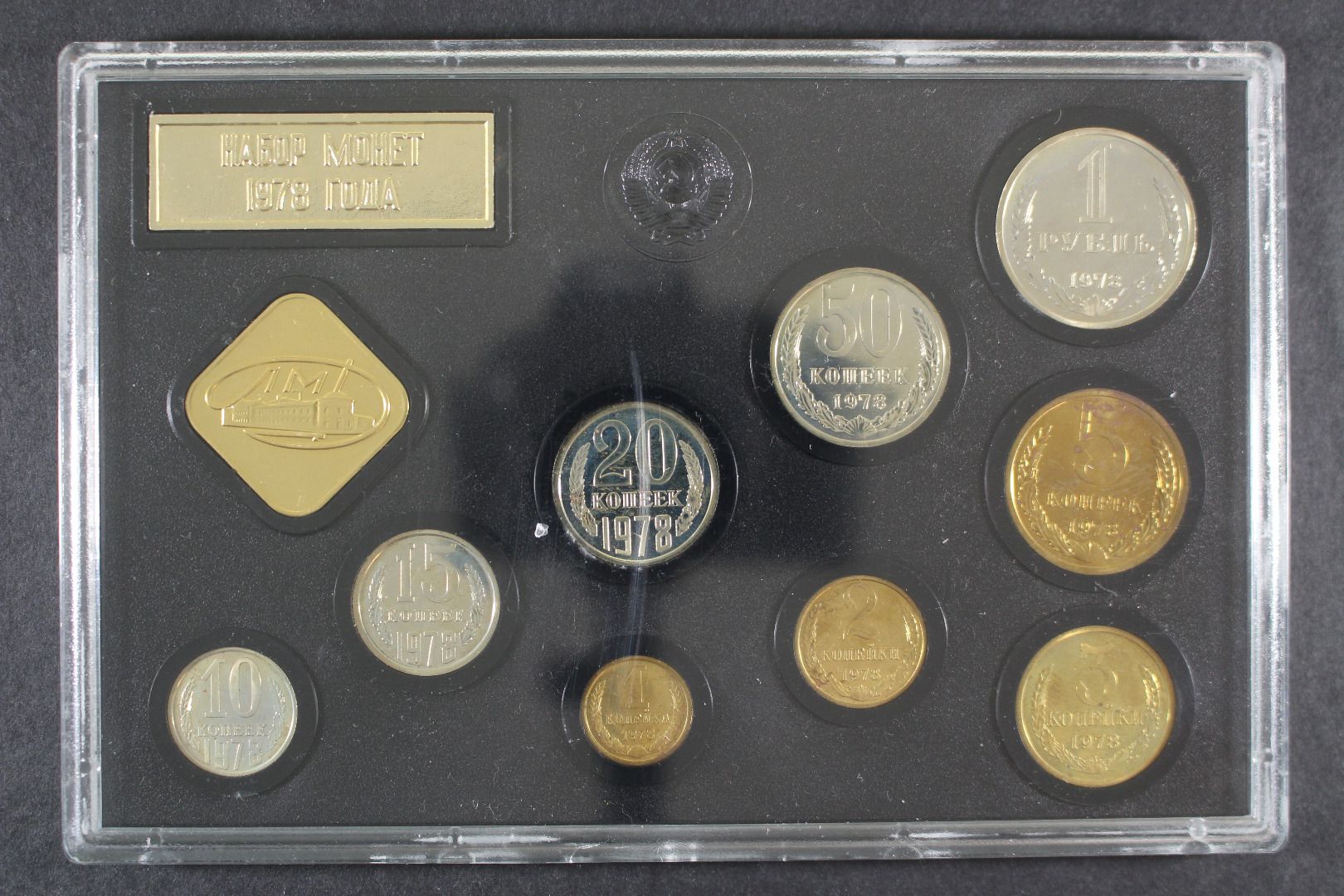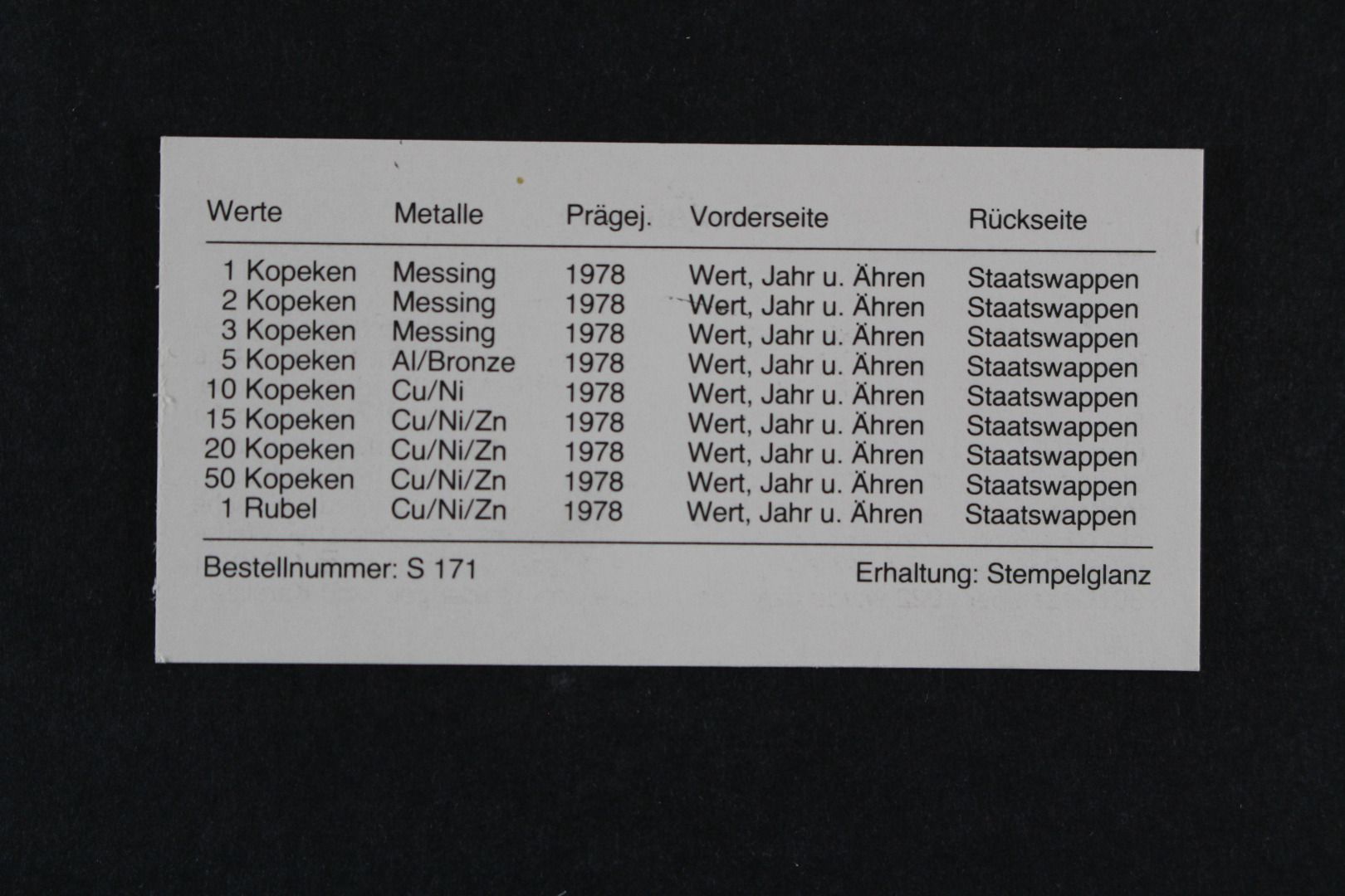 1 Kopeke bis 1 Rubel + Leningrad Plakette. Die Hartplastikverpackung ist einwandfrei, einige Münzen sind angelaufen.