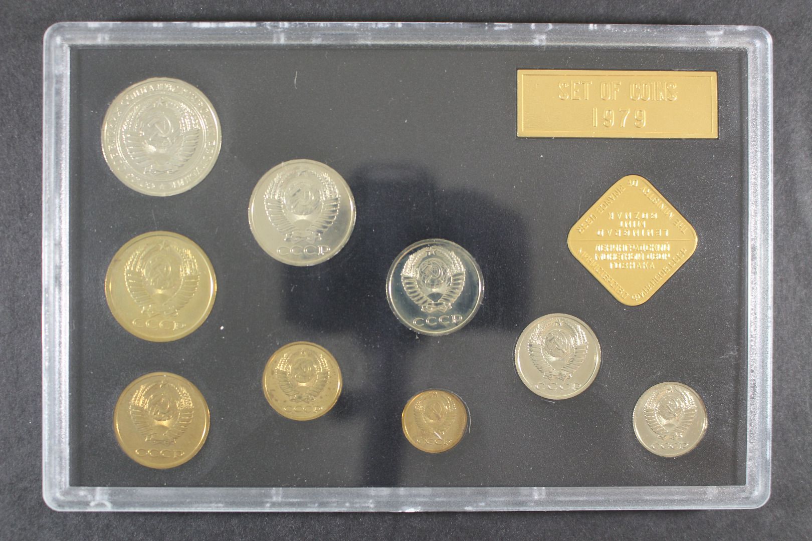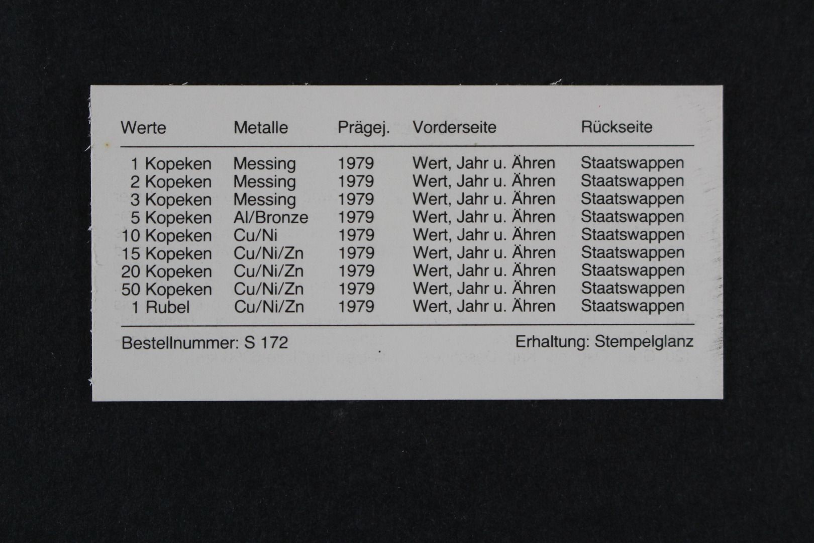 1 Kopeke bis 1 Rubel + Leningrad Plakette. Die Hartplastikverpackung ist einwandfrei, einige Münzen sind angelaufen.
