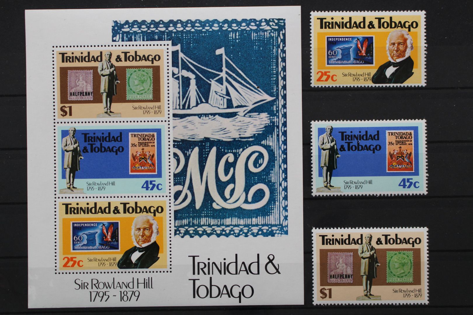 Rowland Hill, 3 Werte und 1 Block.