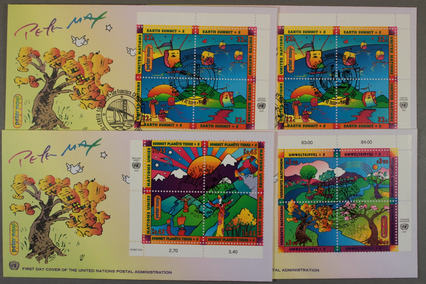 5. Jahrestag UNCED, NY 2 x 736-739, Genf 309-312, Wien 223-229, vier UNPA-Ersttagsbriefe.
