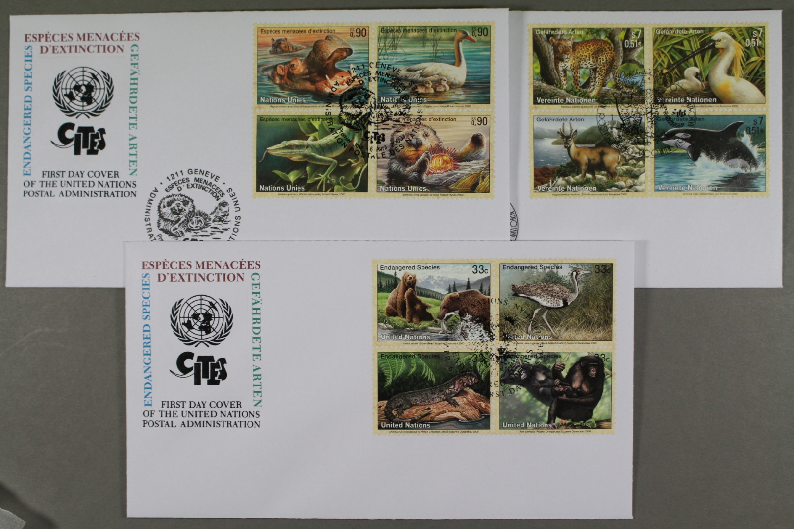 Gefährdete Arten: Fauna, NY 831-834, Genf 385-388, Wien 303-306, drei UNPA-Ersttagsbriefe.