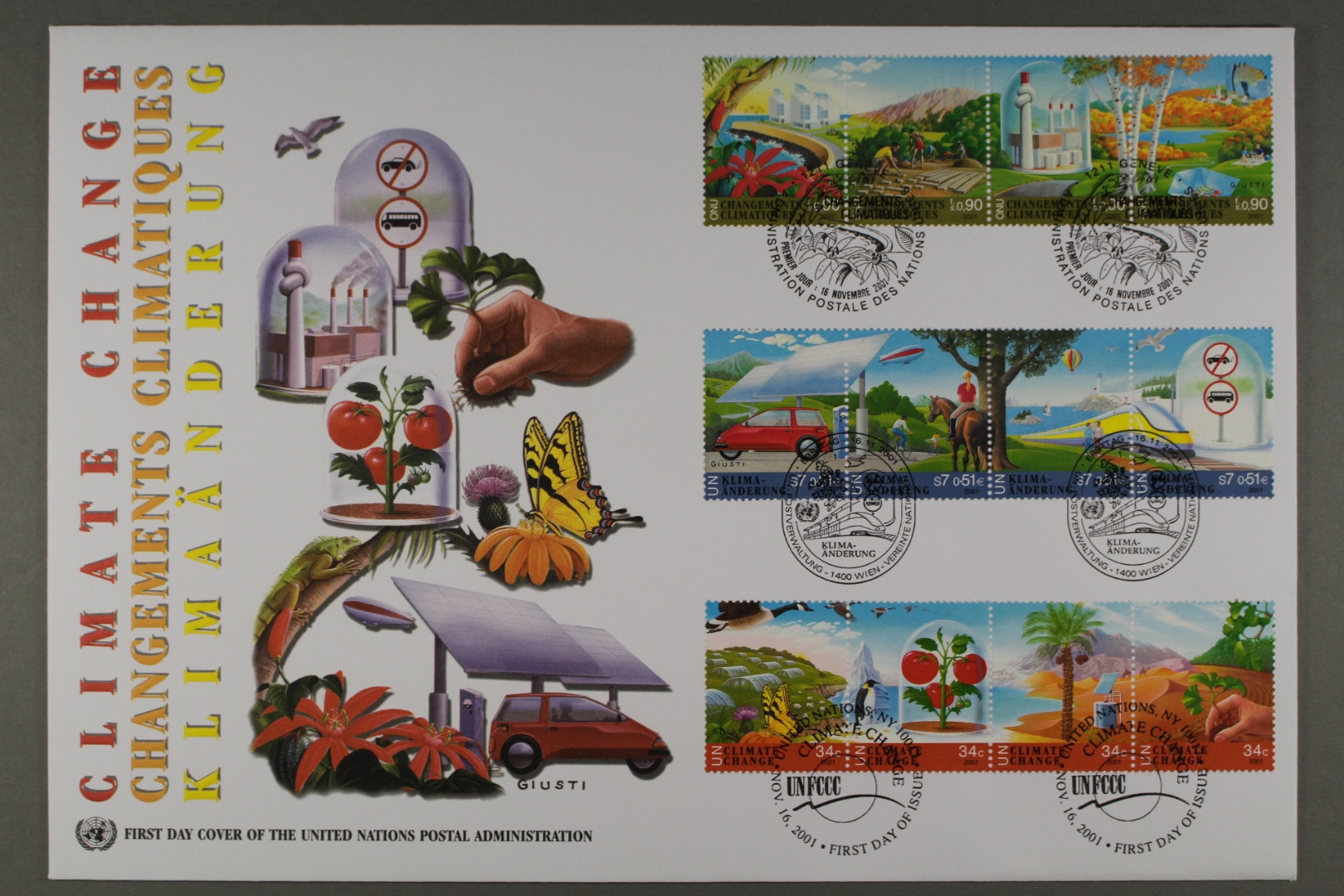 Klimaänderung, Gemeinschaftsausgabe, New York 884-887, Genf 428-431, Wien 346-349, mit je ein Viererstreifen, UNPA - FDC.