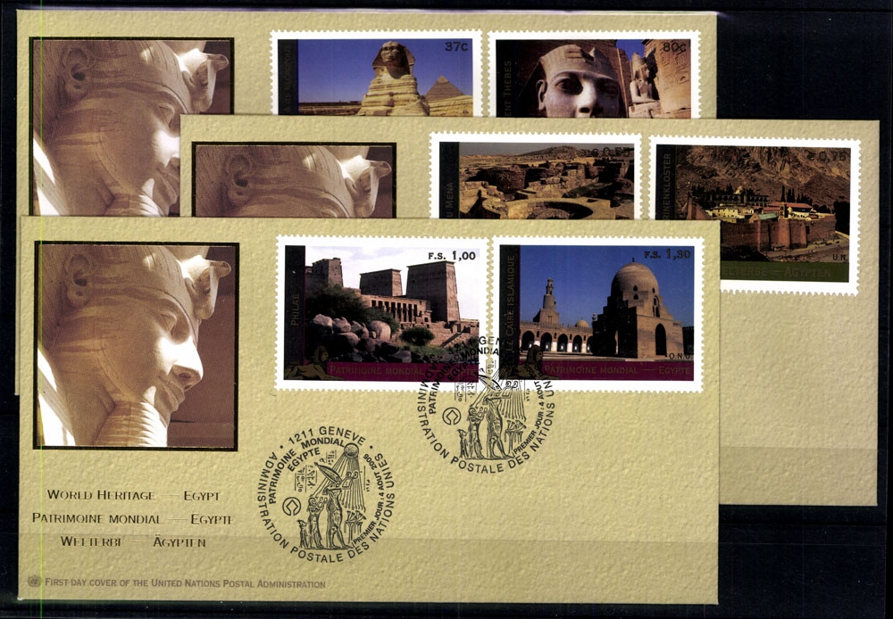 UNESCO: Ägypten, Gemeinschaftsausgabe, Wien 443-444, Genf 518-519, NY 986-987, 3 UNPA Ersttagsbriefe.