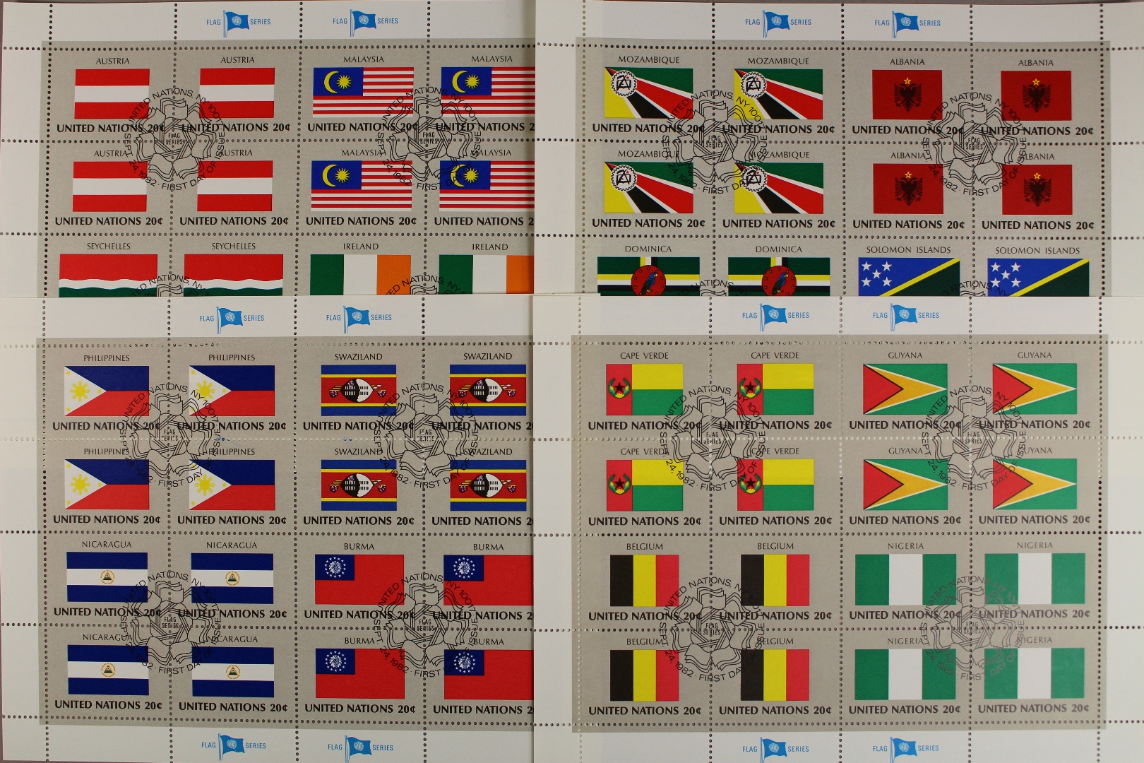 Flaggen der UNO 1982, 4 Kleinbögen, Ersttagssonderstempel.