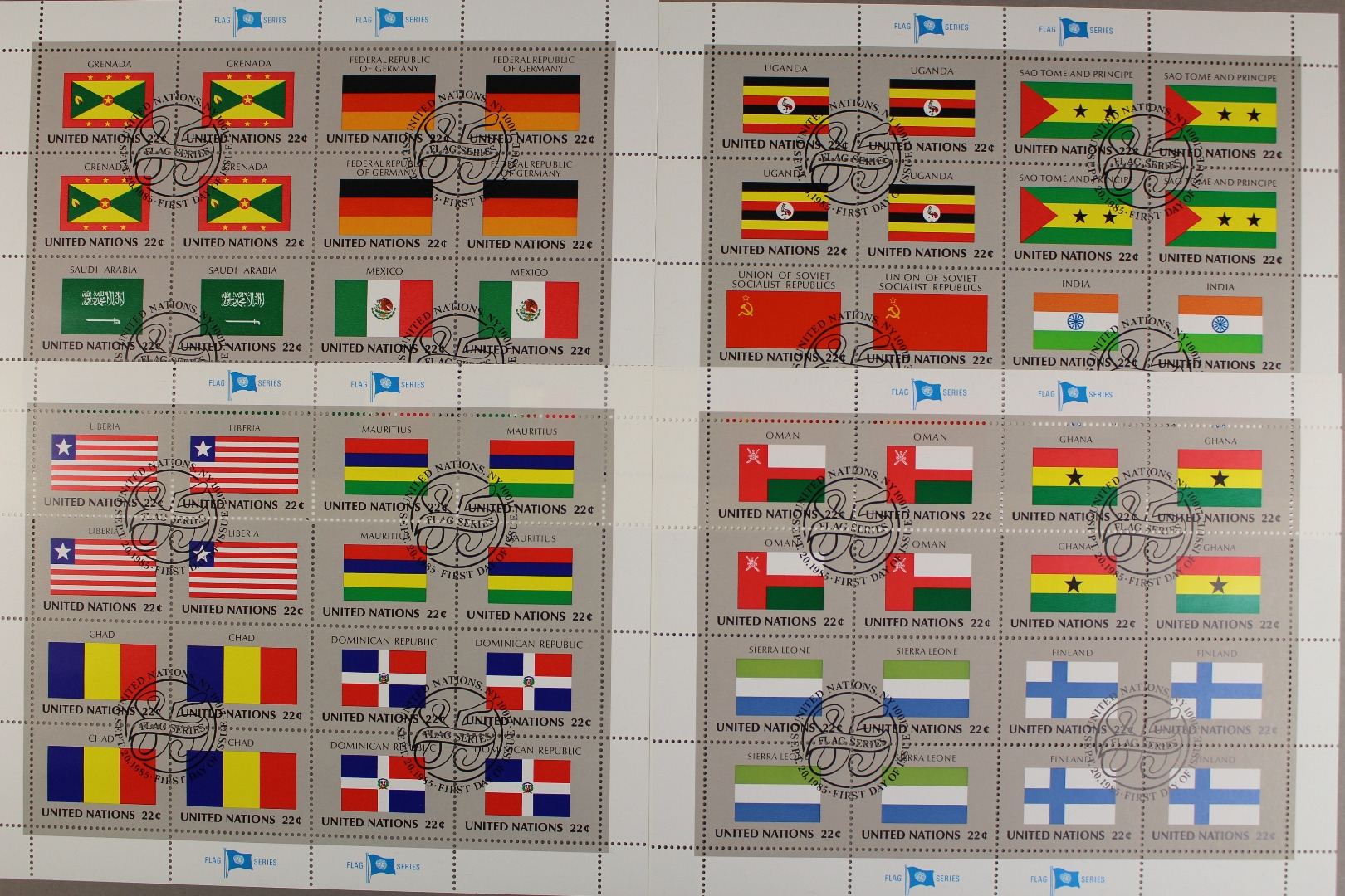 Flaggen der UNO 1985, 4 Kleinbögen, Ersttagssonderstempel.