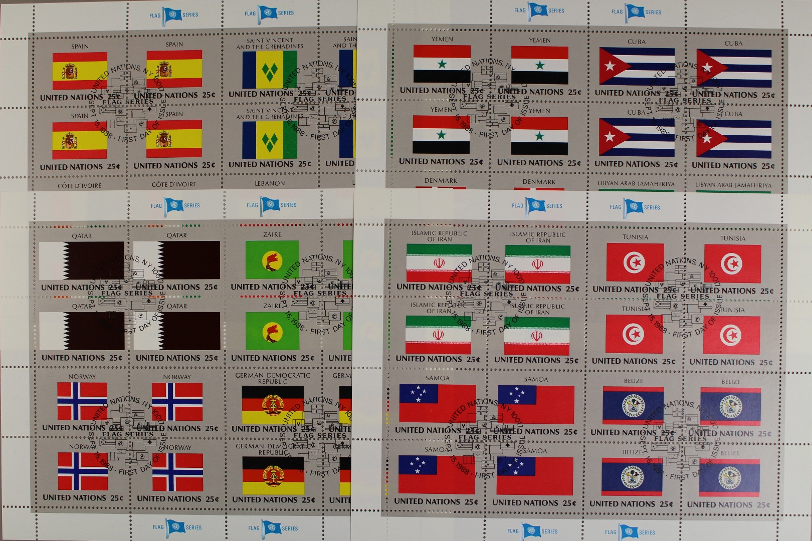 Flaggen der UNO 1988, 4 Kleinbögen, Ersttagssonderstempel.