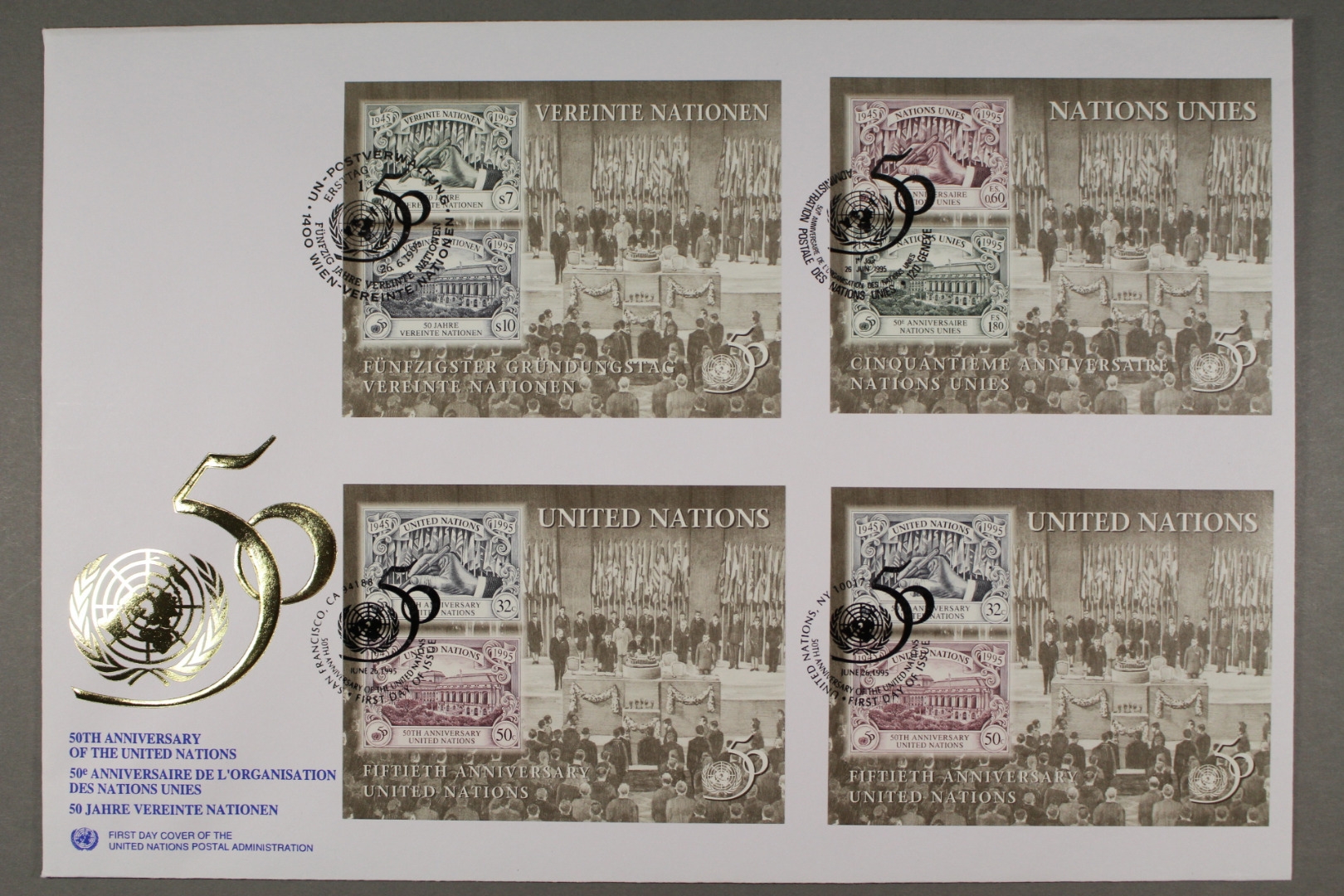 50 Jahre UNO, NY zweimal Block 12, Genf Block 7, Wien Block 6, UNPA-Ersttagsbrief.